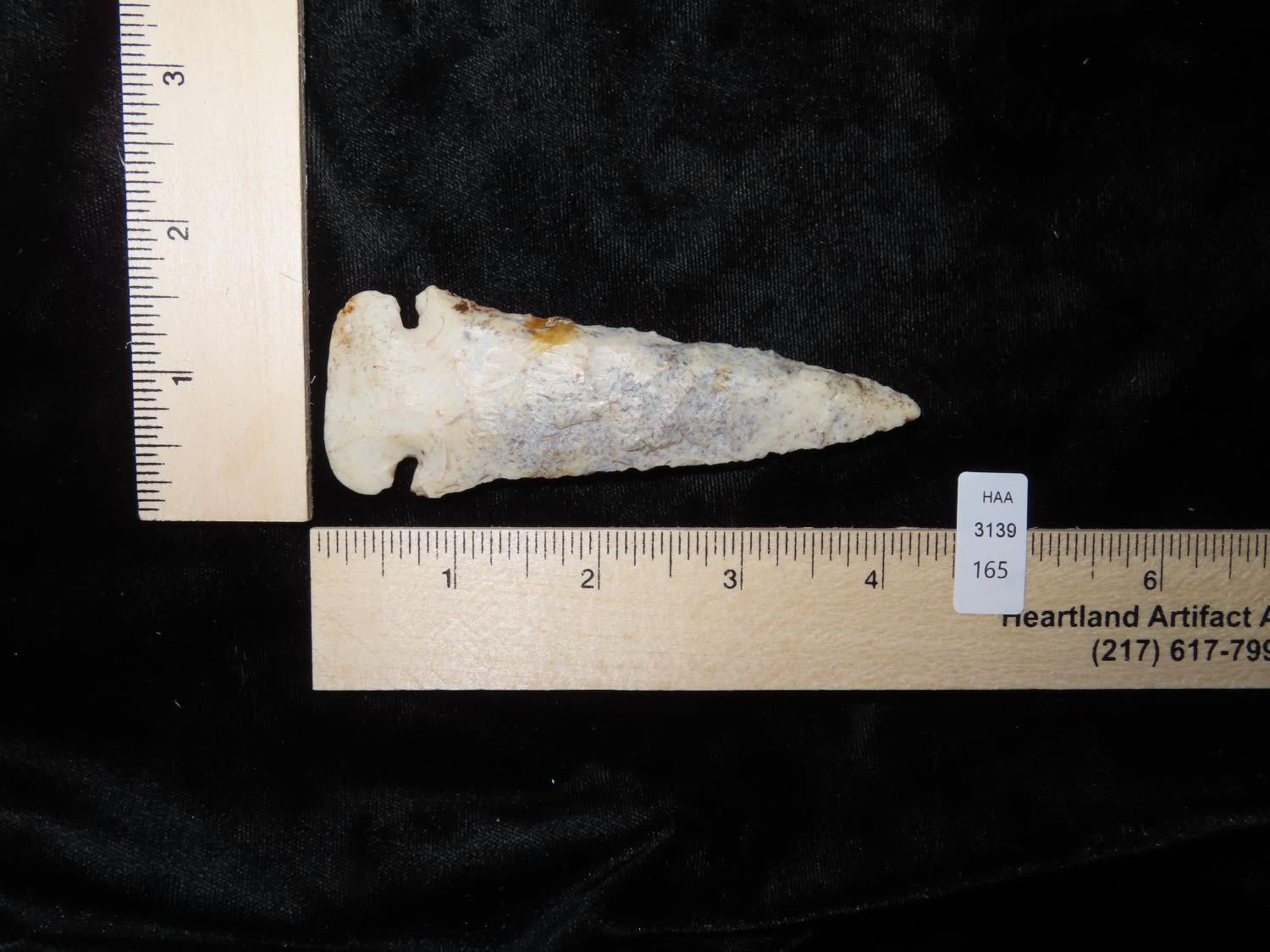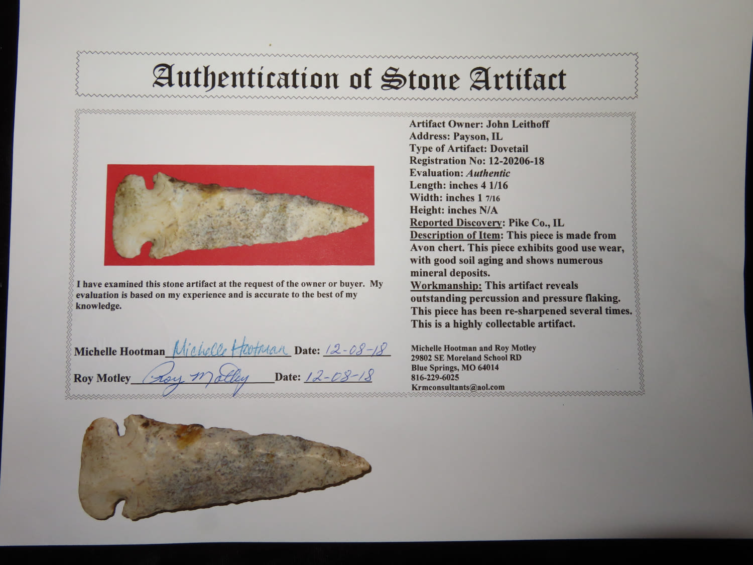4 1/16″ Dovetail. Pike CO., Illinois. Avon Chert. COA: Roy Motley. Collection of John Leithoff from Payson, Illinois