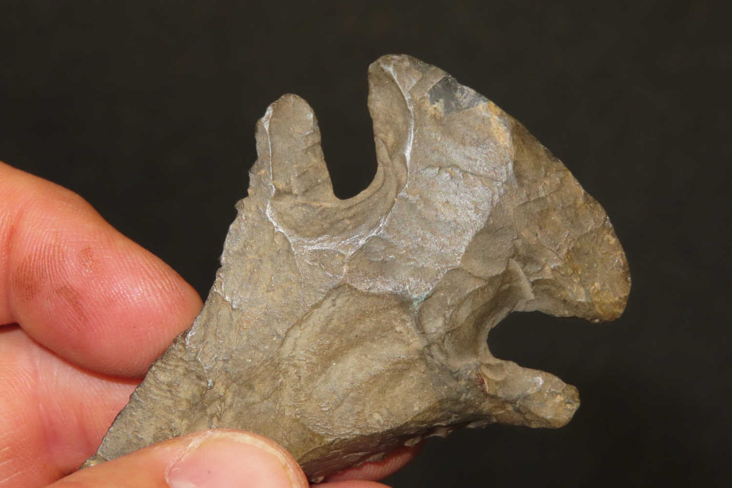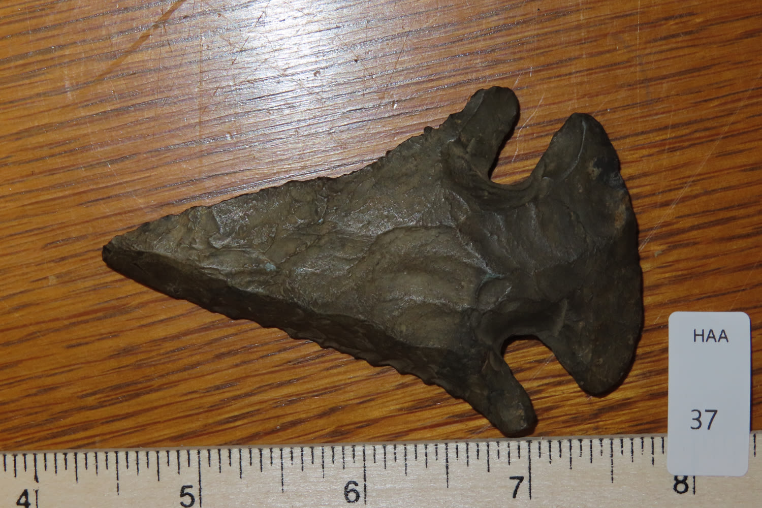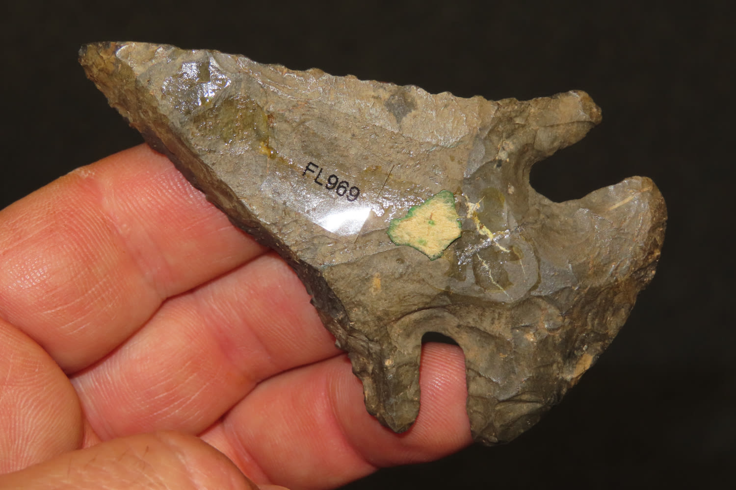 3 1/4″ Heavily Beveled Thebes. Heavily Patenated Dark Colored Chert. Plow damaged to one edge. from a private collection out of St. Louis, Missouri