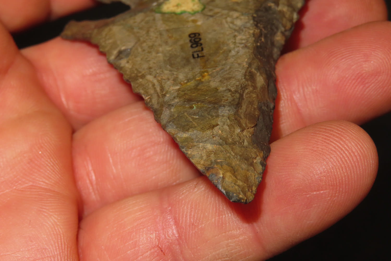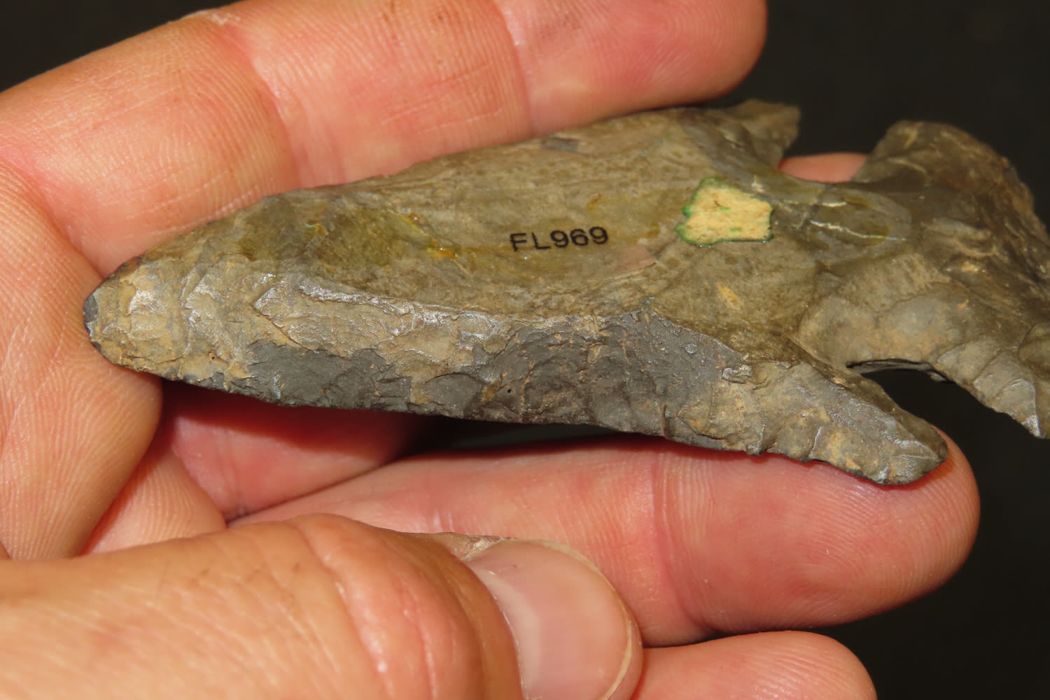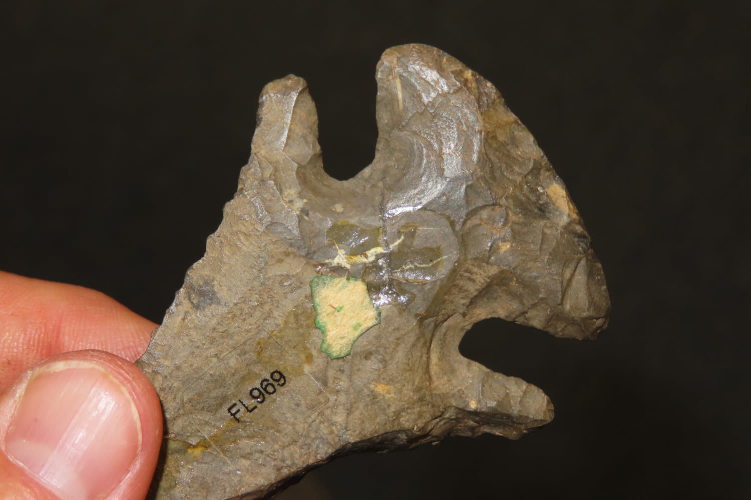 3 1/4″ Heavily Beveled Thebes. Heavily Patenated Dark Colored Chert. Plow damaged to one edge. from a private collection out of St. Louis, Missouri