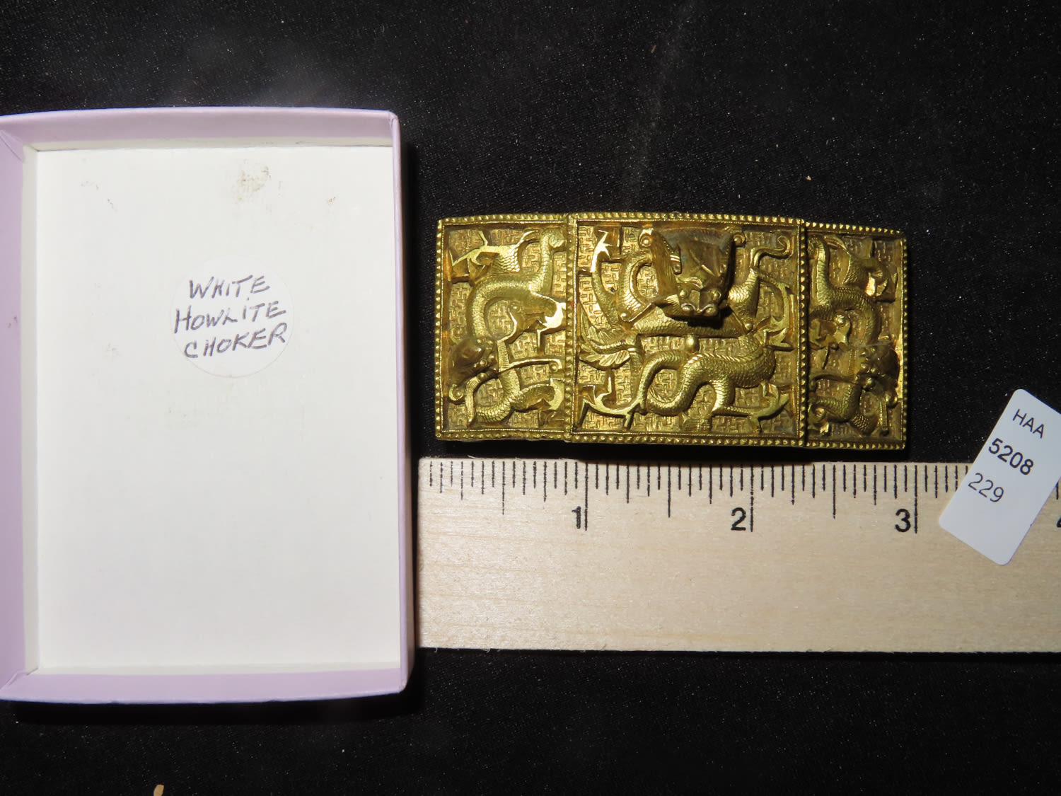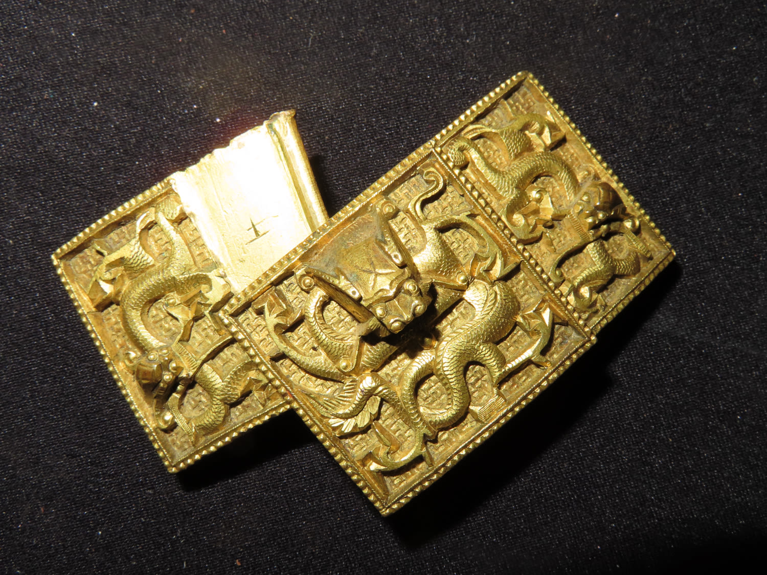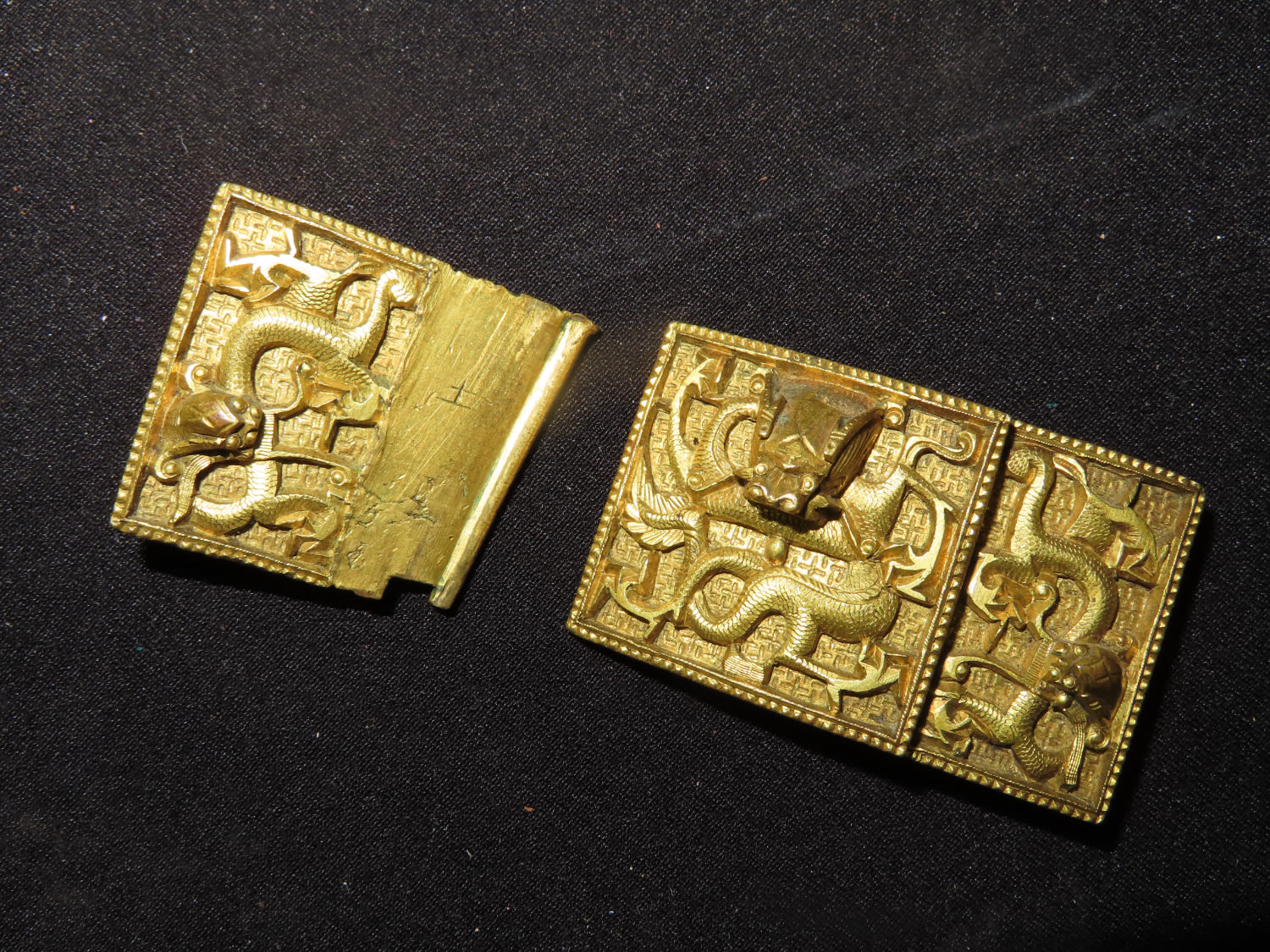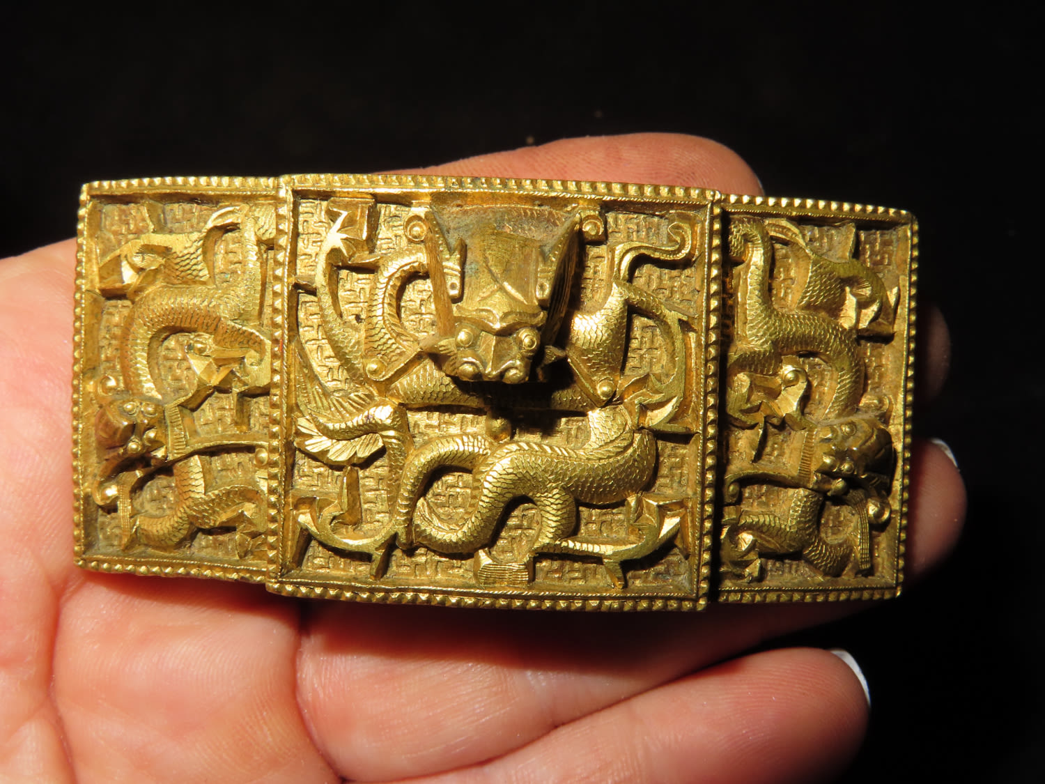 Chinese gilt bronze dragon belt buckle, Mid-Qing dynasty, decorated with one front-facing dragon on center accompanied by two flank-facing dragons on each side, 2 3/4 " w.