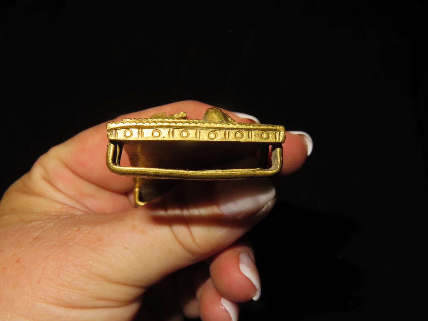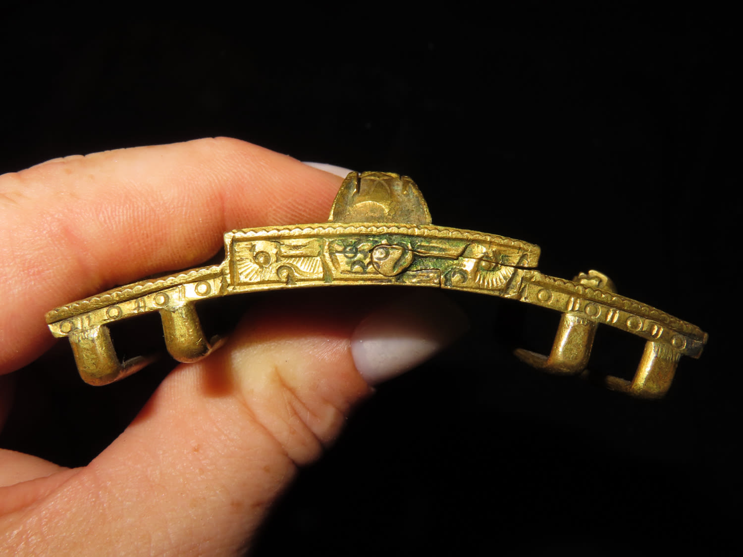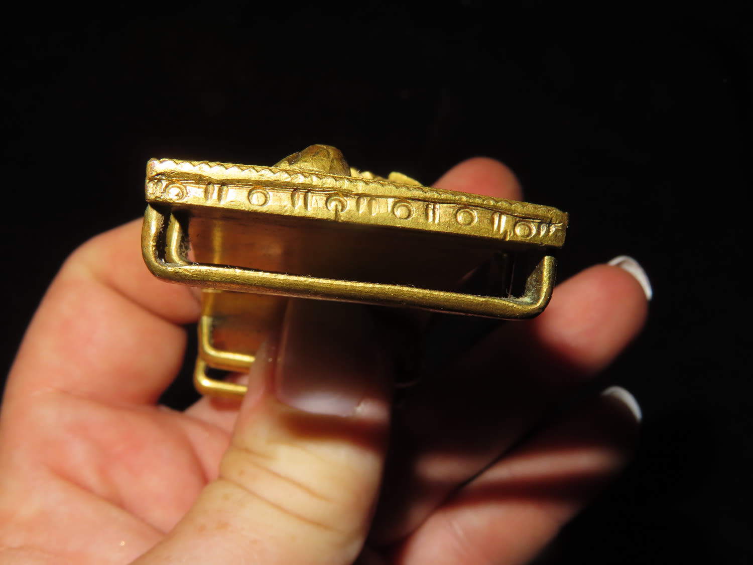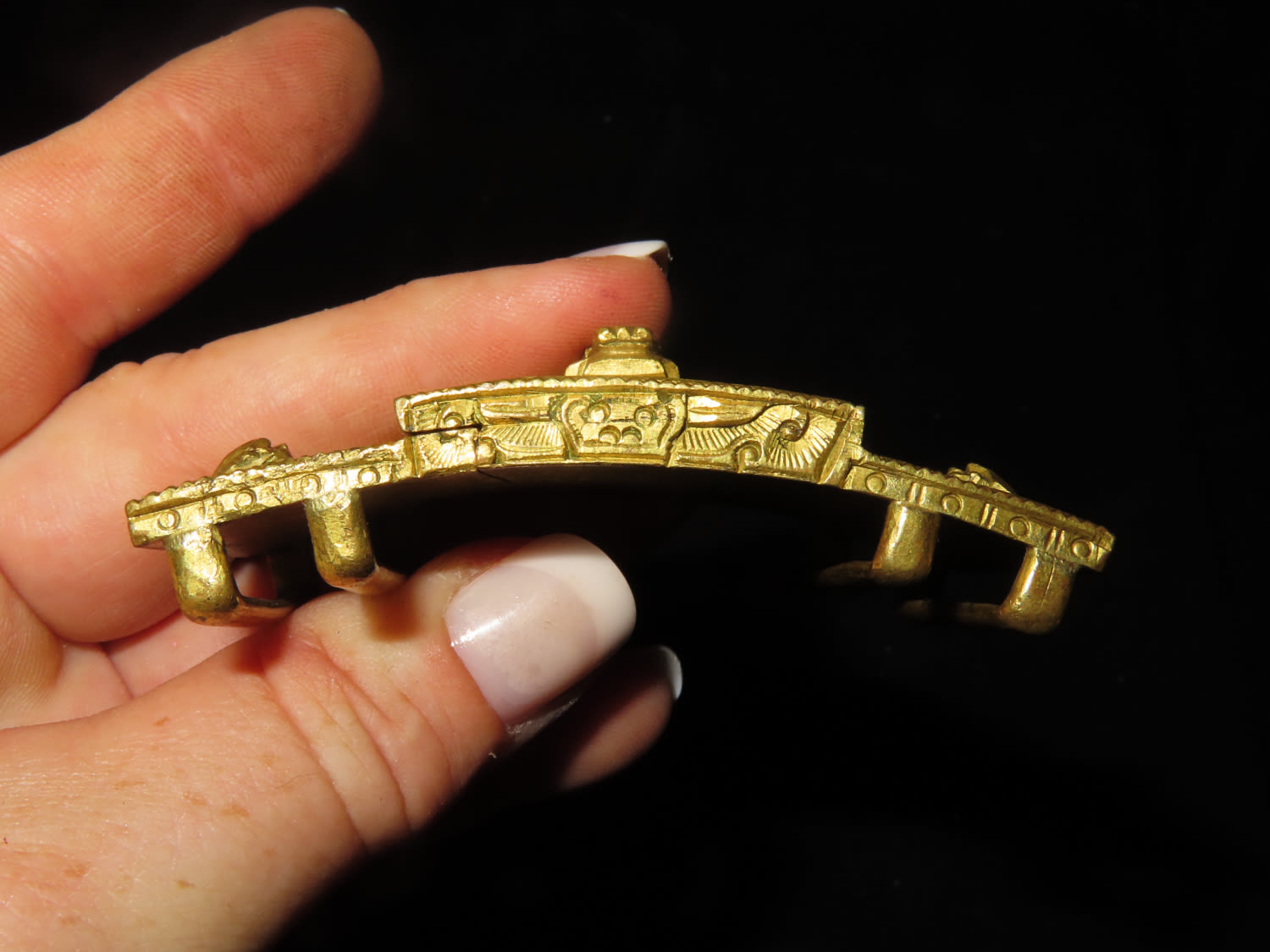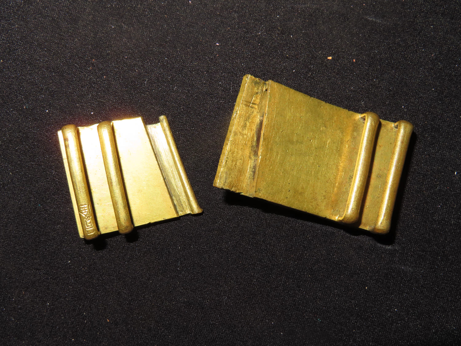 Chinese gilt bronze dragon belt buckle, Mid-Qing dynasty, decorated with one front-facing dragon on center accompanied by two flank-facing dragons on each side, 2 3/4 " w.