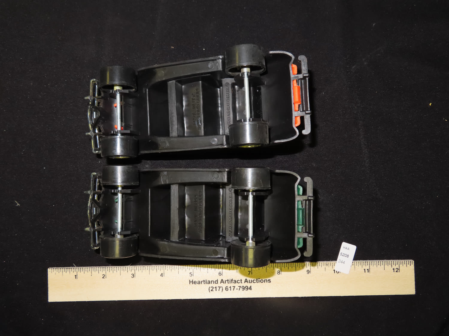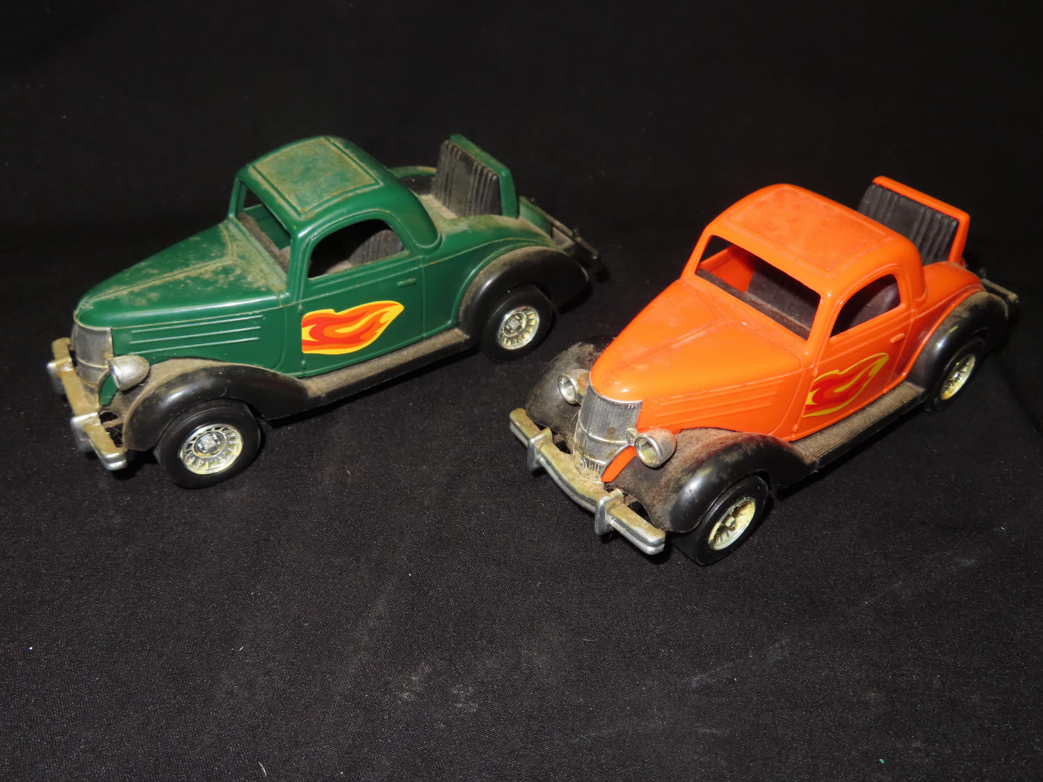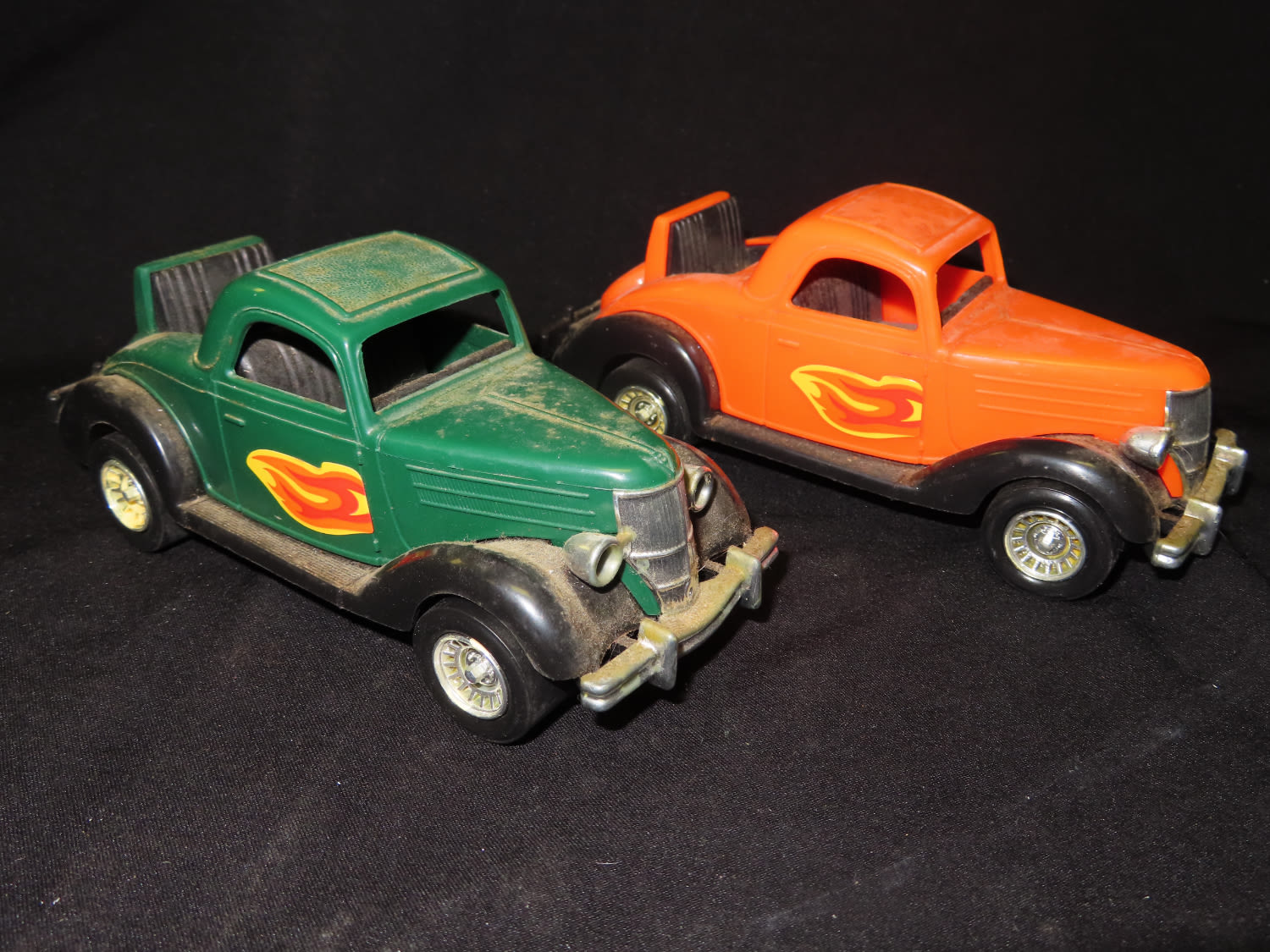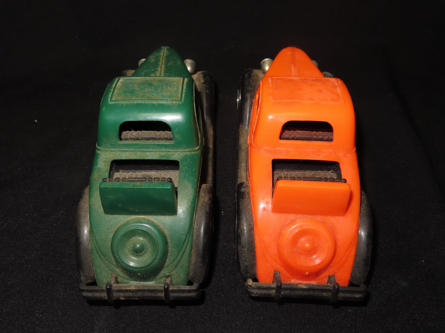 Made in the USA toy cars. Orange and Green 1936 Ford Coupes STROMBECKER. From the Estate of Antoine and Sandra Clairmont