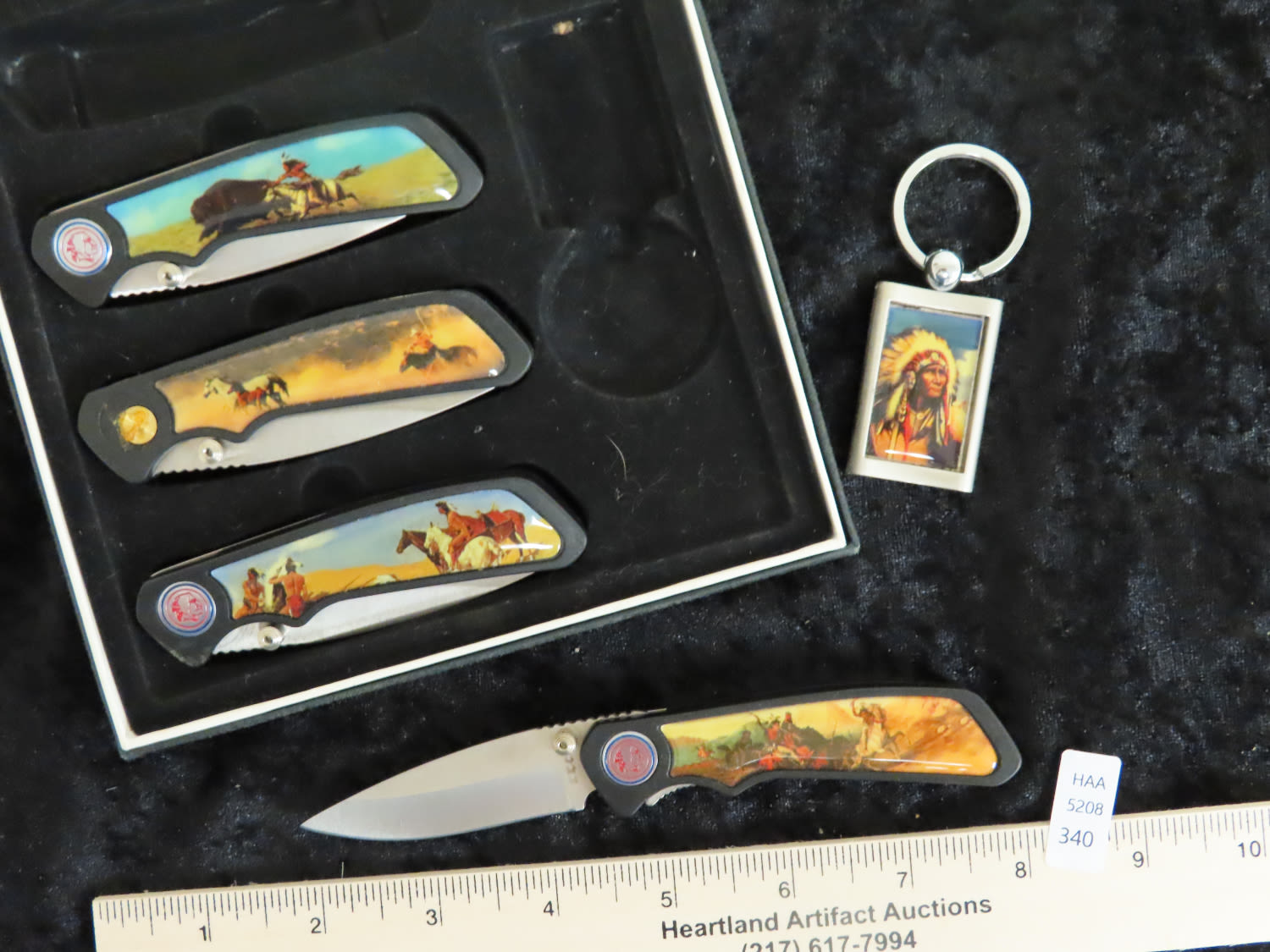 Set of Four Pocket Knives with Indians and a Keyring with an Indian. From the Estate of Antoine and Sandra Clairmont