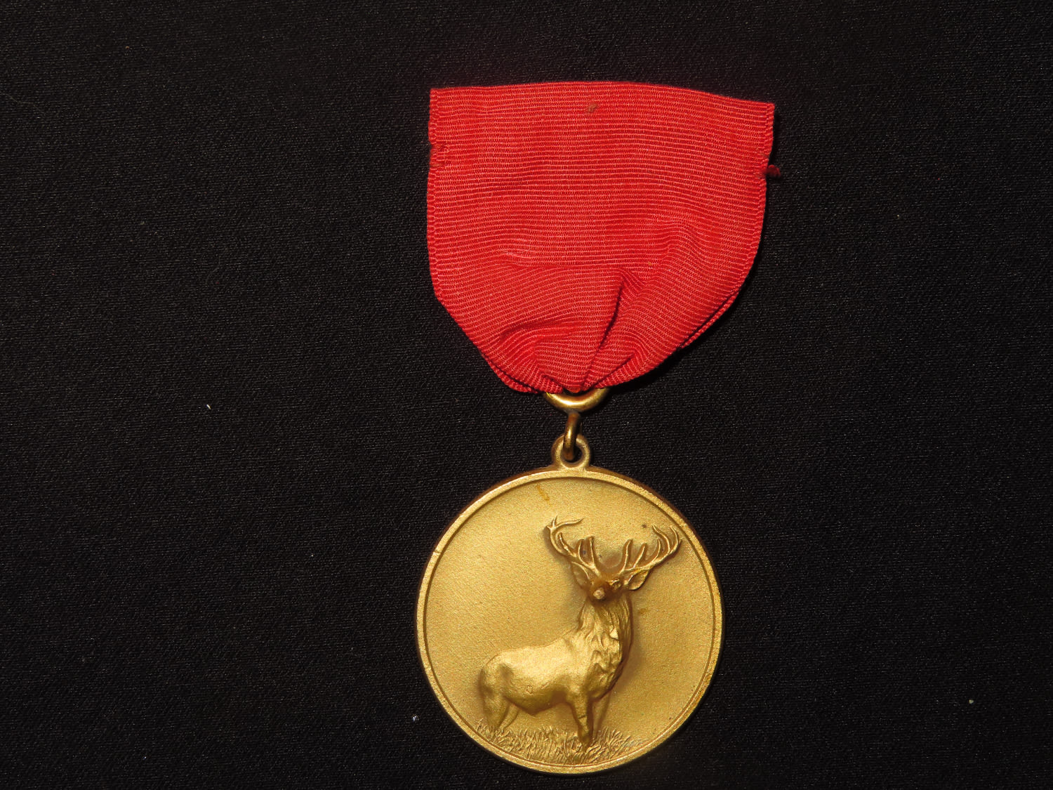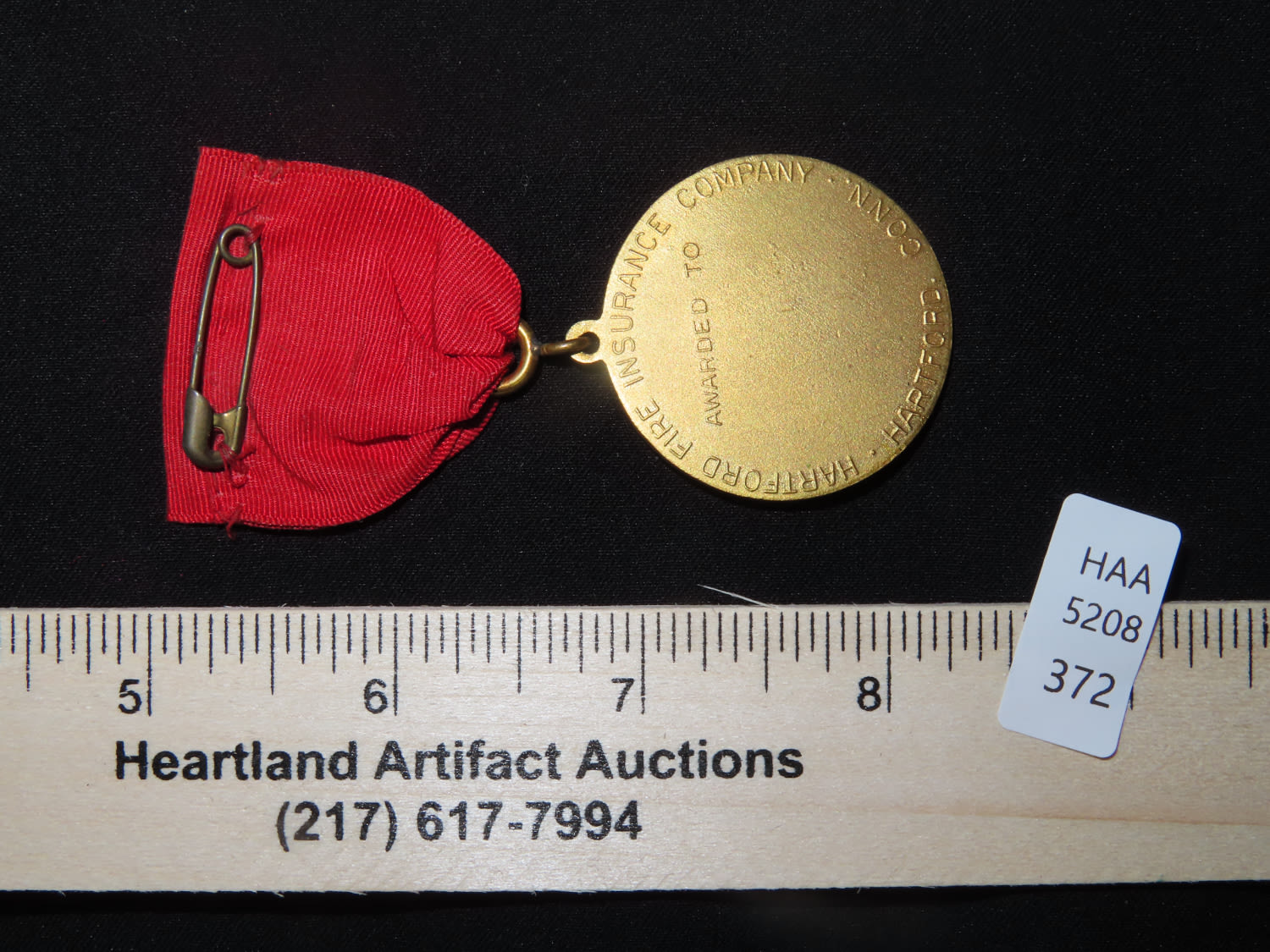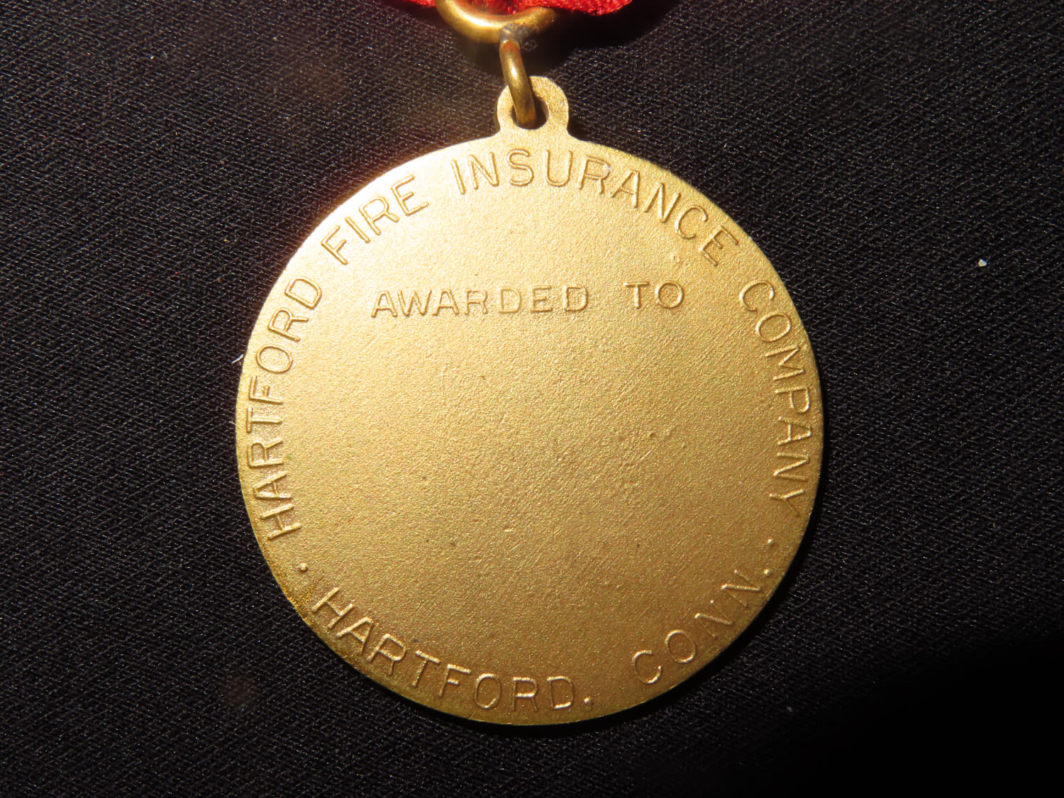 Gold toned Hartford Fire Insurance Company Medal Pin on Red Ribbon with Deer/Stag. From the Estate of Antoine and Sandra Clairmont