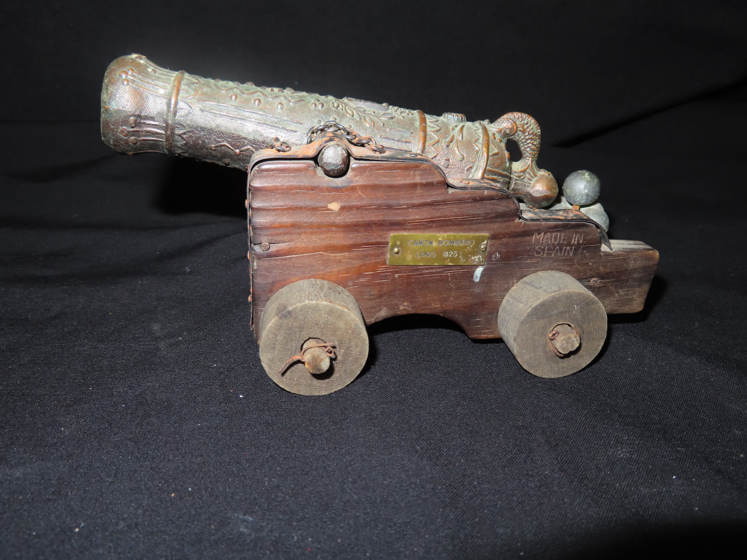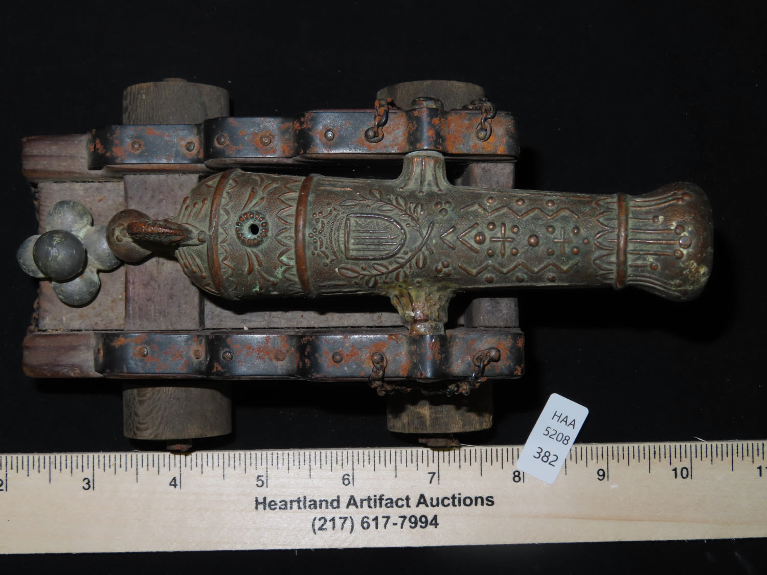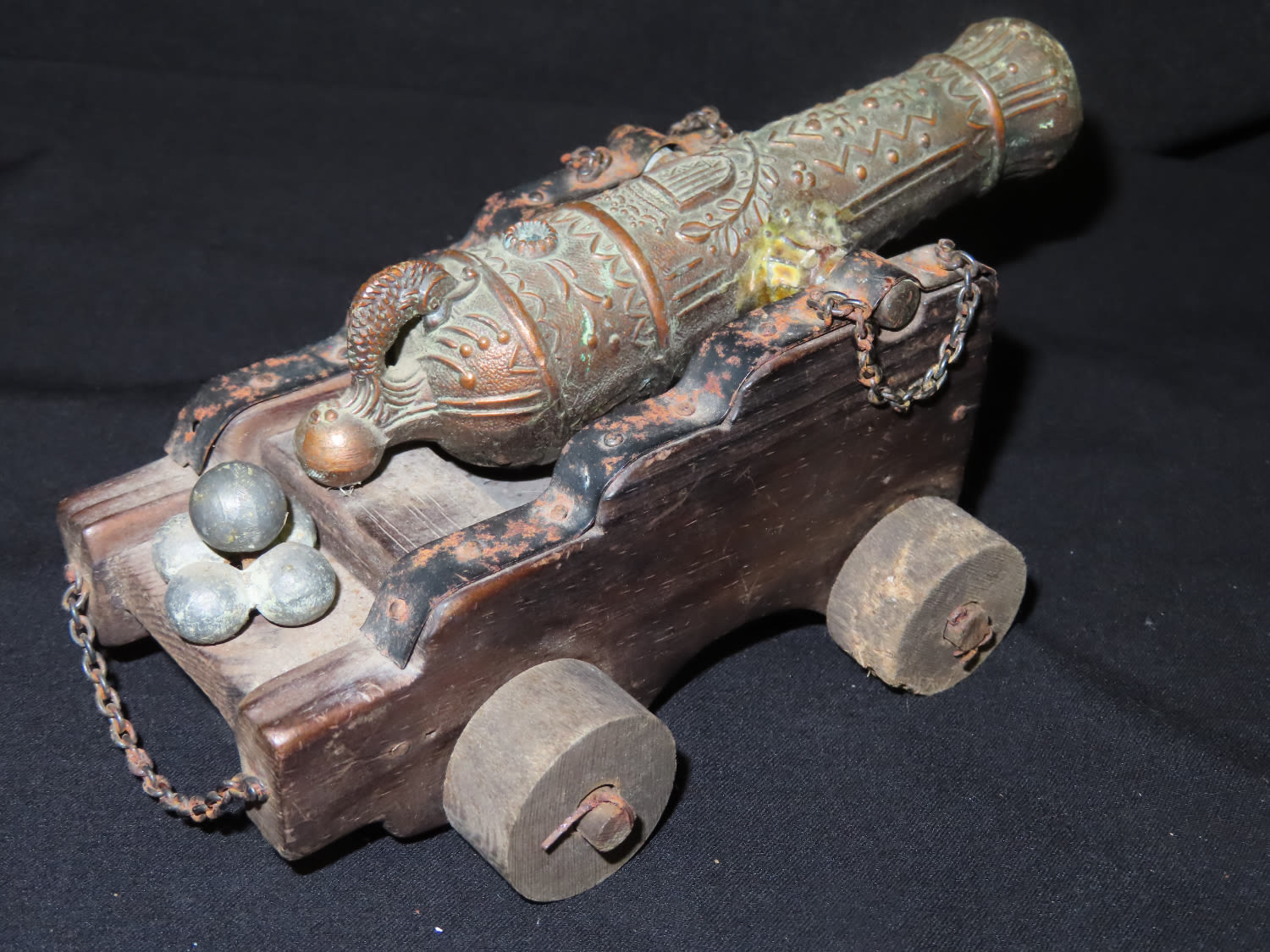 Ornate Detailed Brass Cannon on wooden stand. From the Estate of Antoine and Sandra Clairmont