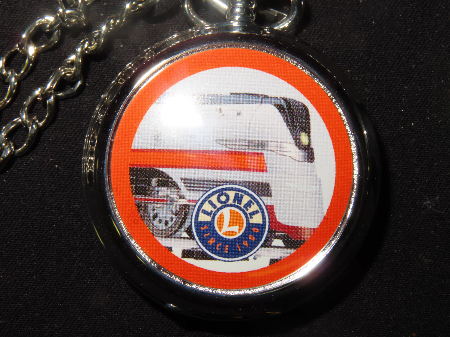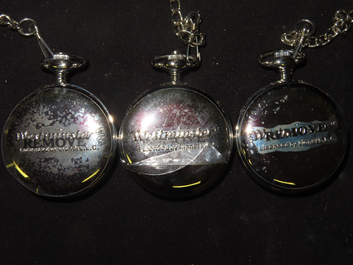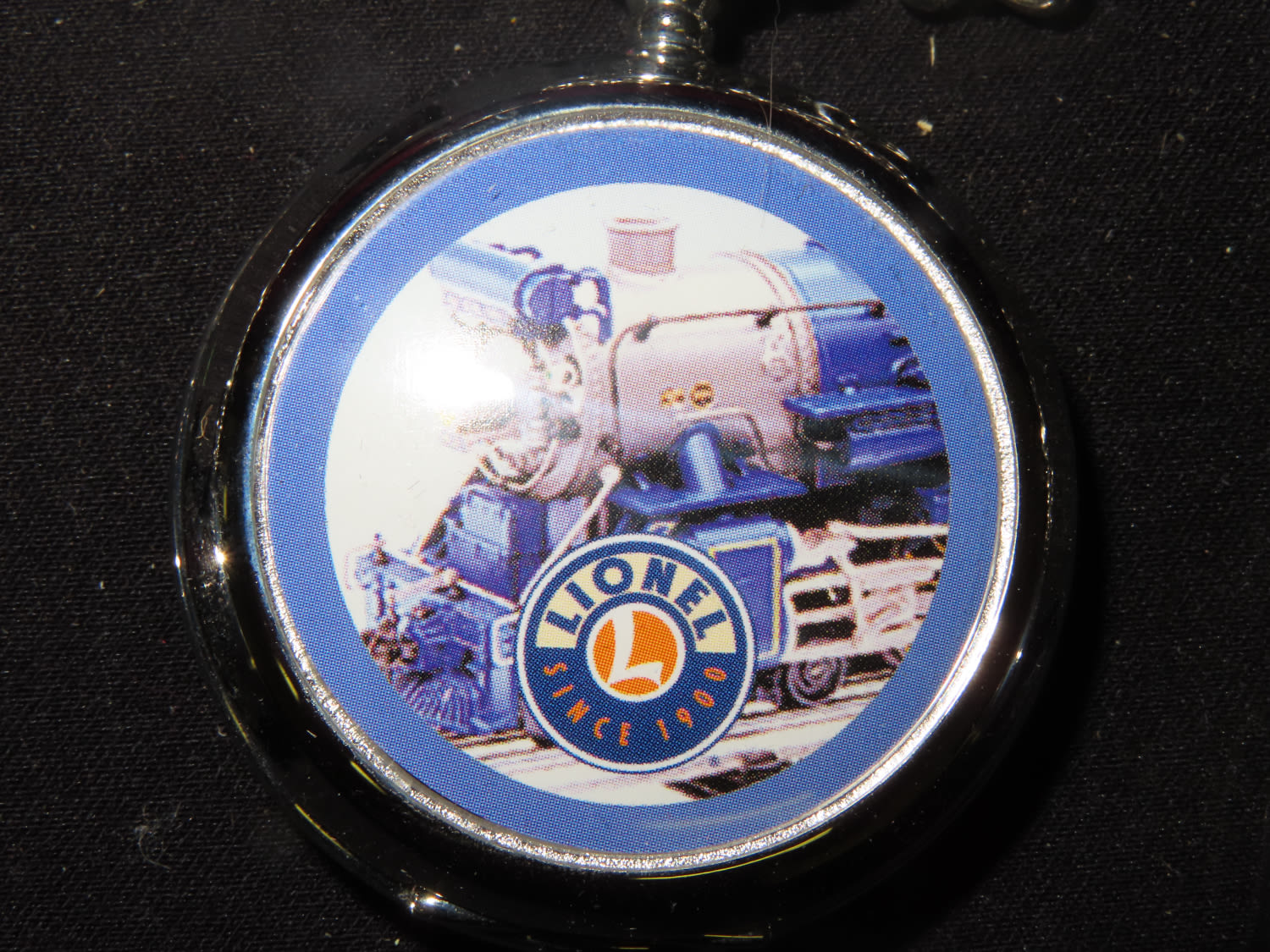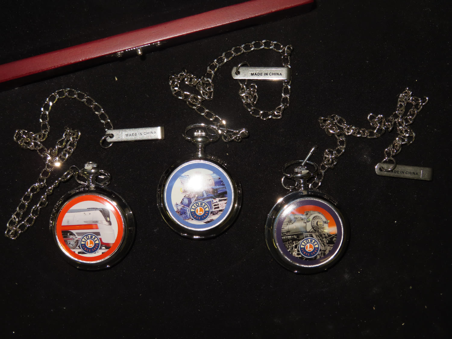 Wooden Box with Three Collective Lionel Train Pocket Watches. From the Estate of Antoine and Sandra Clairmont
