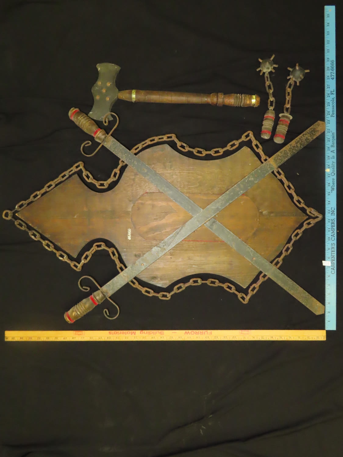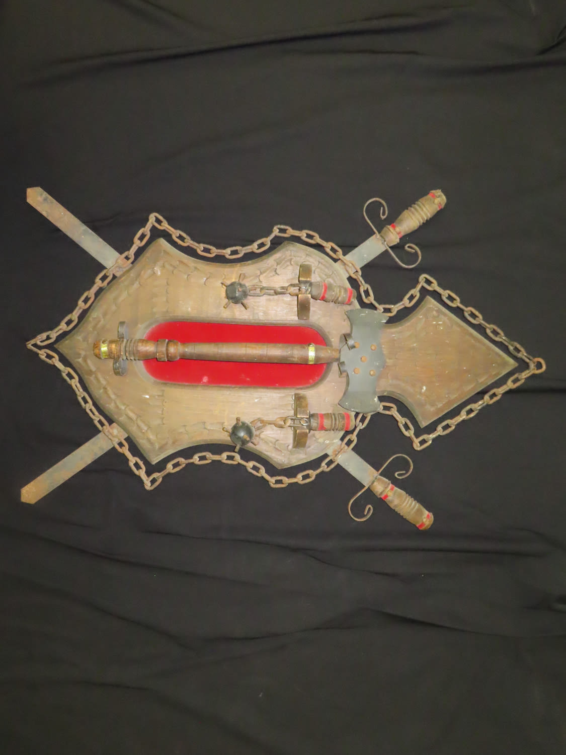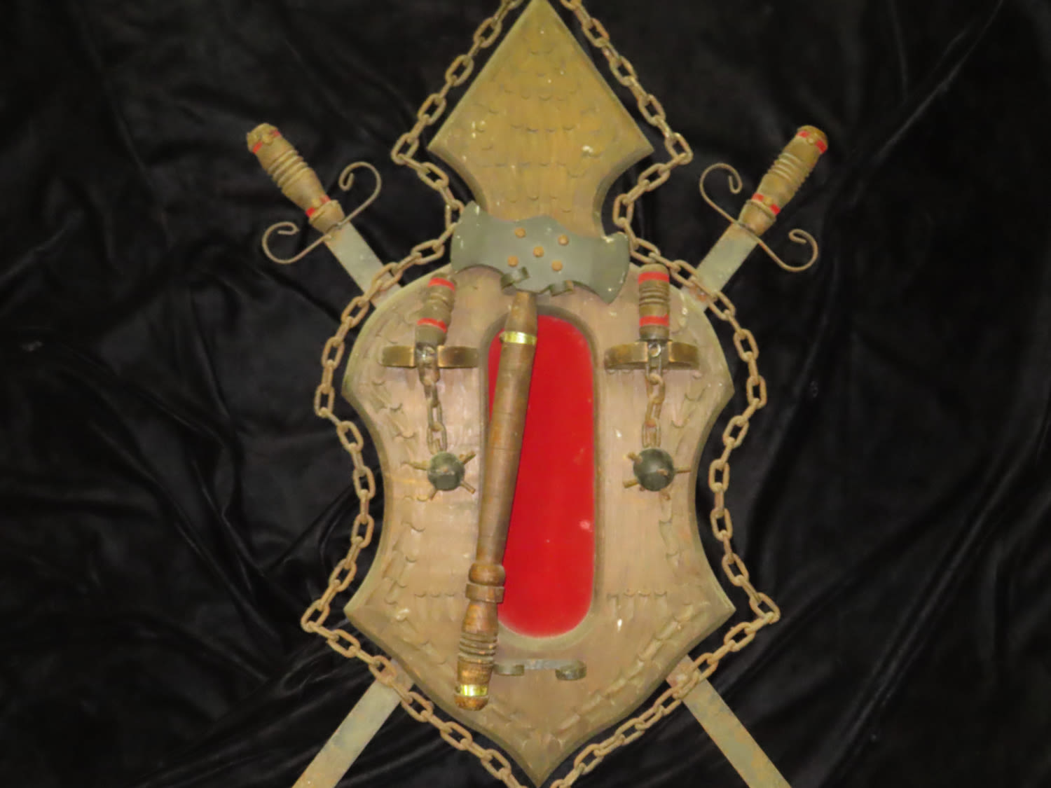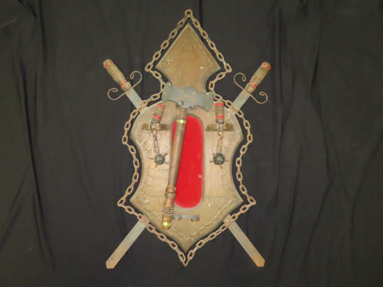 Vintage Medieval Wall Decor Shield with Faux Swords and Weapons. From the Estate of Antoine and Sandra Clairmont