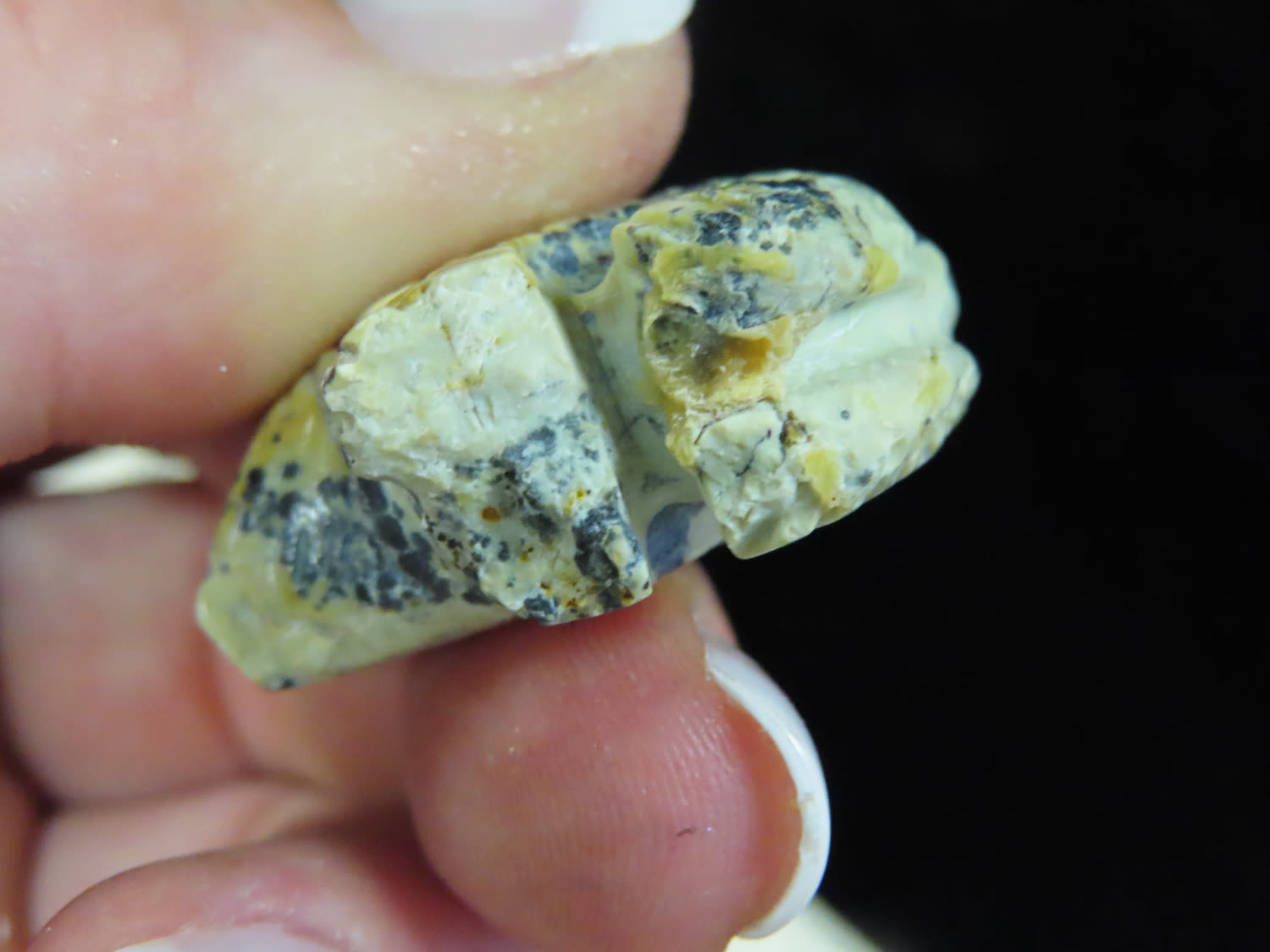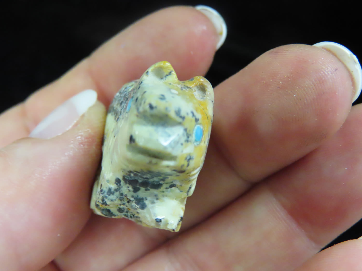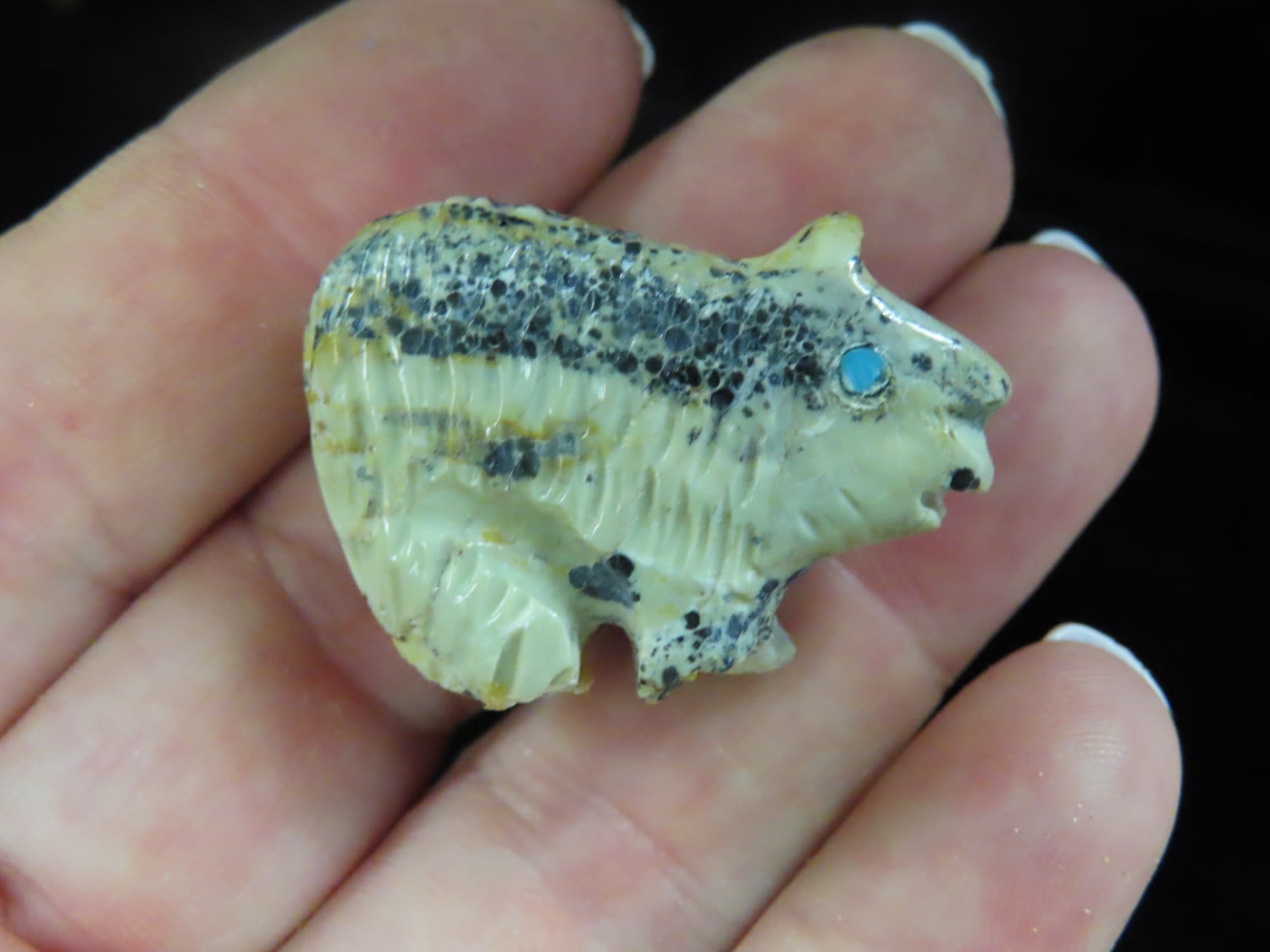 7/8" x 1 1/4" Zuni Fetish, Southwest touist trade relic Stone Engraved Carved Animal with Turquoise eyes. From the Estate of Antoine and Sandra Clairmont