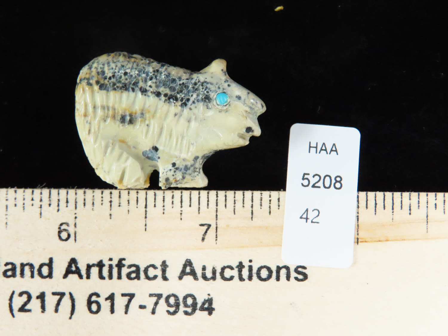 7/8″ x 1 1/4″ Stone Engraved Carved Animal with Turquoise eyes. From the Estate of Antoine and Sandra Clairmont