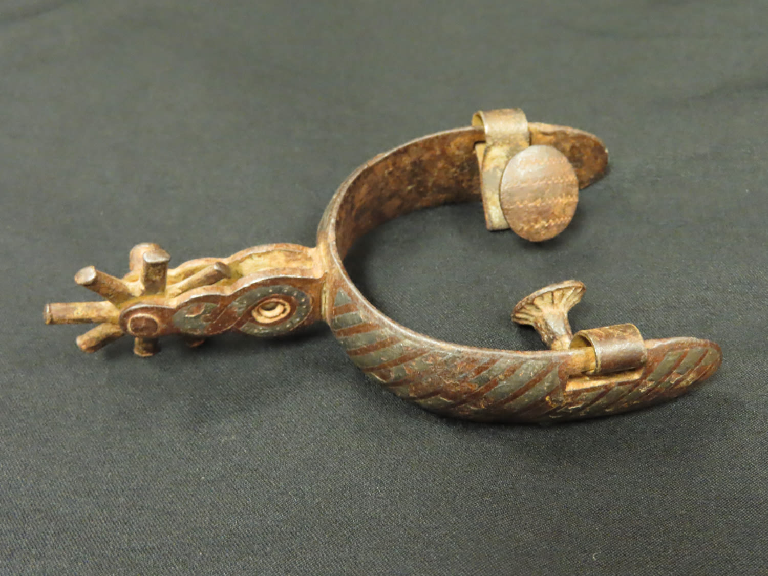 Vintage Single Clamp-on Boot Spur with Decorative Leather Strap. From the Estate of Antoine and Sandra Clairmont
