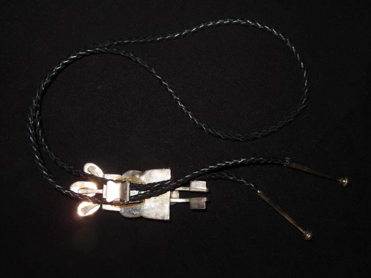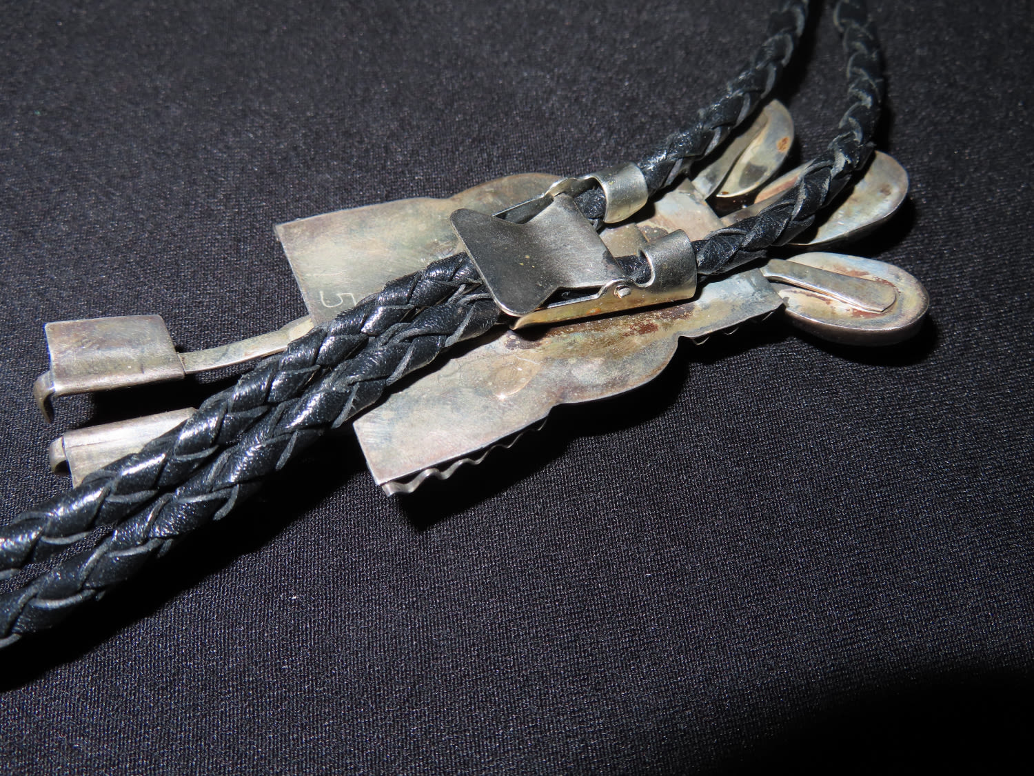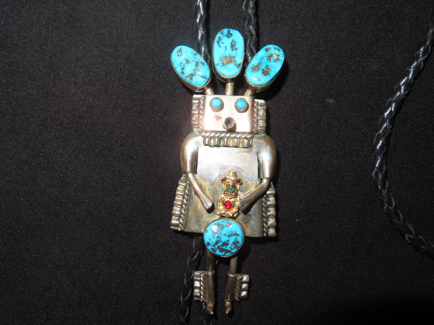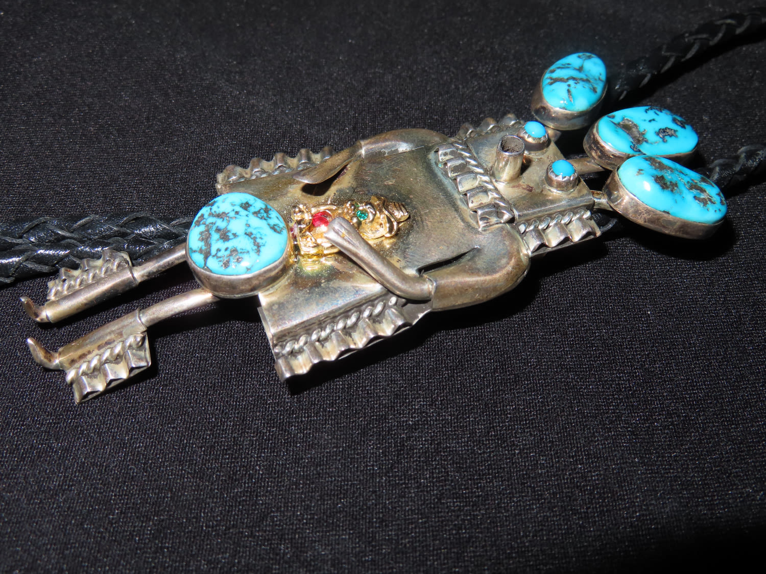 Bolo Tie with Silver and Turquoise design with jewels. Marked Sterling. Signed F. Arviso S/N: 15598
