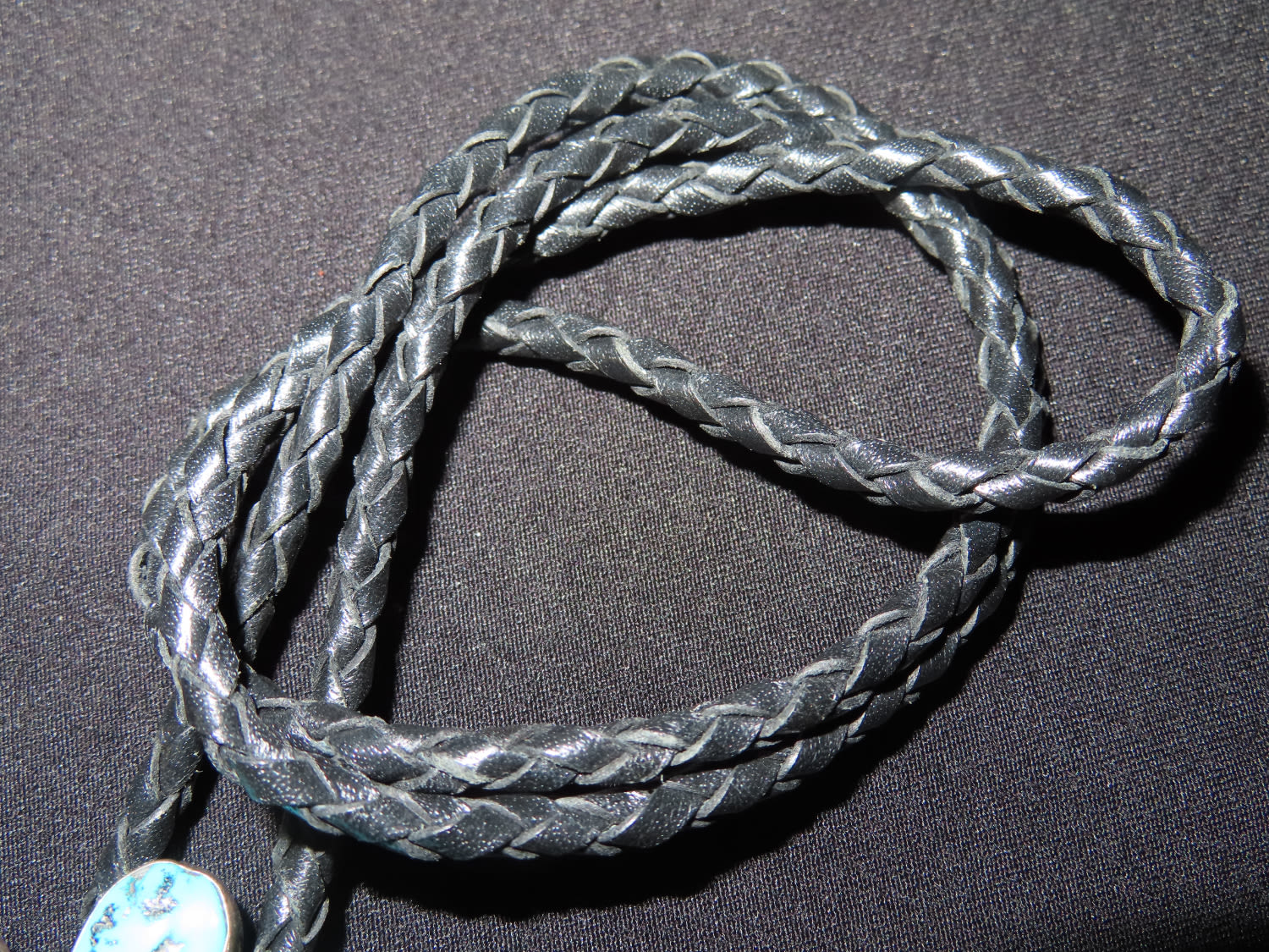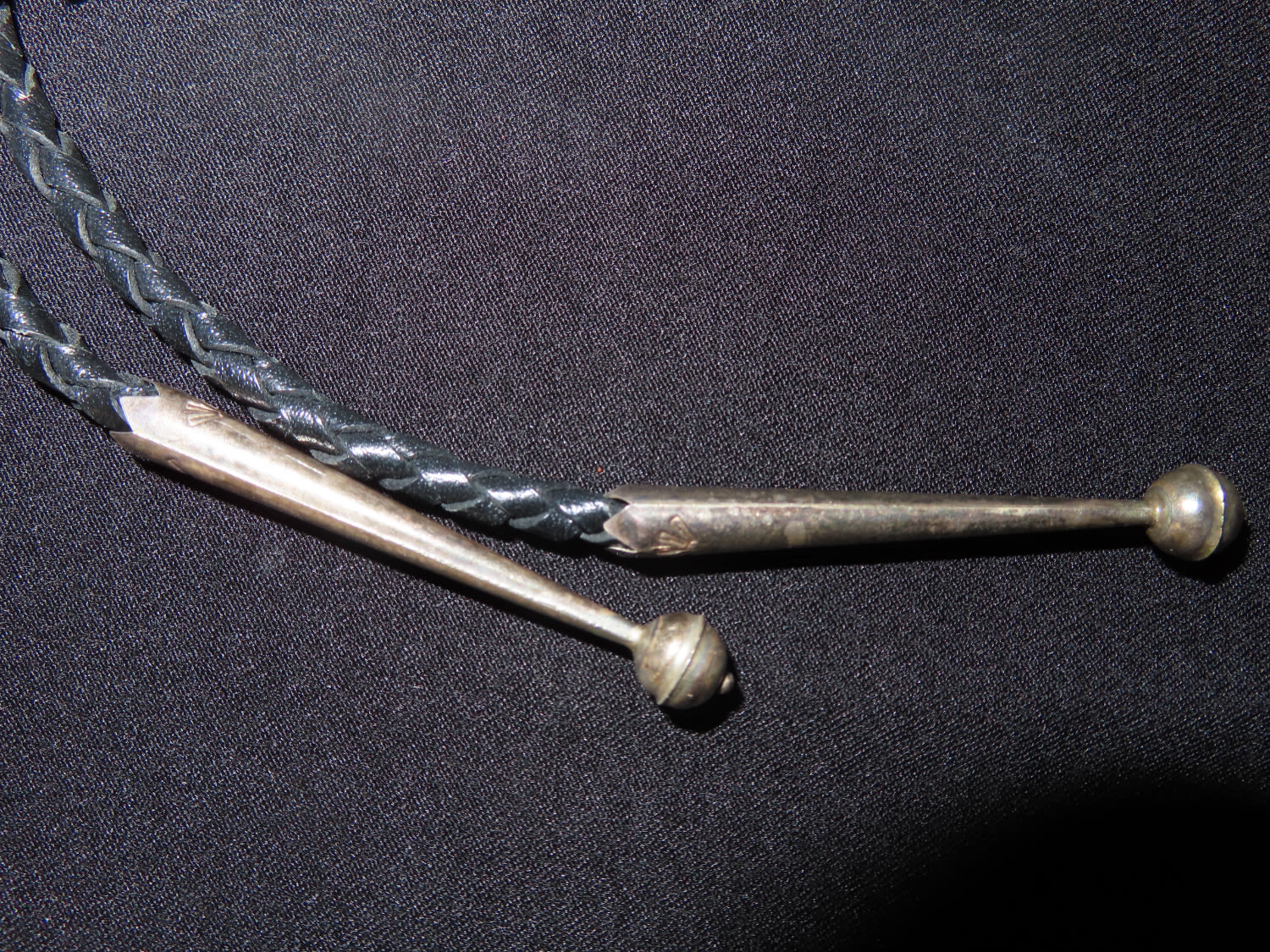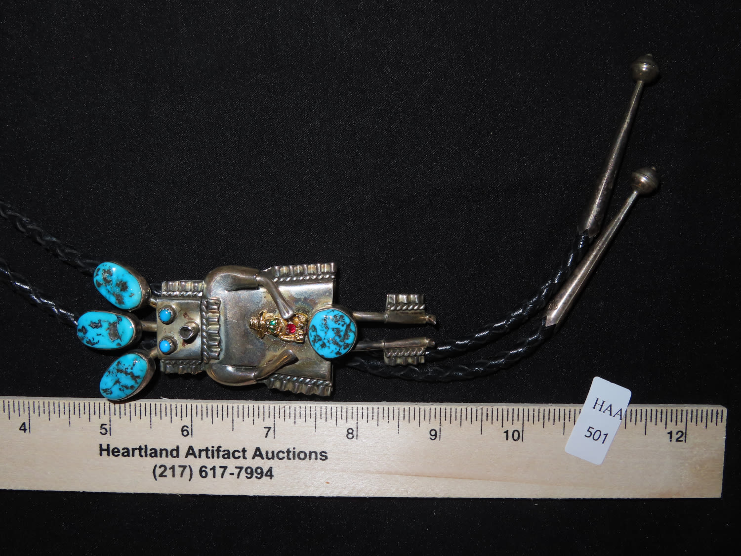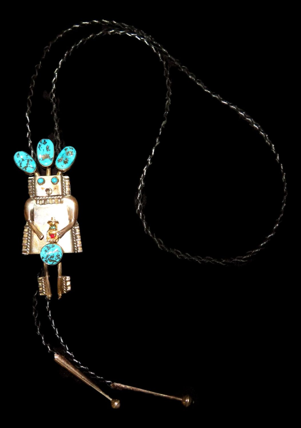 Bolo Tie with Silver and Turquoise design with jewels. Marked Sterling. Signed F. Arviso S/N: 15598