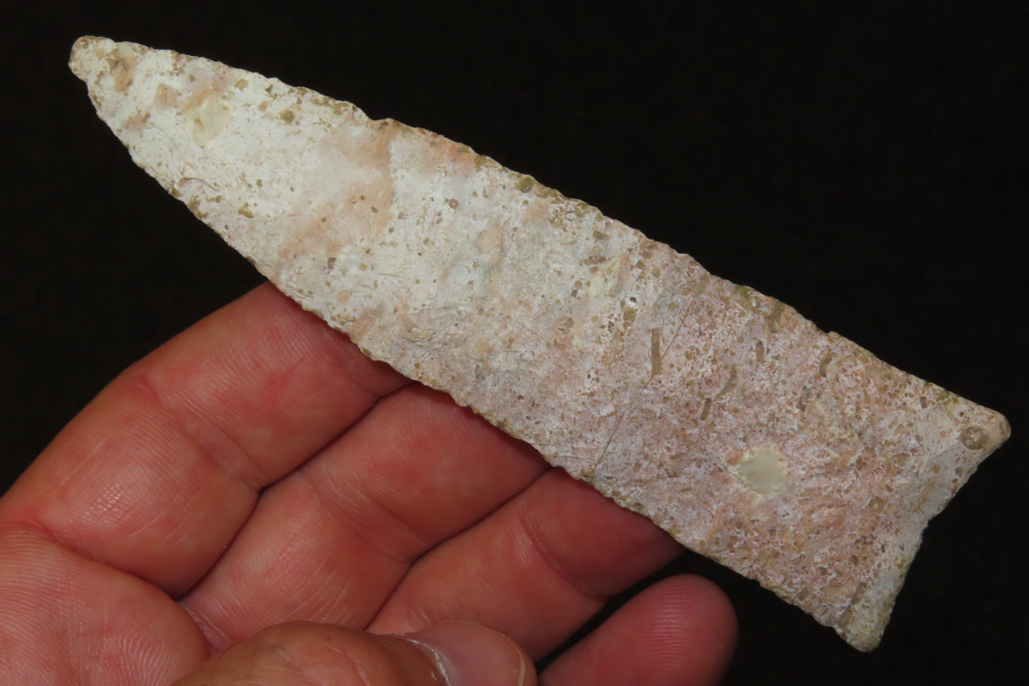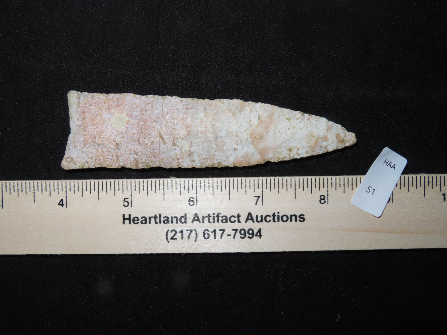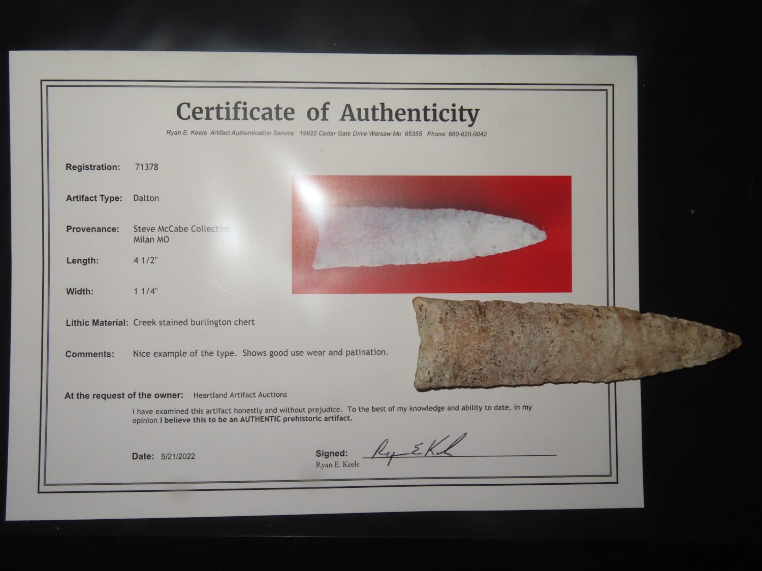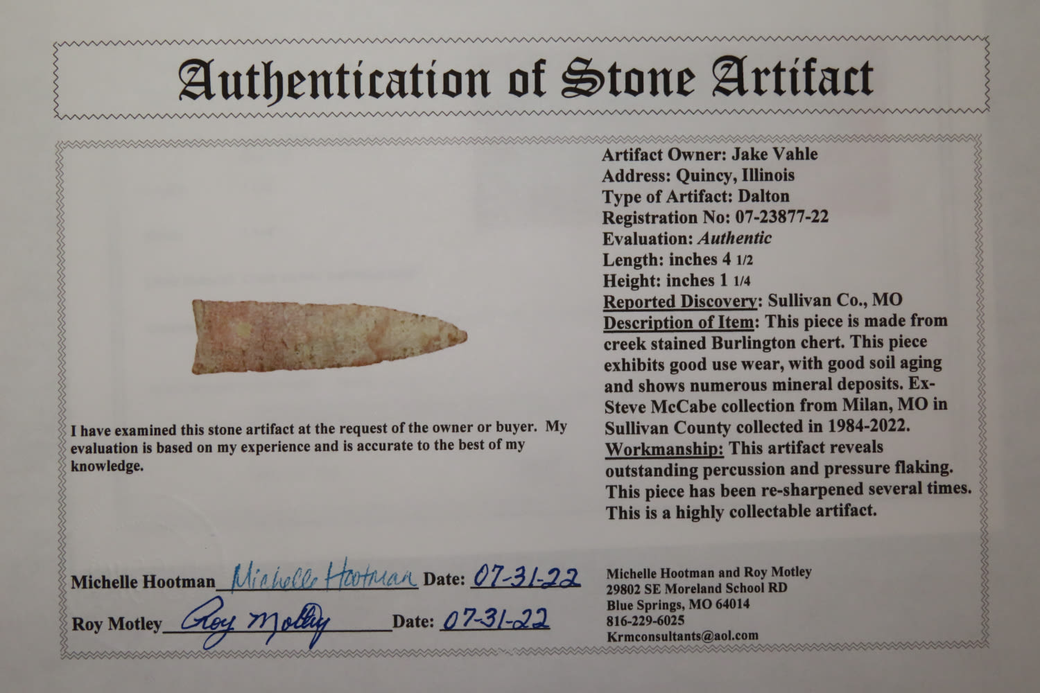 4 1/2″ Dalton. 2x COA’s Motley/Keele. From the Steve McCabe Collection, Milan, Sullivan County Missouri. Made of Creek Stained Burlington Chert