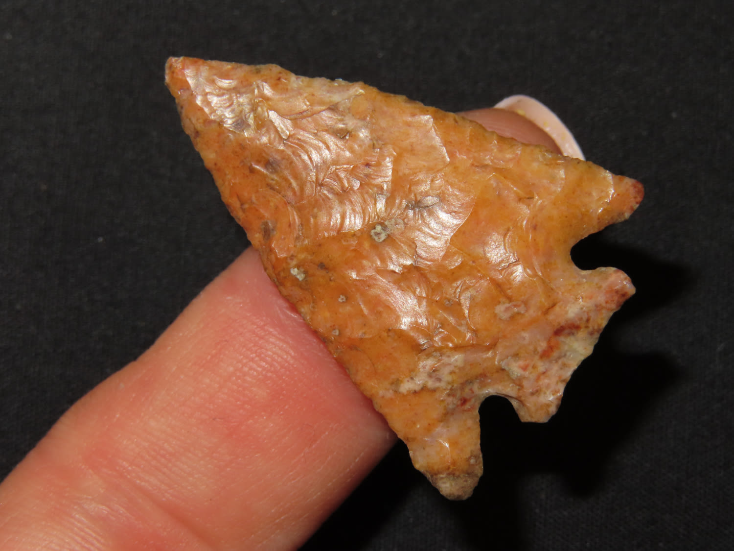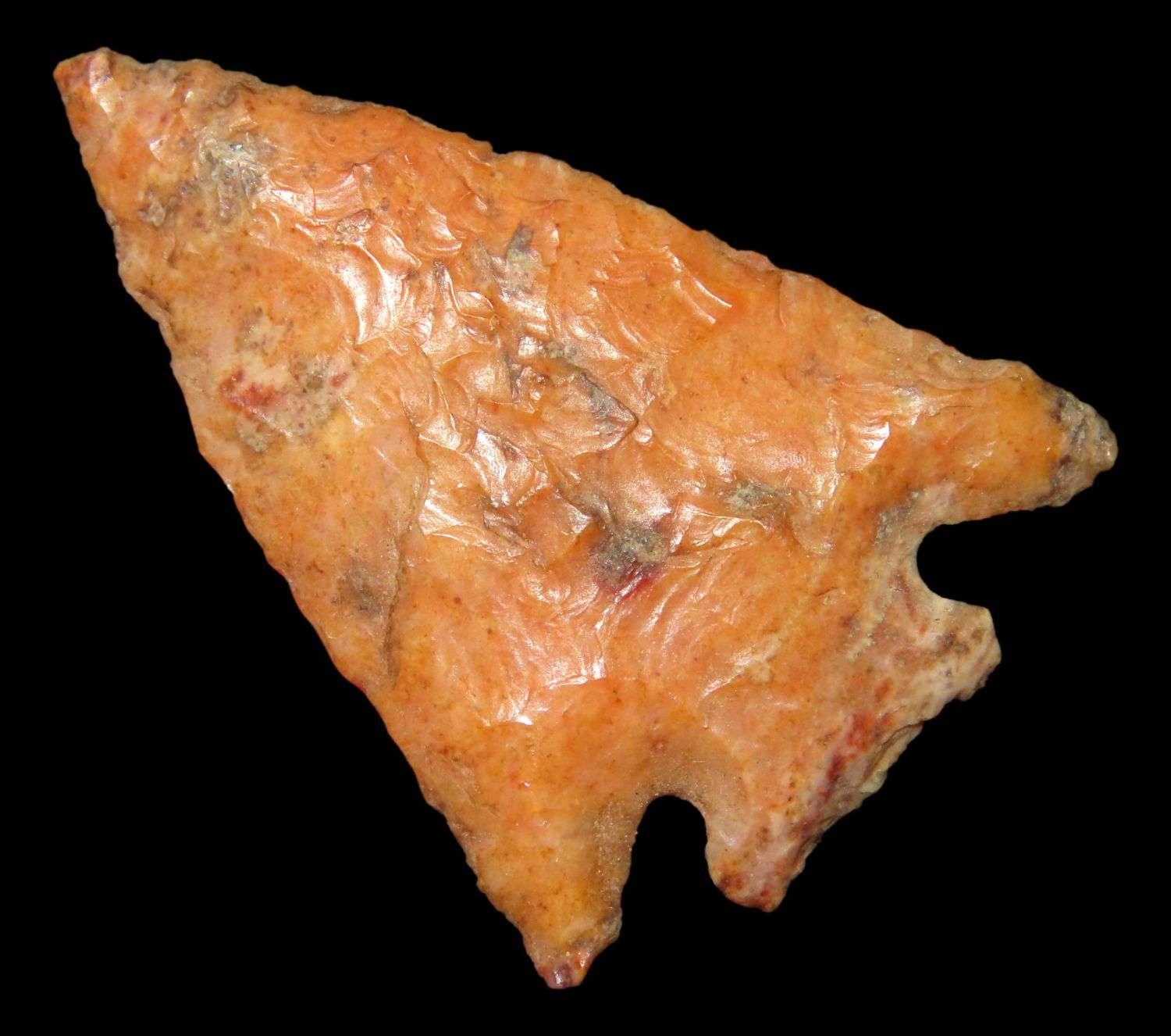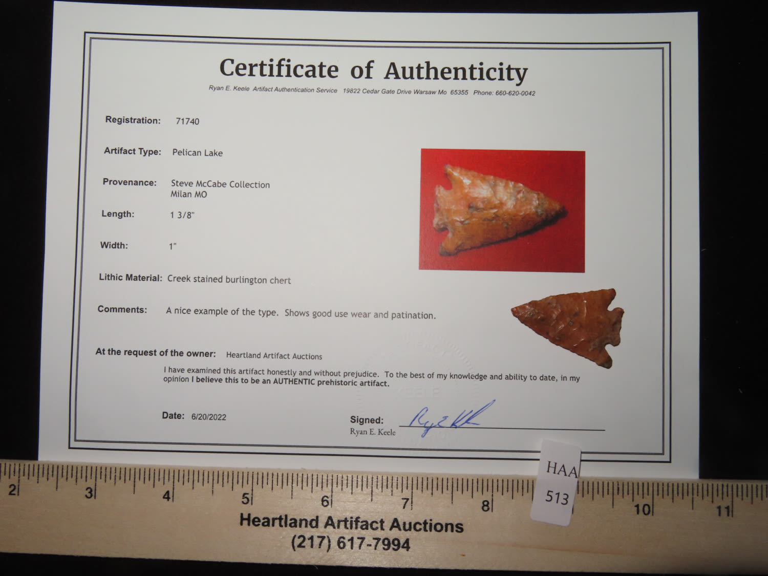 1 3/8″ x 1″ Pelican Lake. Made of Creek Stained Burlington Chert. From the Steve McCabe Collection, Milan, Sullivan County Missouri. COA: Ryan E. Keele