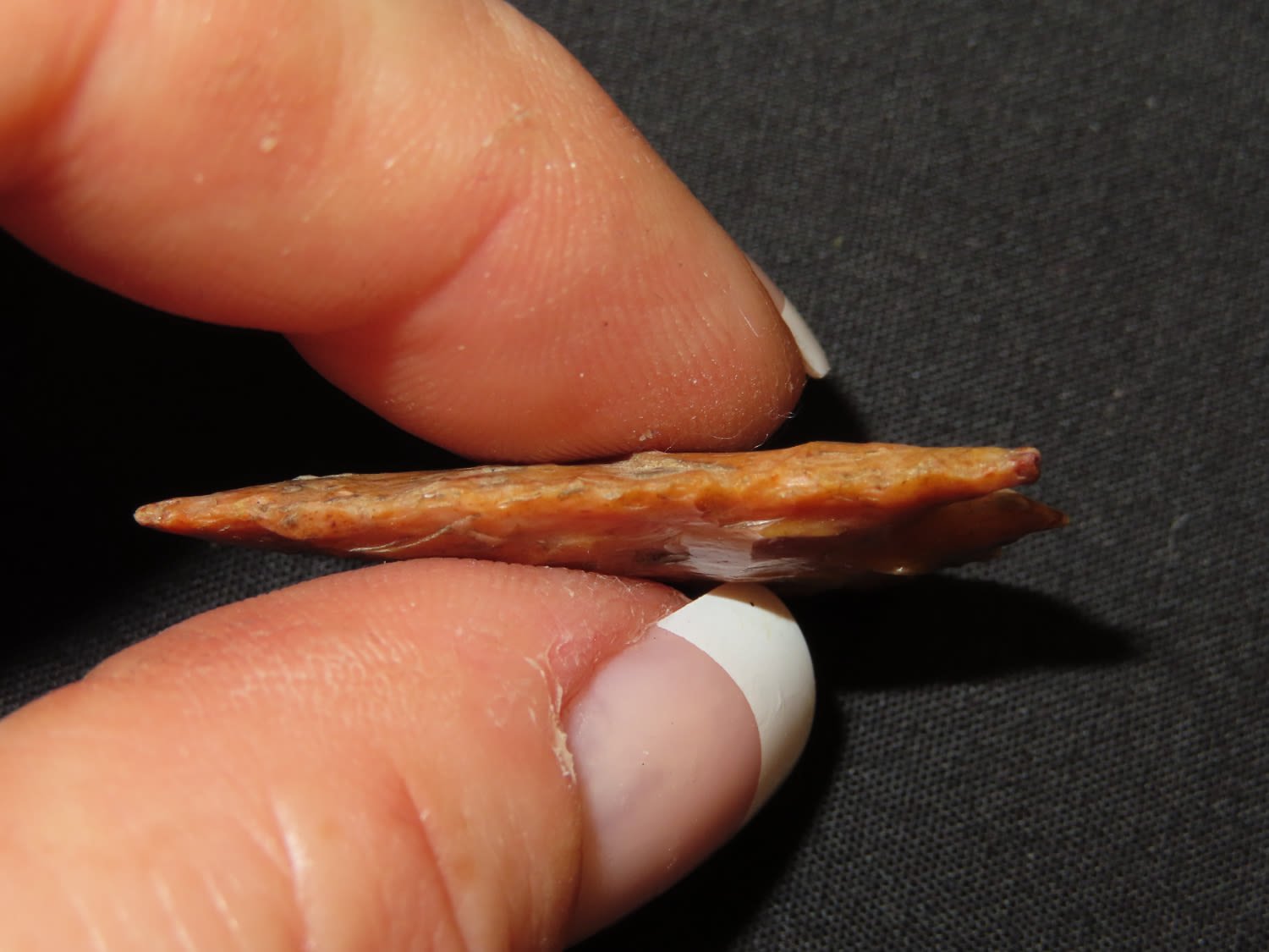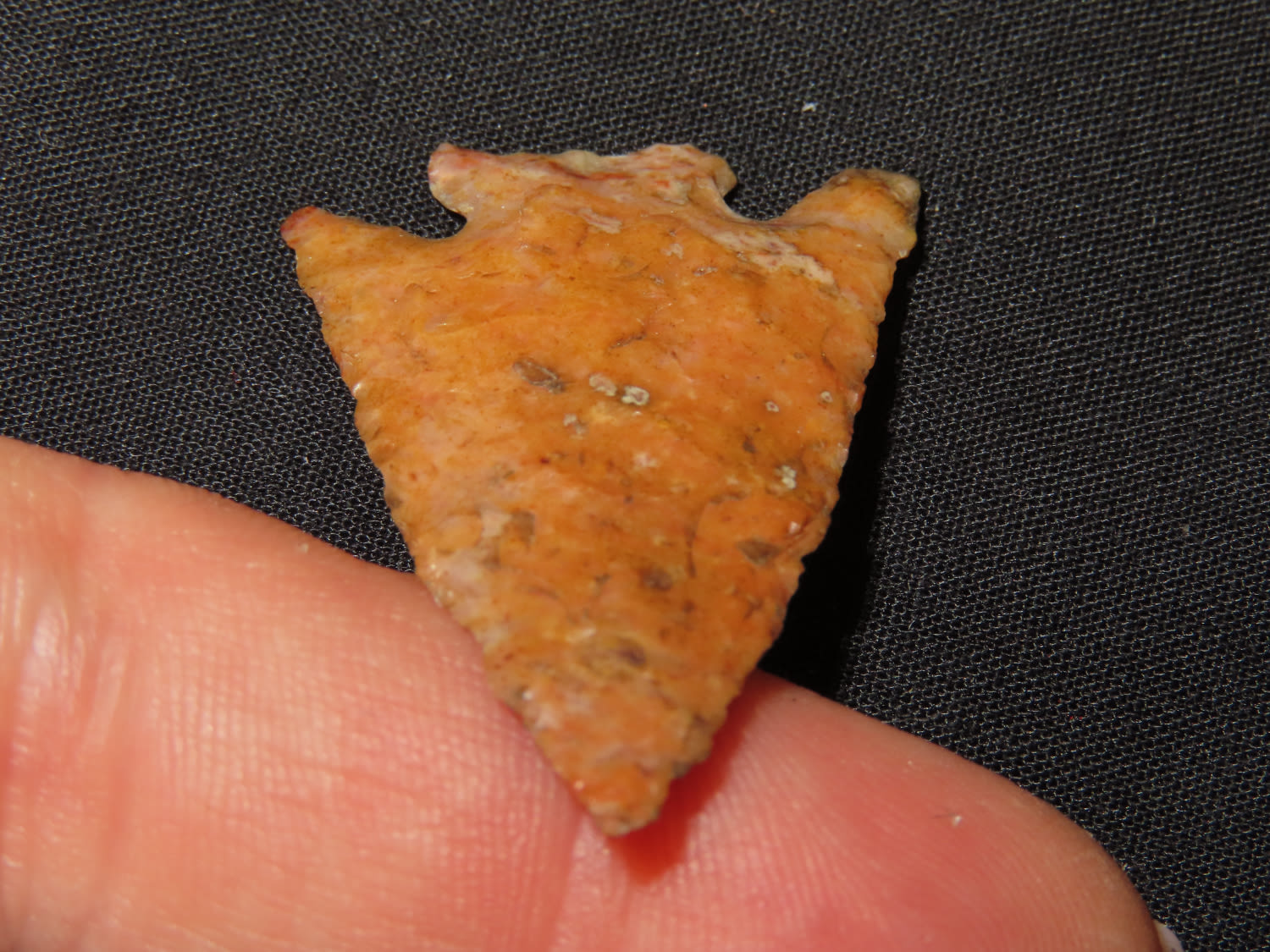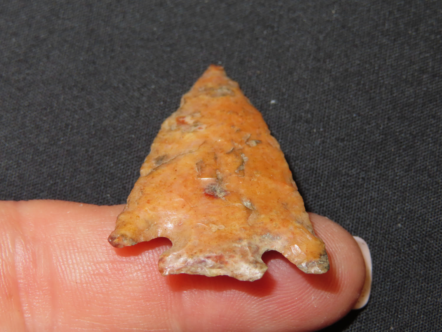 1 3/8″ x 1″ Pelican Lake. Made of Creek Stained Burlington Chert. From the Steve McCabe Collection, Milan, Sullivan County Missouri. COA: Ryan E. Keele