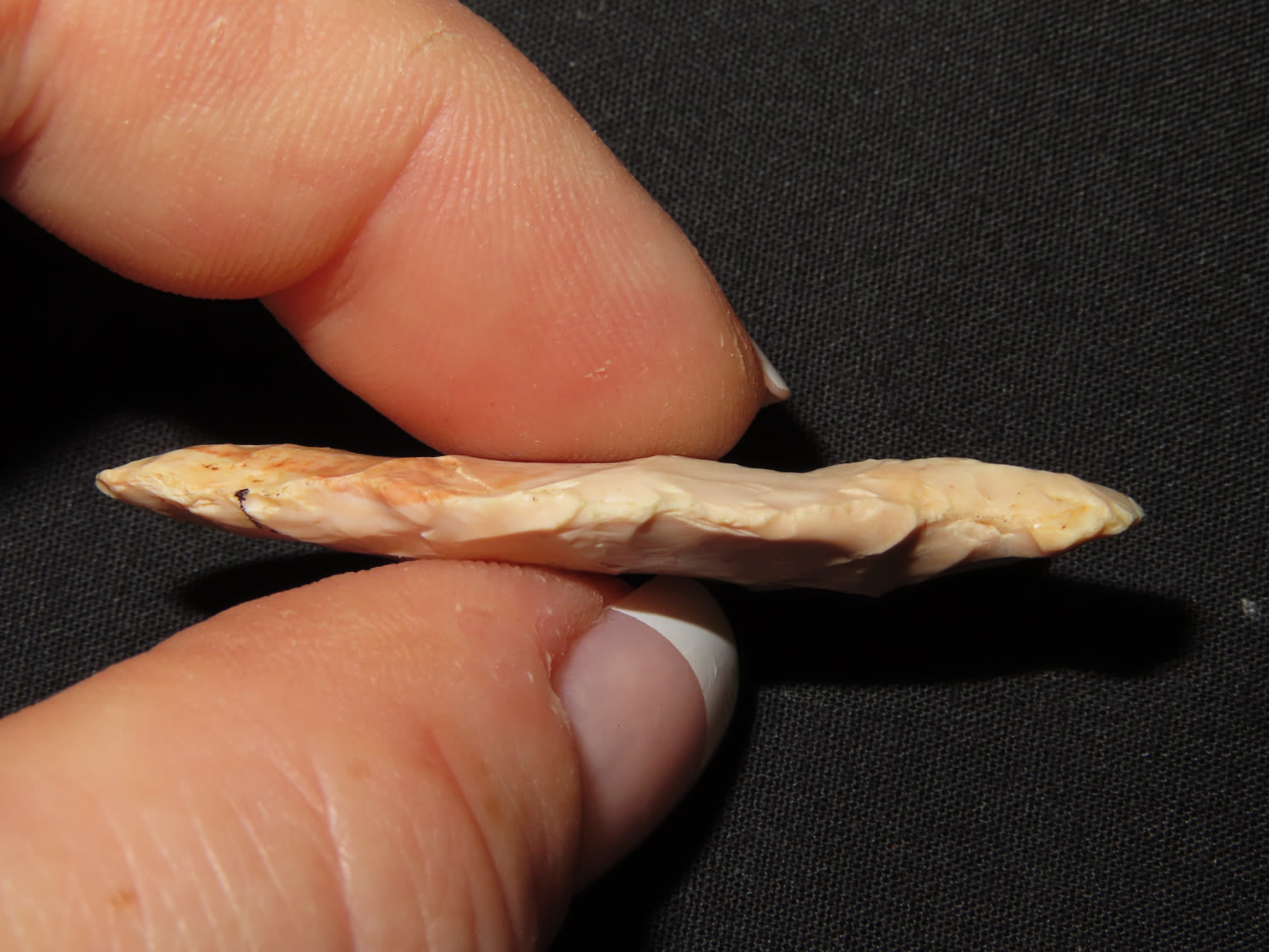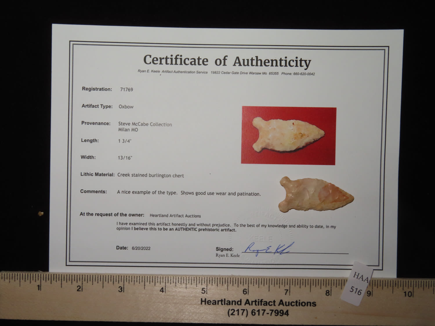 1 3/4″ x 13/16″ Oxbow. Made of Creek stained Burlington Chert. From the Steve McCabe Collection, Milan, Sullivan County Missouri. COA: Ryan E. Keele