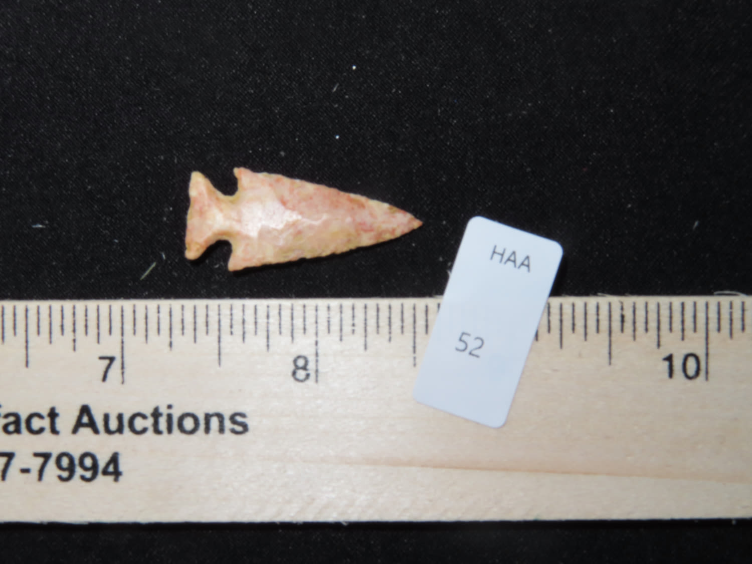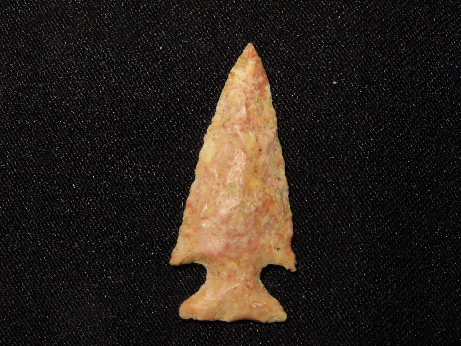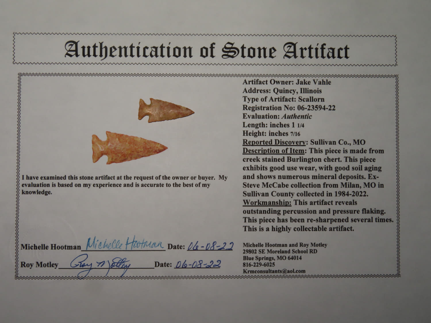 1 1/4″ Scallorn. Motley COA. Found in Sullivan County Missouri. Made from Creek Stained Burlington Chert