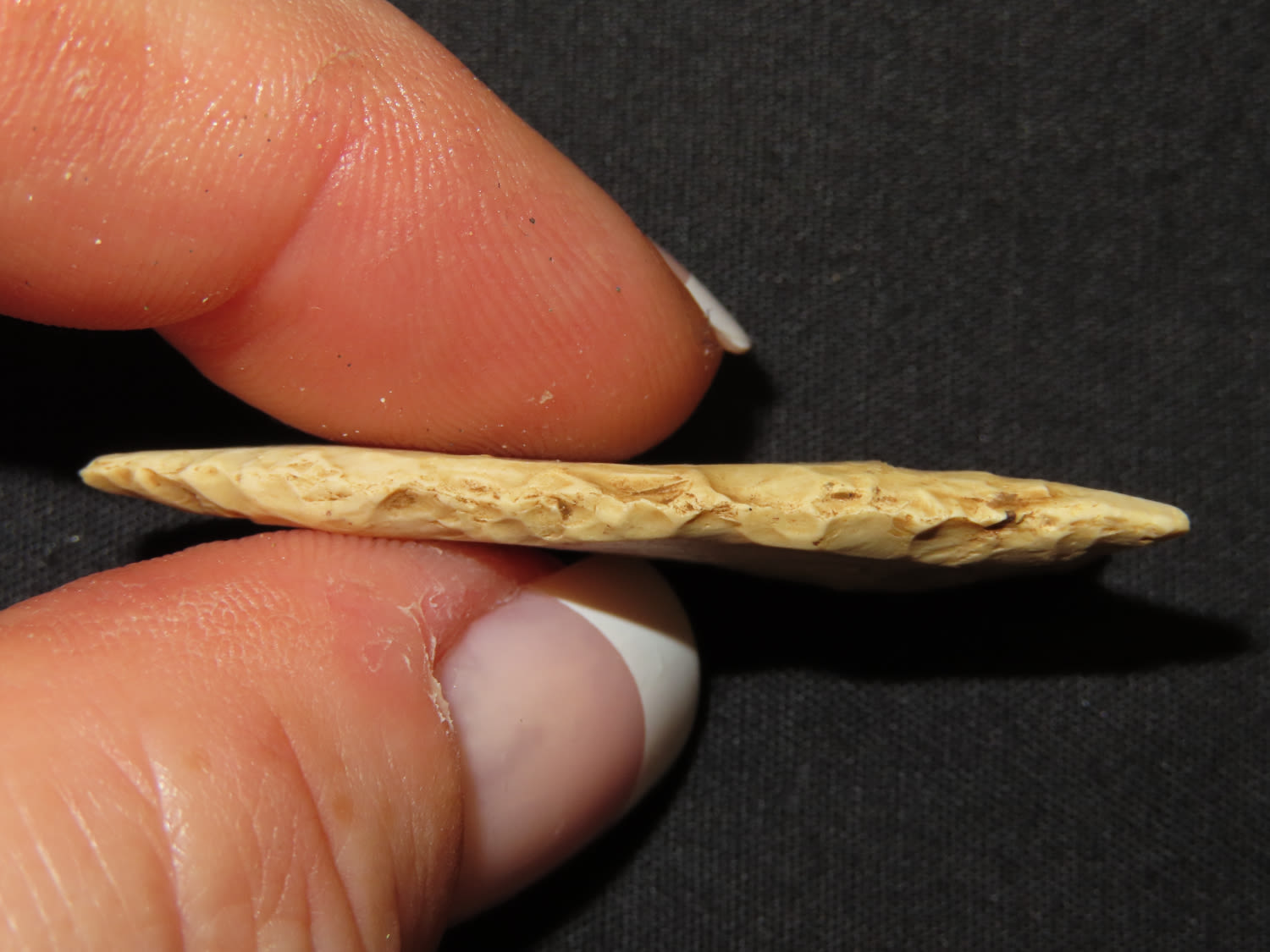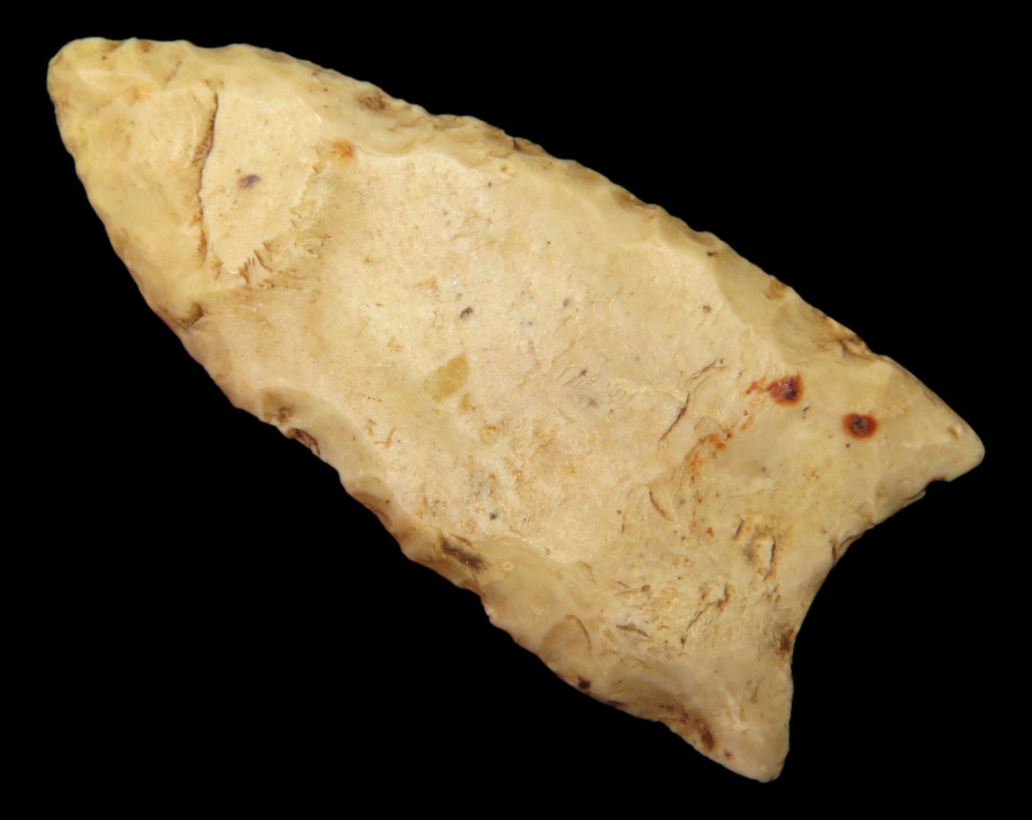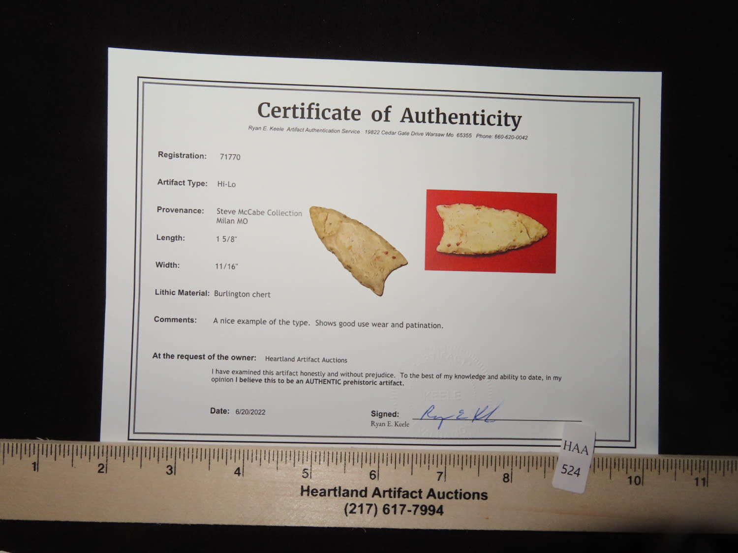 1 5/8″ x 11/16″ Hi-Lo. Material: Burlington chert. From the Steve McCabe Collection, Milan, Sullivan County Missouri. COA: Ryan E. Keele