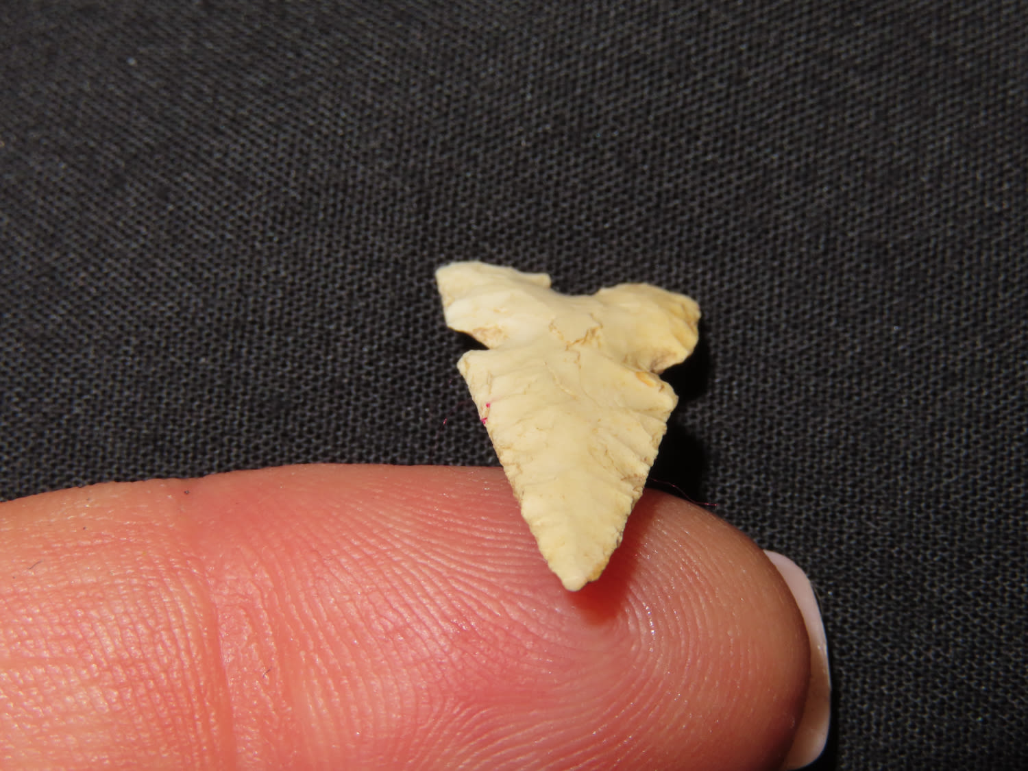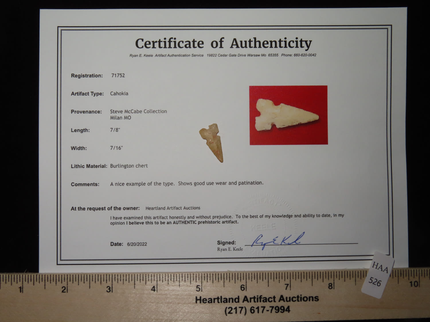 7/8″ x 7/16″ Cahokia. Material: Burlington chert. From the Steve McCabe Collection, Milan, Sullivan County Missouri. COA: Ryan E. Keele