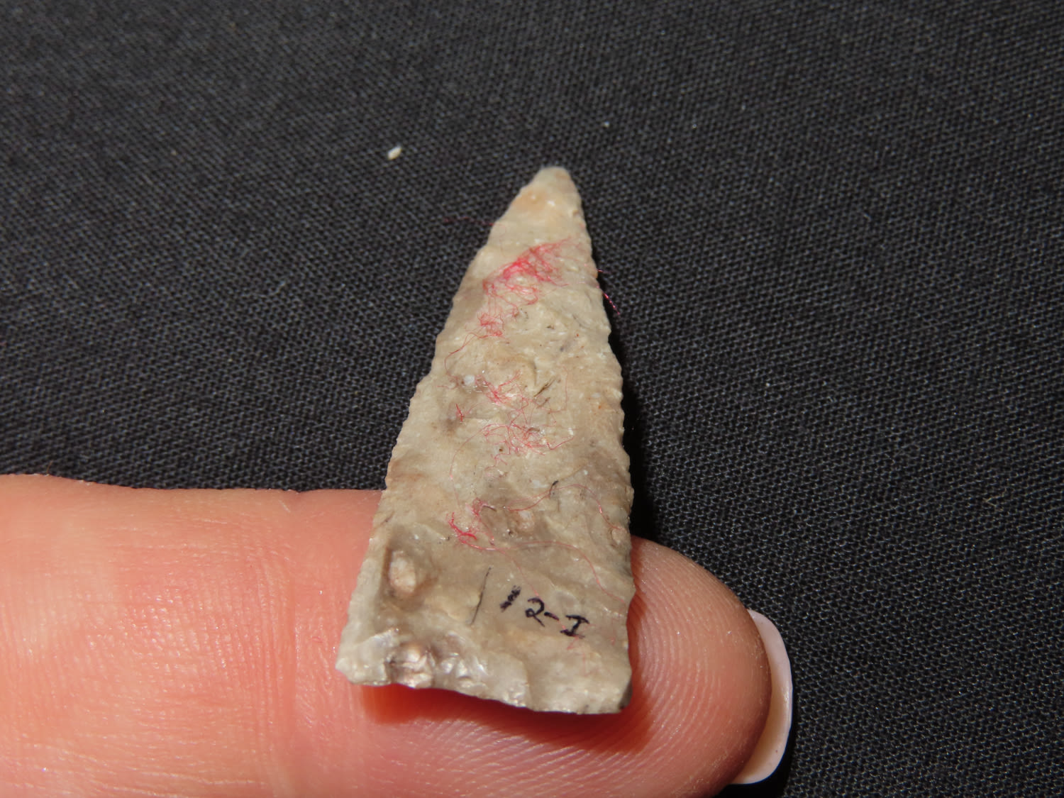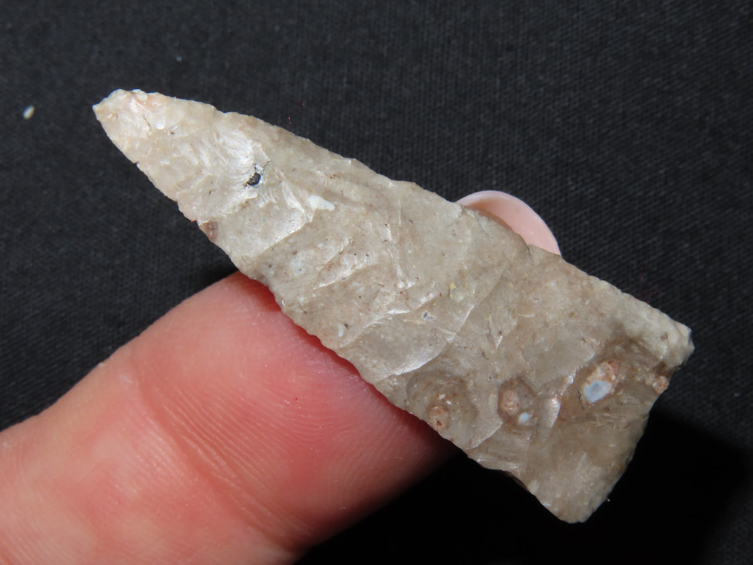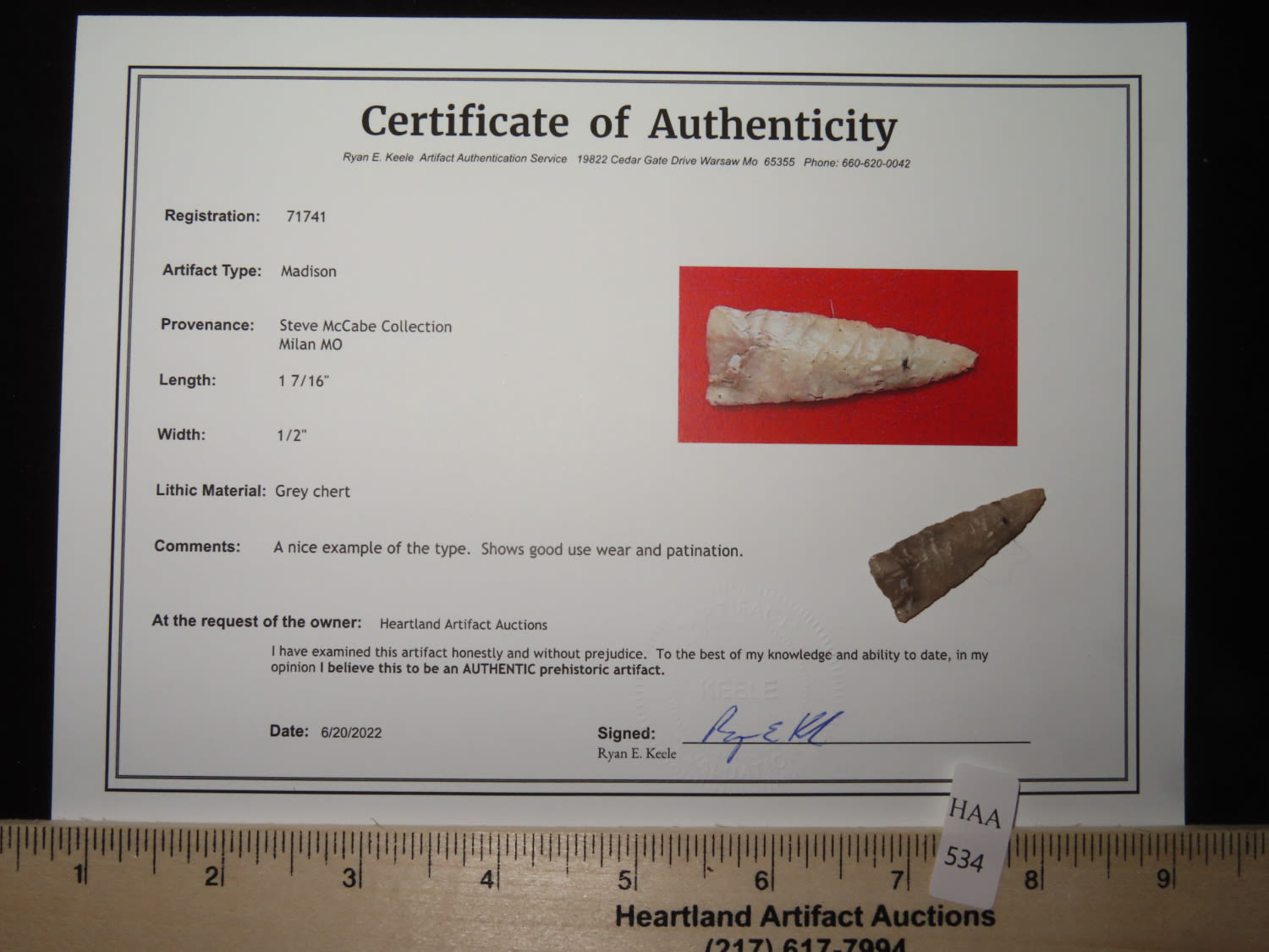 1 7/16″ x 1/2″ Madison. Material: Grey chert. From the Steve McCabe Collection, Milan, Sullivan County Missouri. COA: Ryan E. Keele