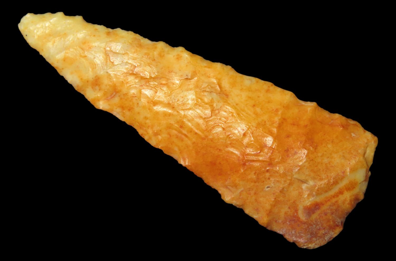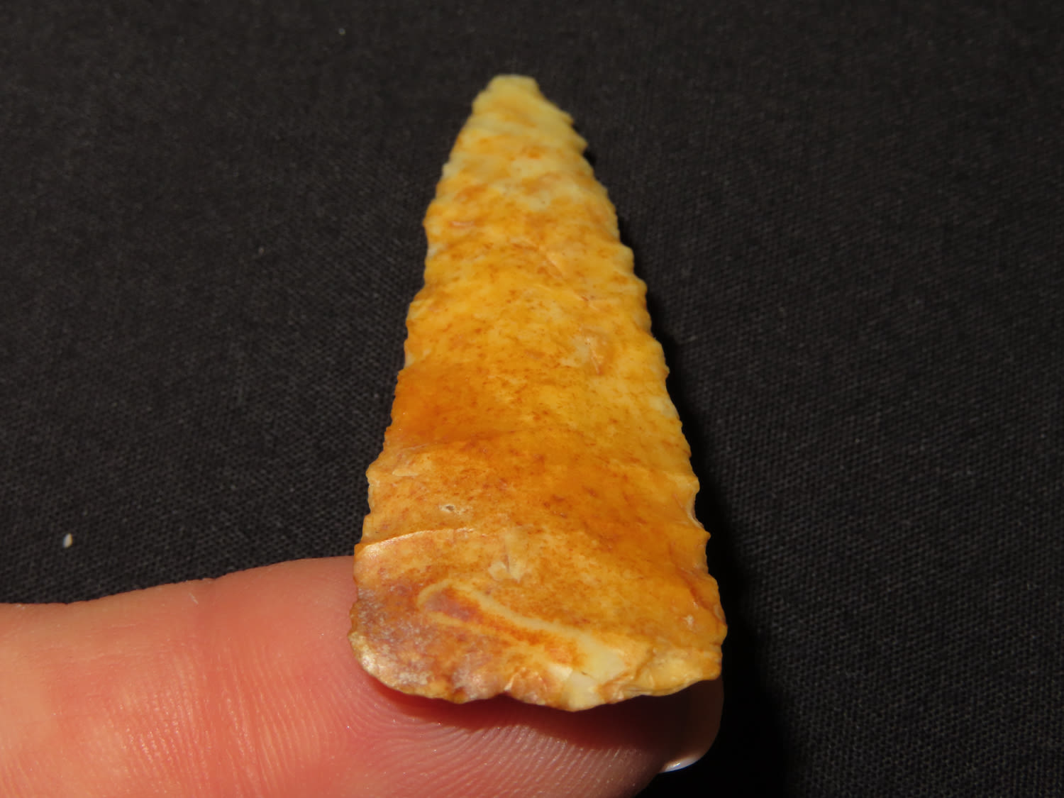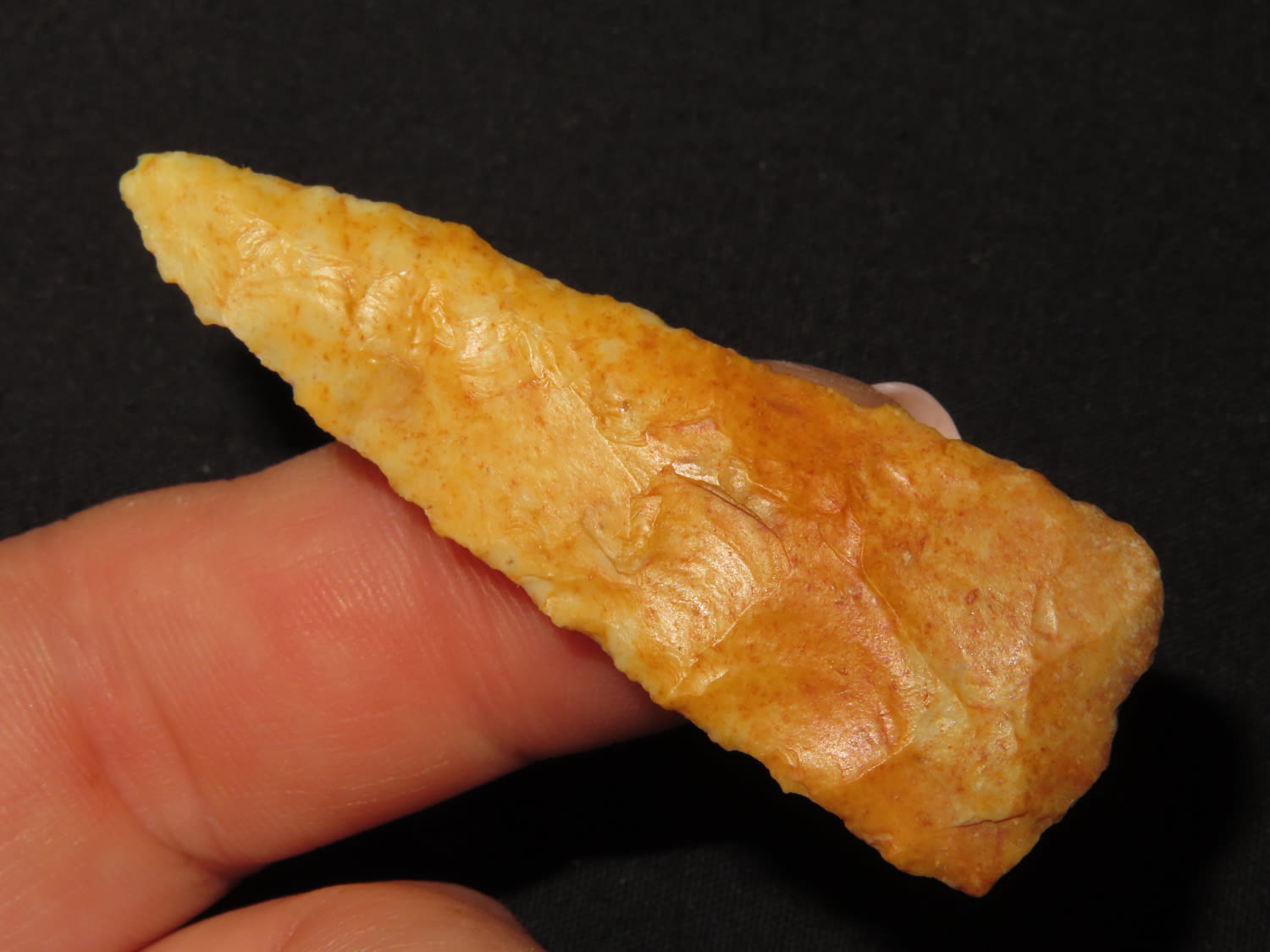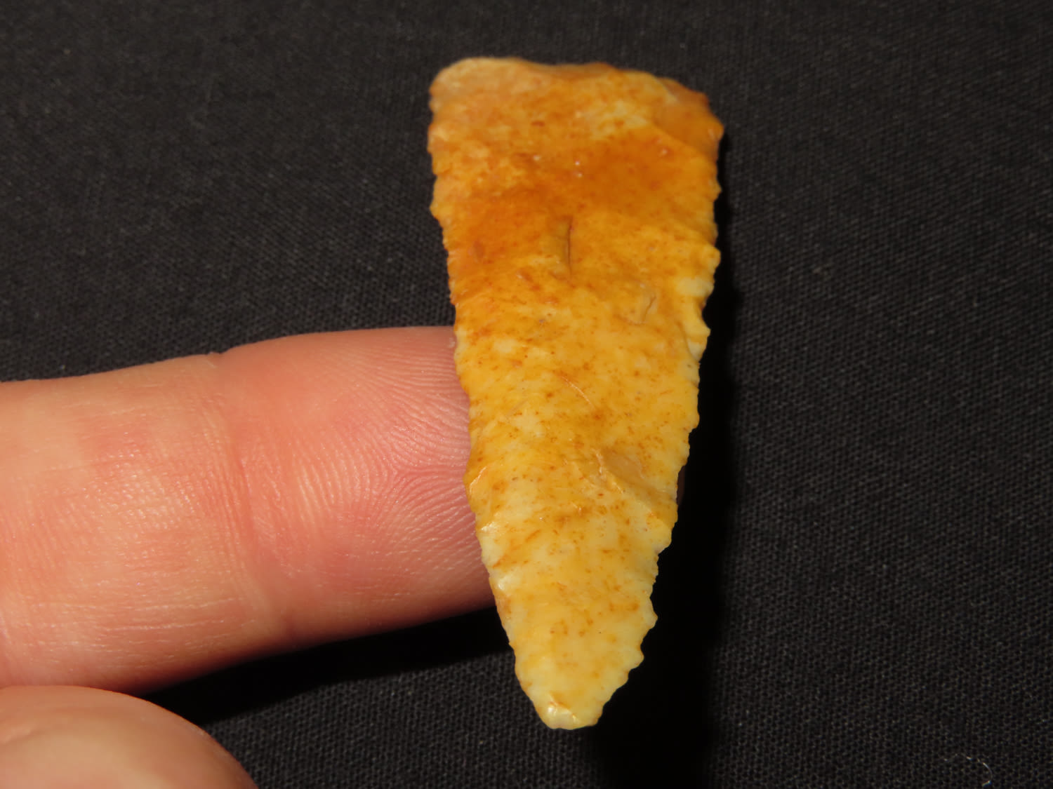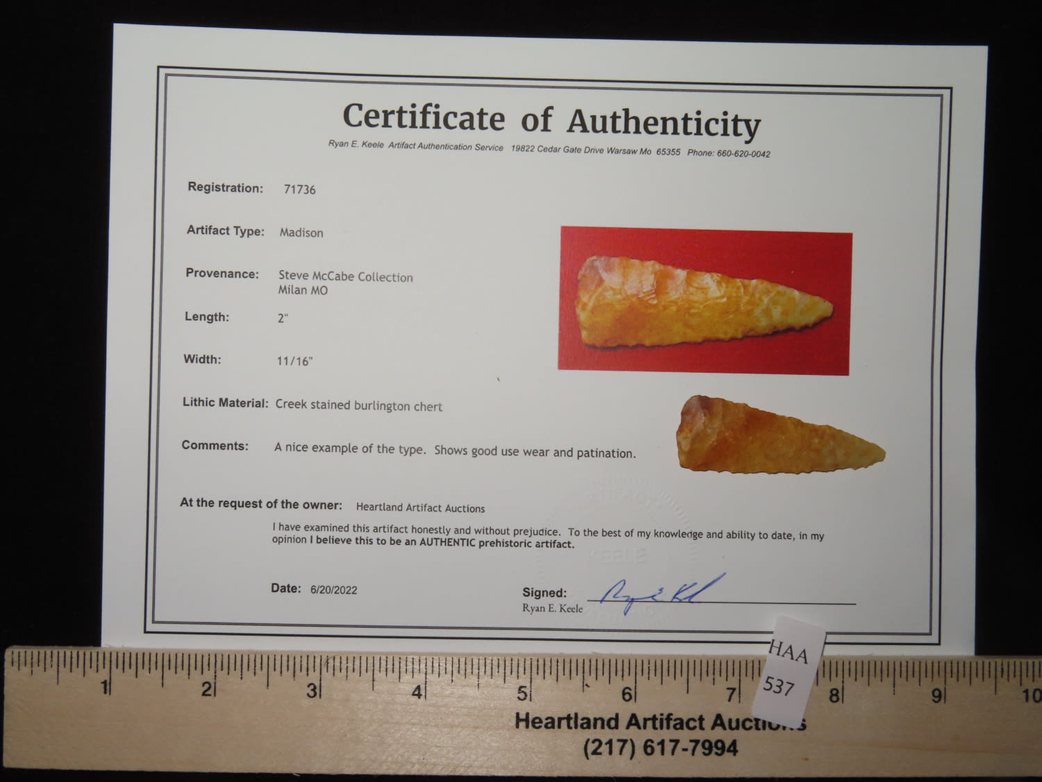 2″ x 11/16″ Madison. Material: Creek stained burlington chert. From the Steve McCabe Collection, Milan, Sullivan County Missouri. COA: Ryan E. Keele