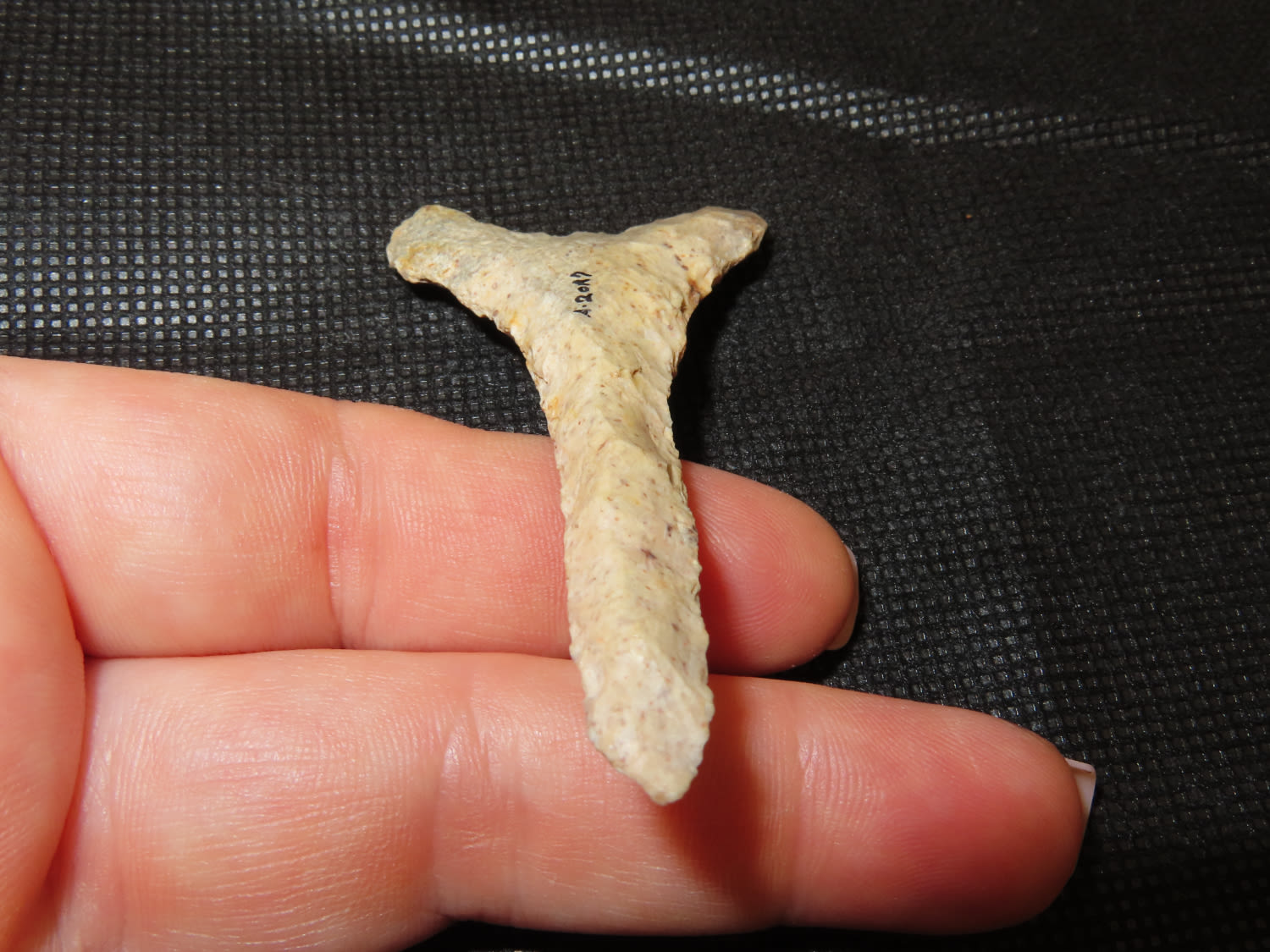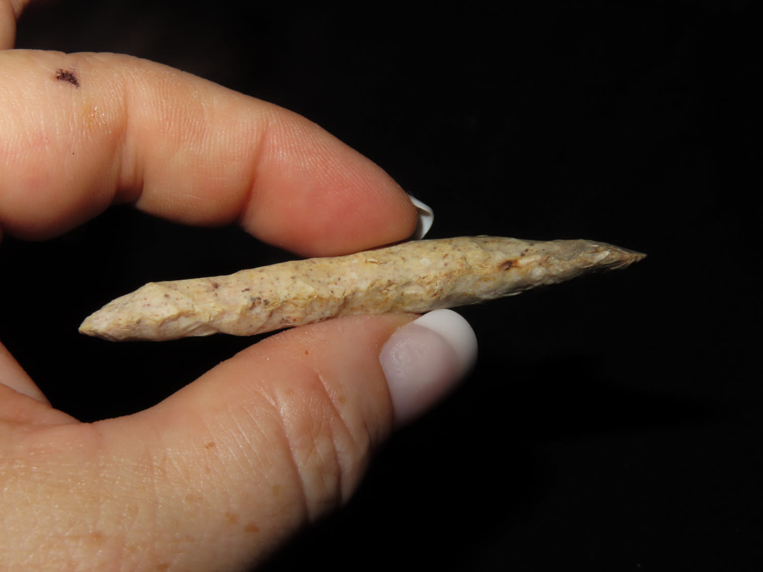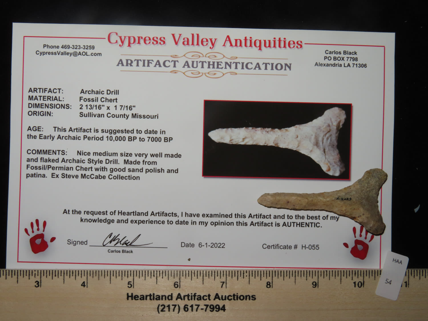 2 13/16″ x 1 7/16″ Archaic Drill. Carlos Black COA. Found in Sullivan County Missouri From the Steve McCabe Collection, Milan, Sullivan County Missouri. Made Fossil Chert