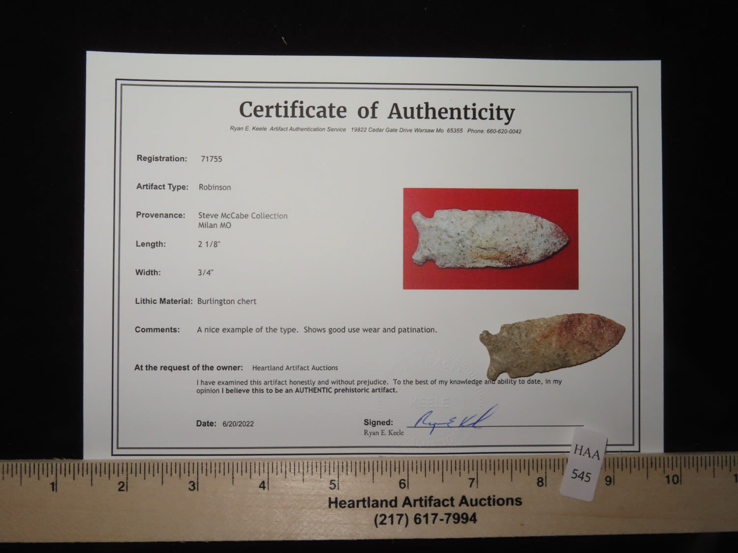 2 1/8" x 3/4" Robinson. Material: Burlington chert. From the Steve McCabe Collection, Milan, Sullivan County Missouri. COA: Ryan E. Keele