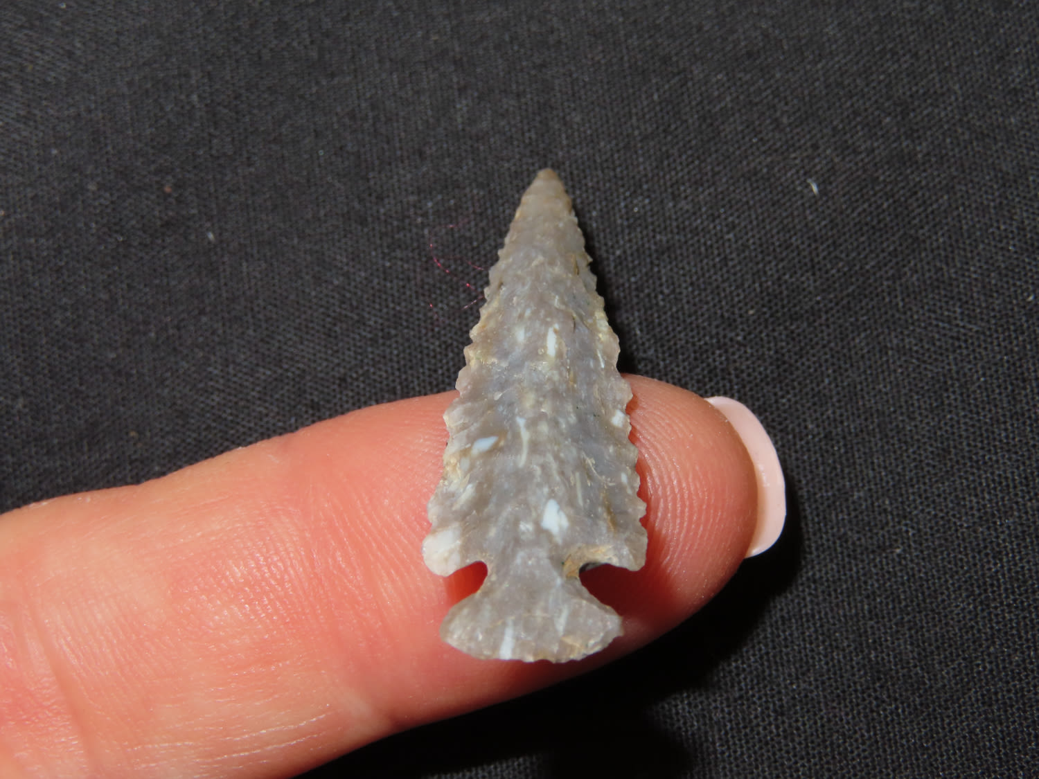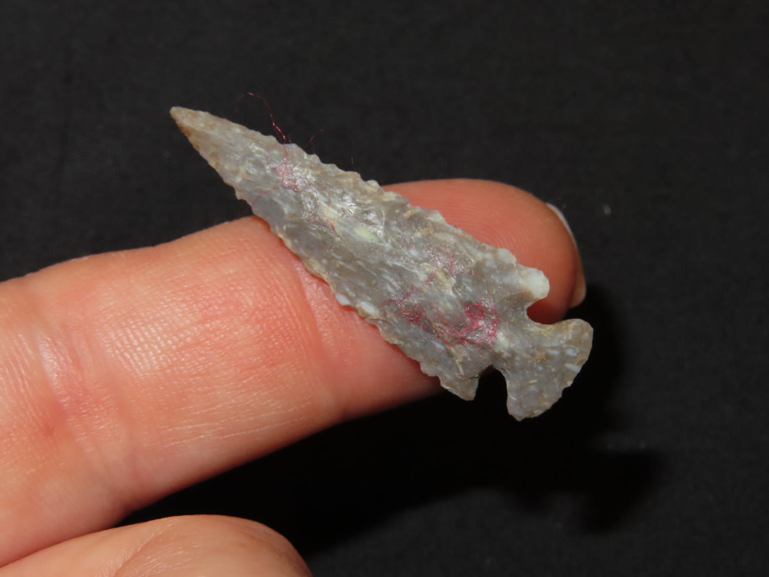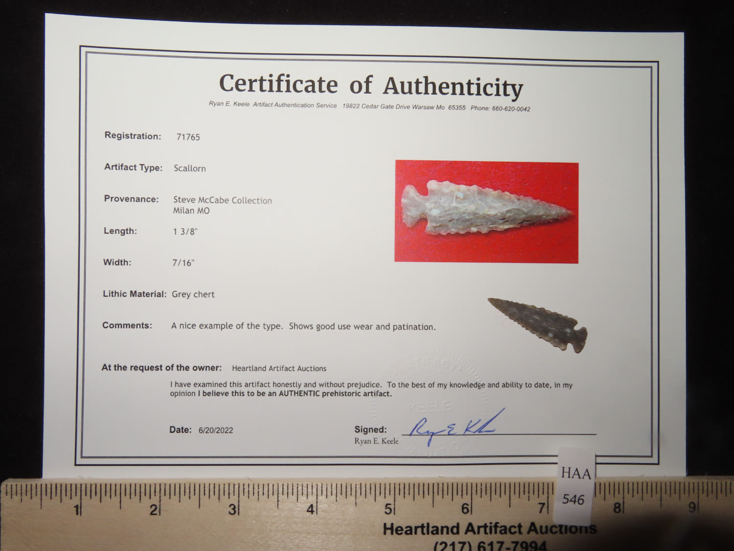 1 3/8″ x 7/16″ Scallorn. Material: Grey chert. From the Steve McCabe Collection, Milan, Sullivan County Missouri. COA: Ryan E. Keele