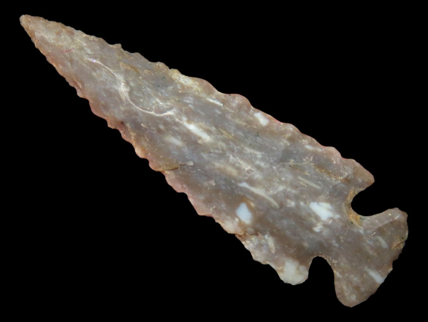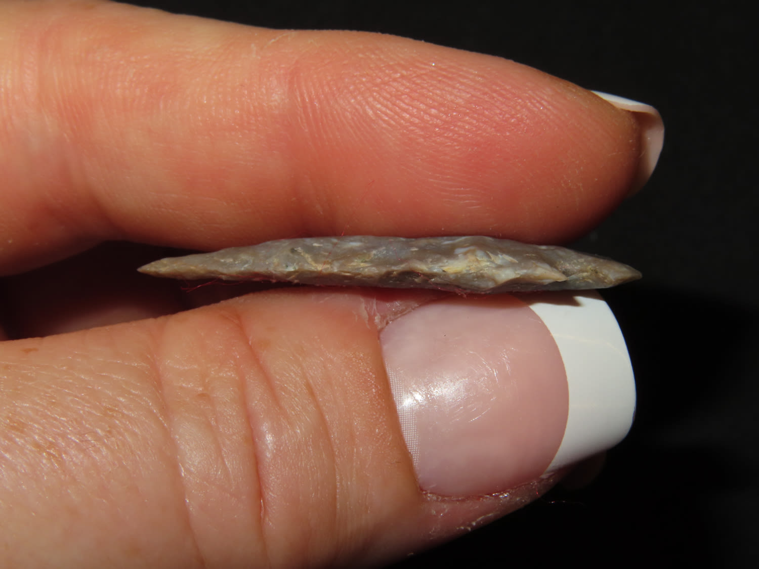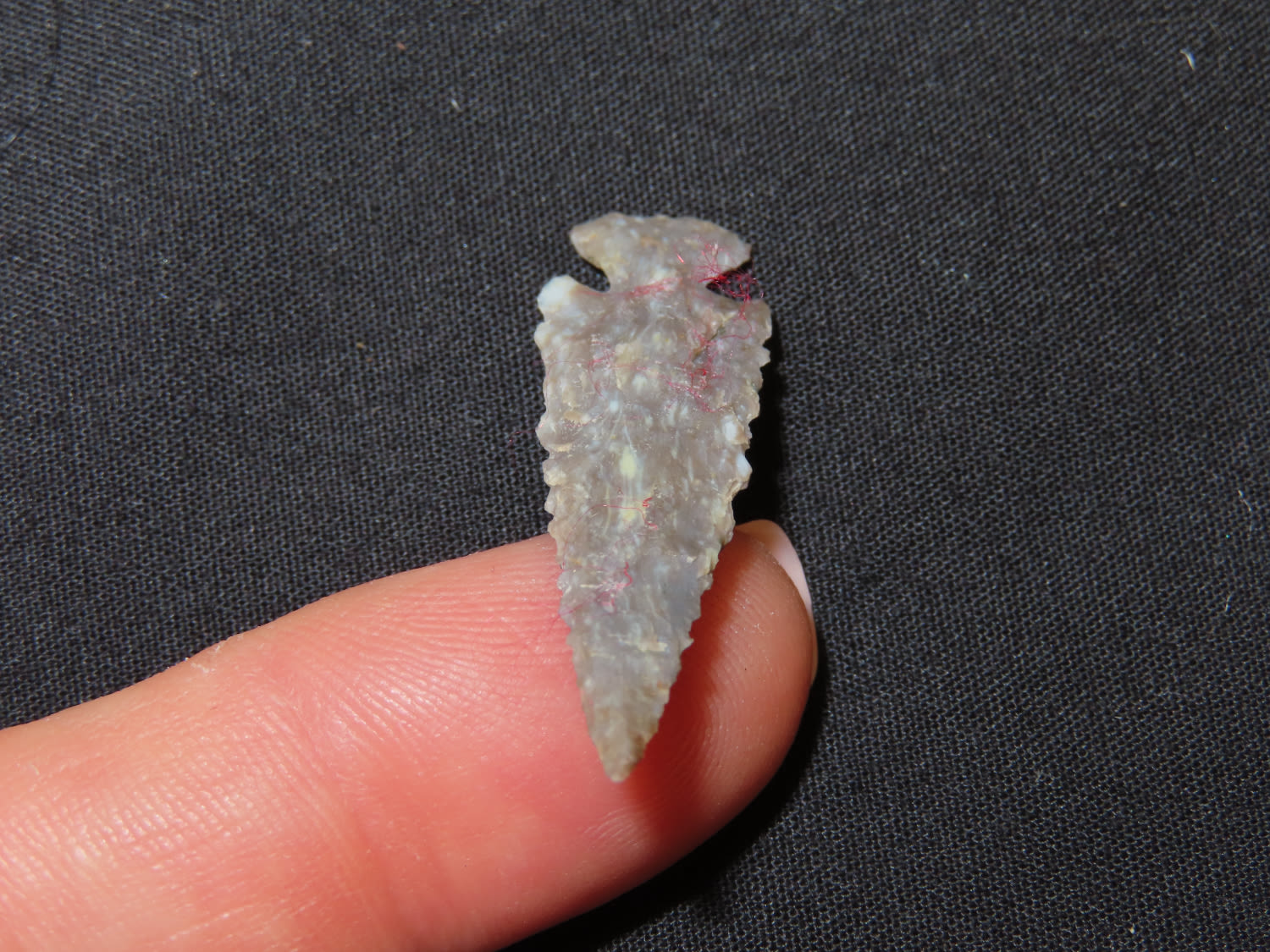 1 3/8″ x 7/16″ Scallorn. Material: Grey chert. From the Steve McCabe Collection, Milan, Sullivan County Missouri. COA: Ryan E. Keele