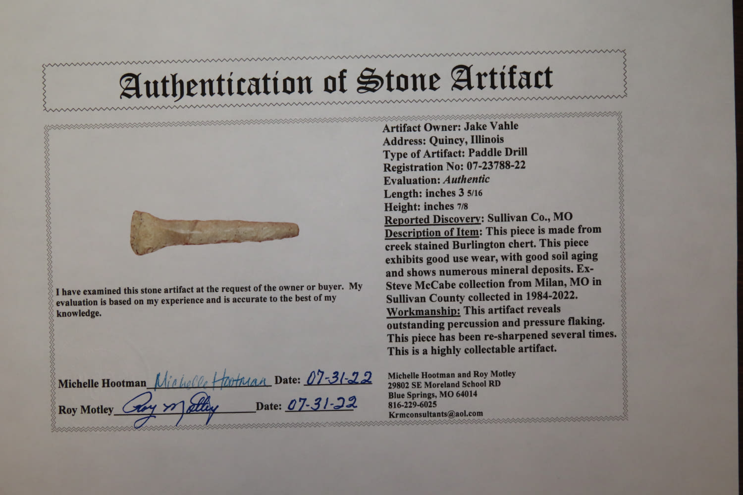 3 1/4″ Paddle Drill. Motley COA. From the Steve McCabe Collection, Milan, Sullivan County Missouri.