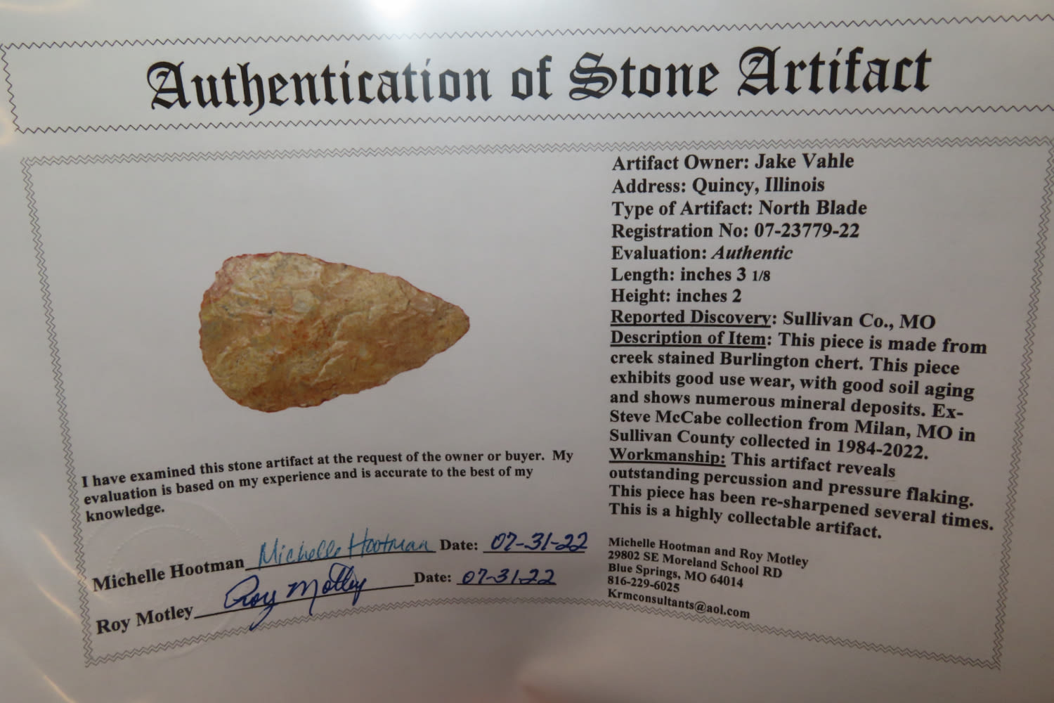 3 1/8" North Blade Motley COA. From the Steve McCabe Collection, Milan, Sullivan County Missouri.