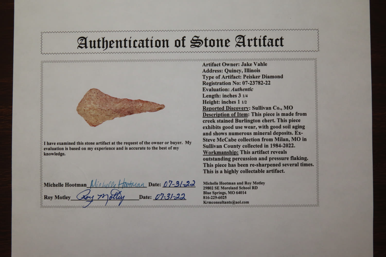 3 1/4″ Piesker Diamond. Motley COA. From the Steve McCabe Collection, MIlan, Sullivan County Missouri