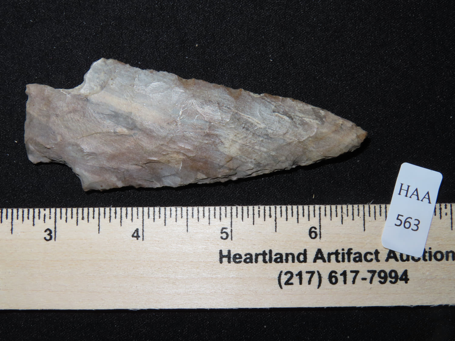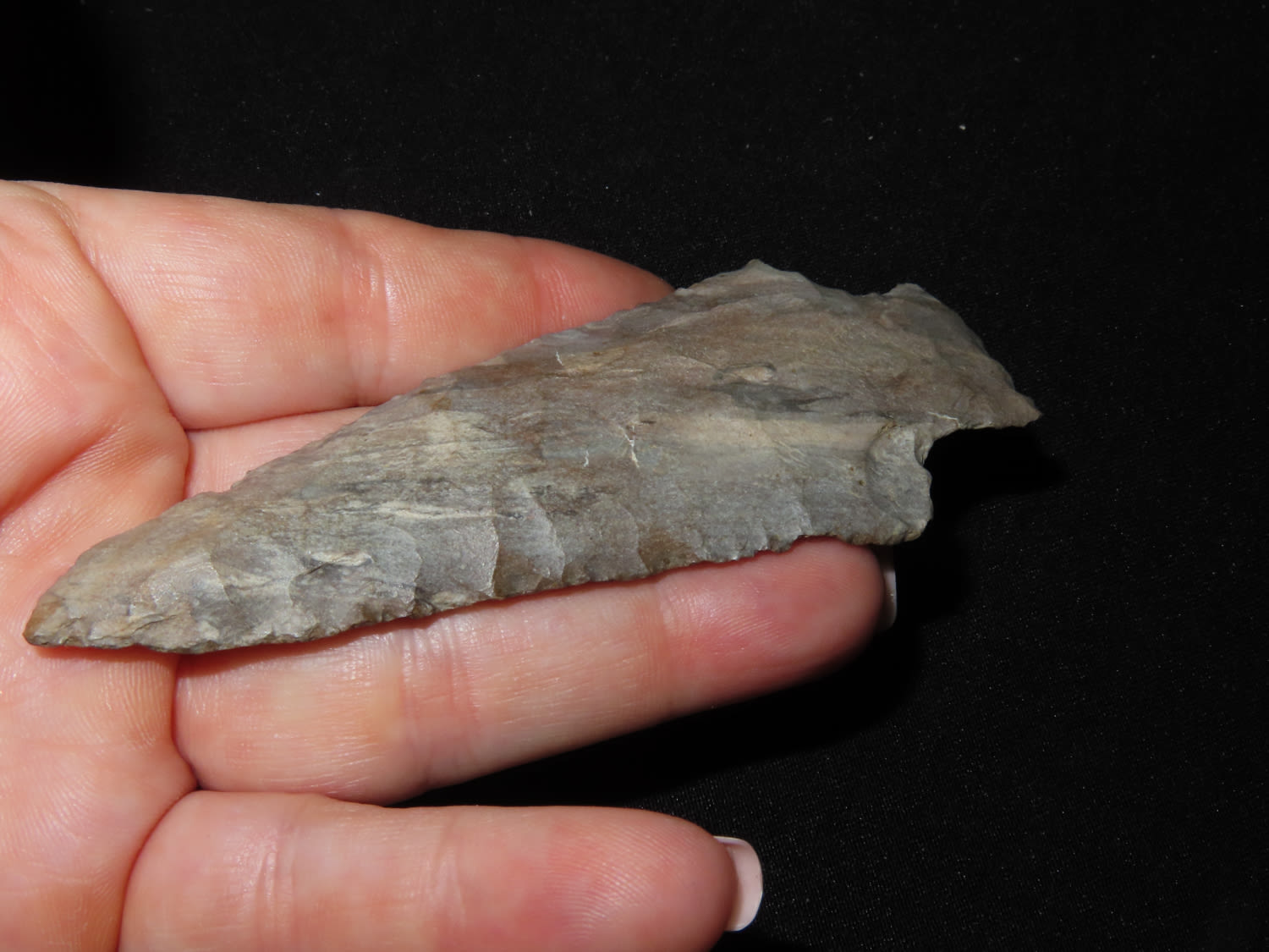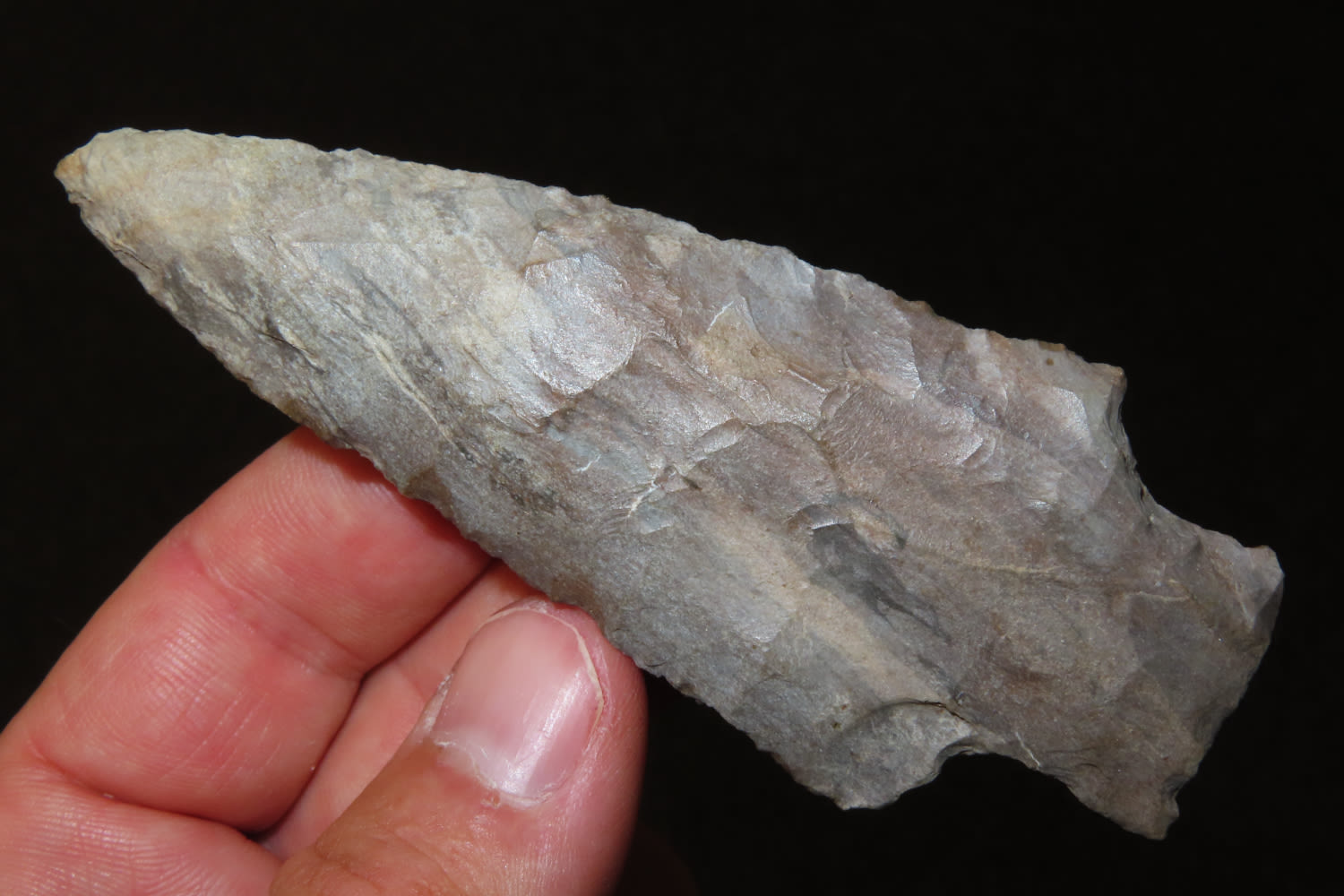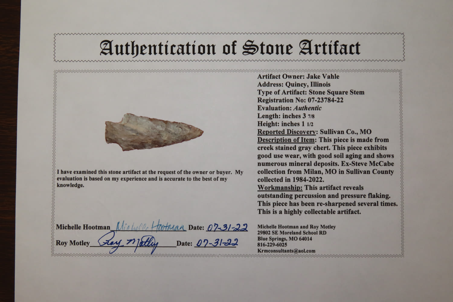 3 7/8″ Stone Square Stem. Super Colorful Stripped Chert. Motley COA. From the Steve McCabe Collection, MIlan, Sullivan County Missouri