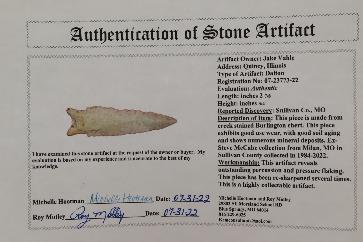 2 3/4″ Fishtail Dalton or Hardin. Motley COA. From the Steve McCabe Collection, MIlan, Sullivan County Missouri