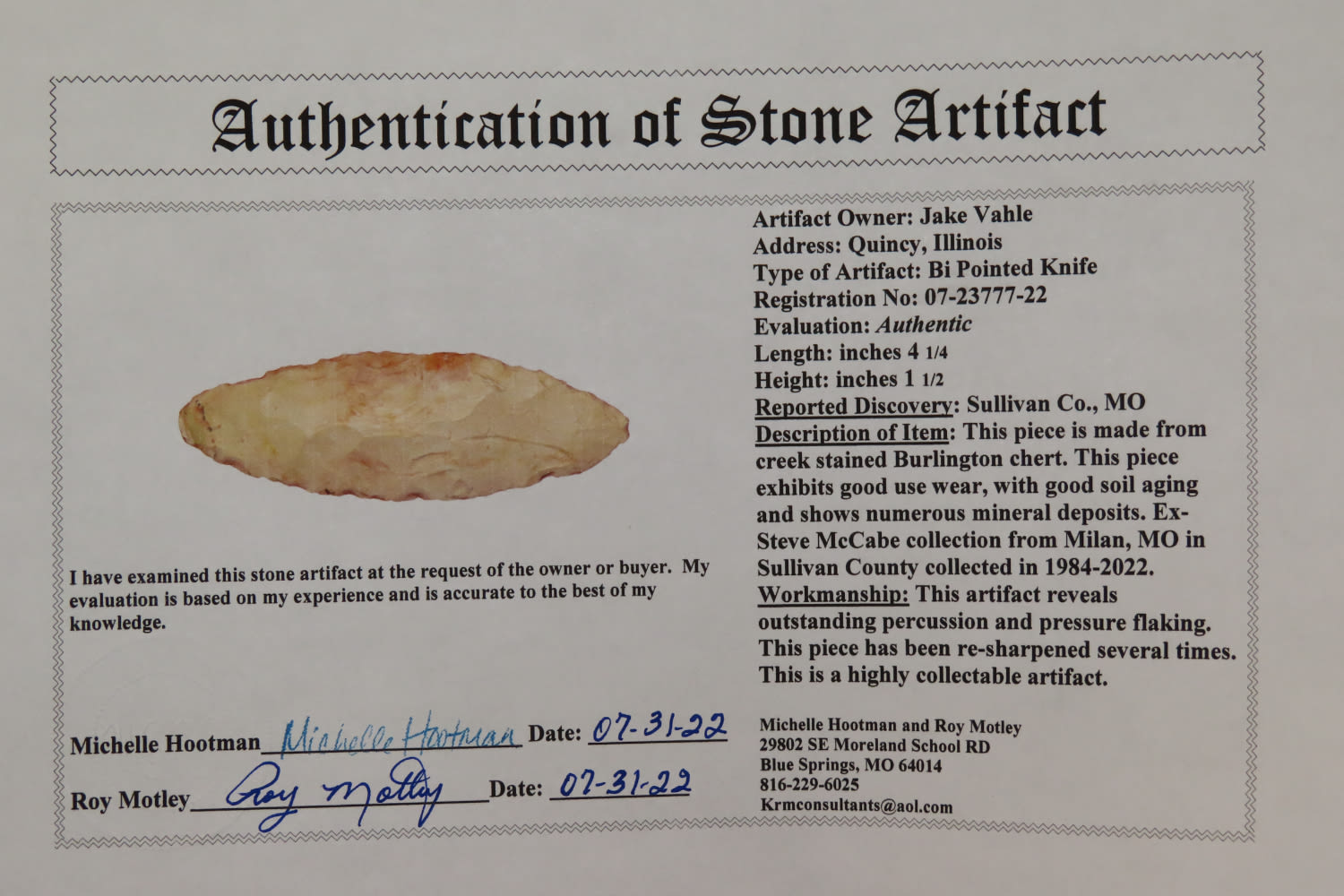 4 1/8″ Ovoid Blade. Motley COA. From the Steve McCabe Collection, MIlan, Sullivan County Missouri
