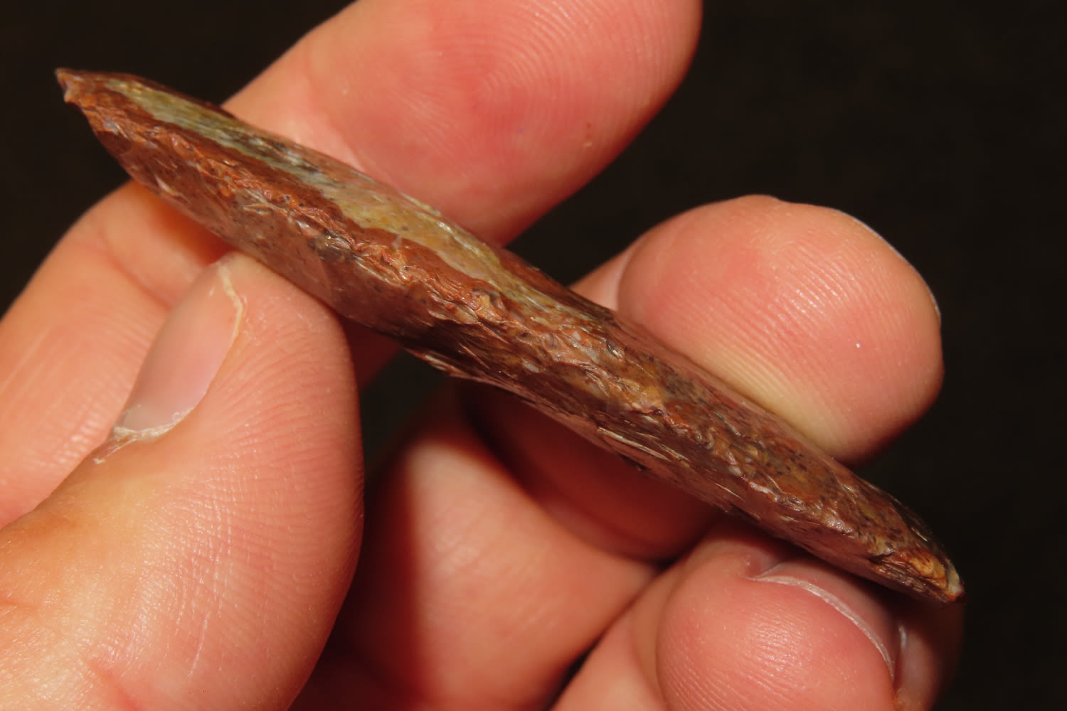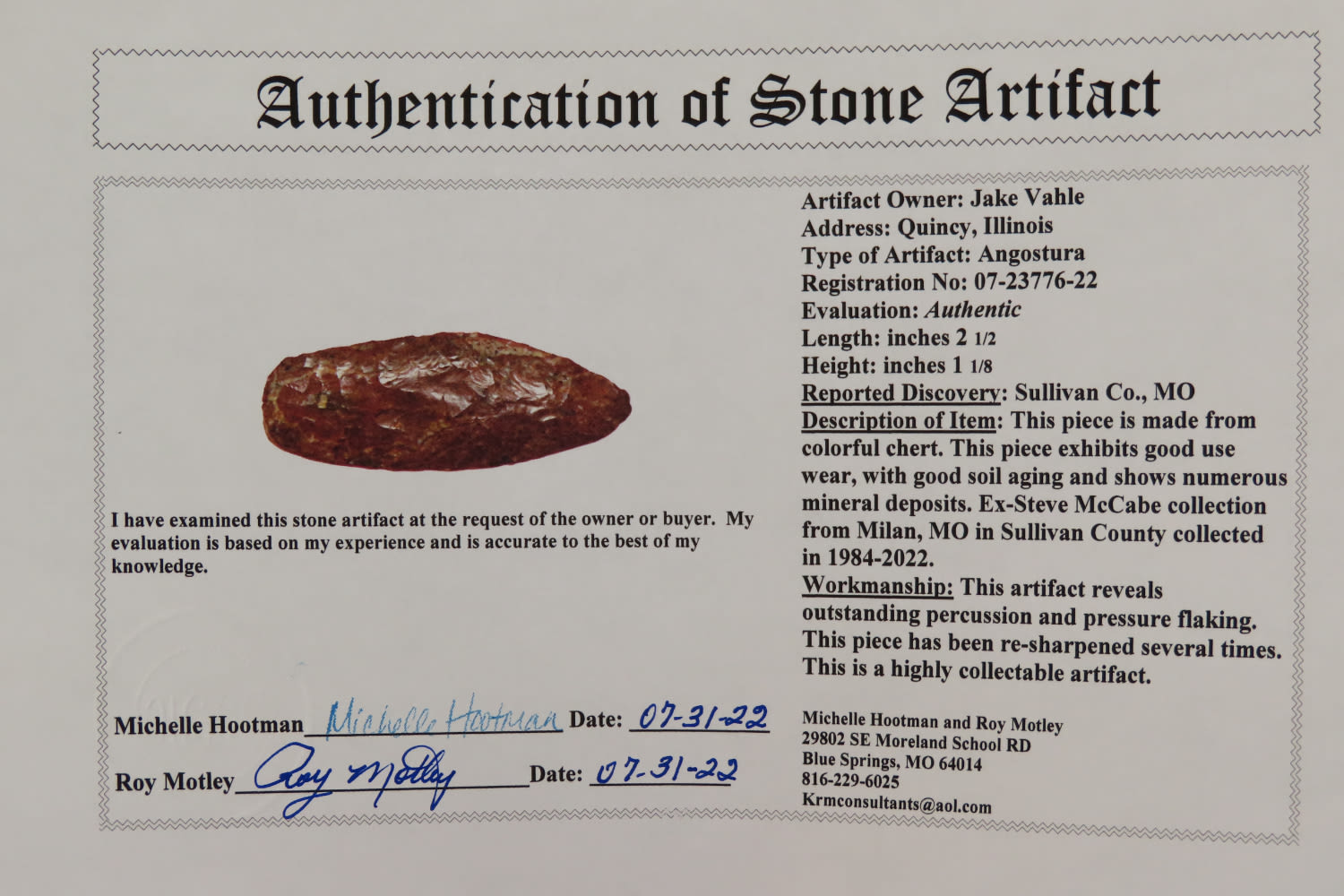 2 1/2″ Agustura, outstanding color and material. Very colorful relic. Motley COA. From the Steve McCabe Collection, MIlan, Sullivan County Missouri