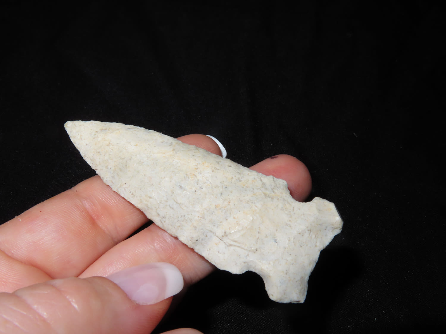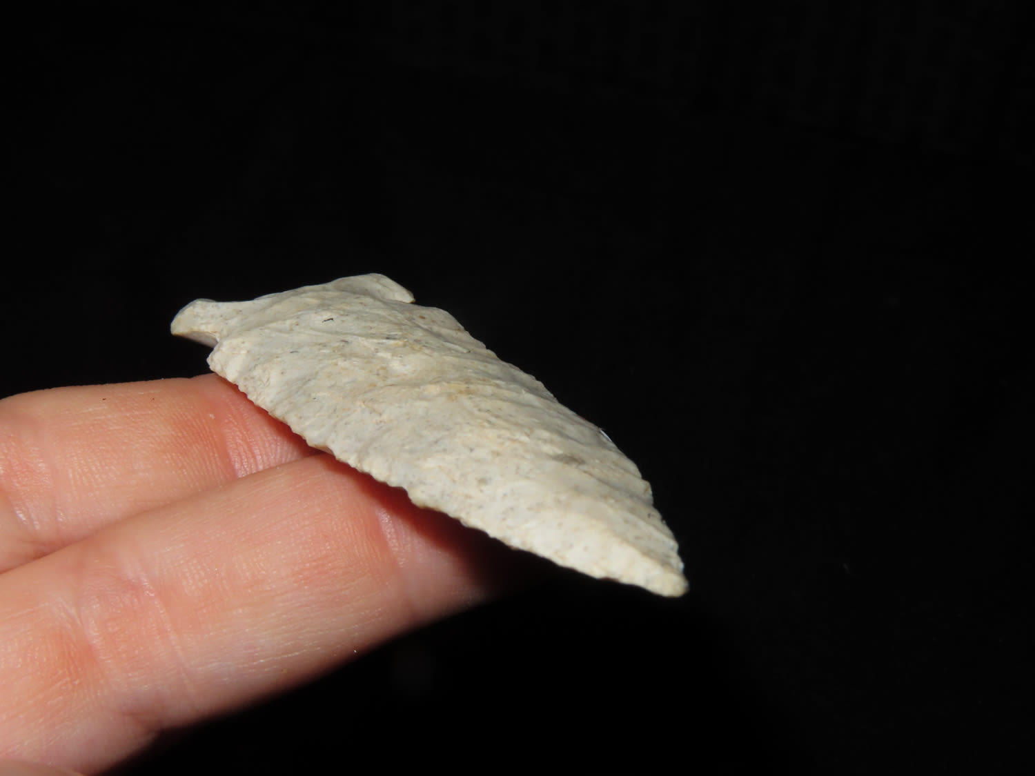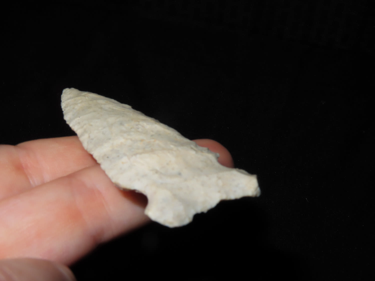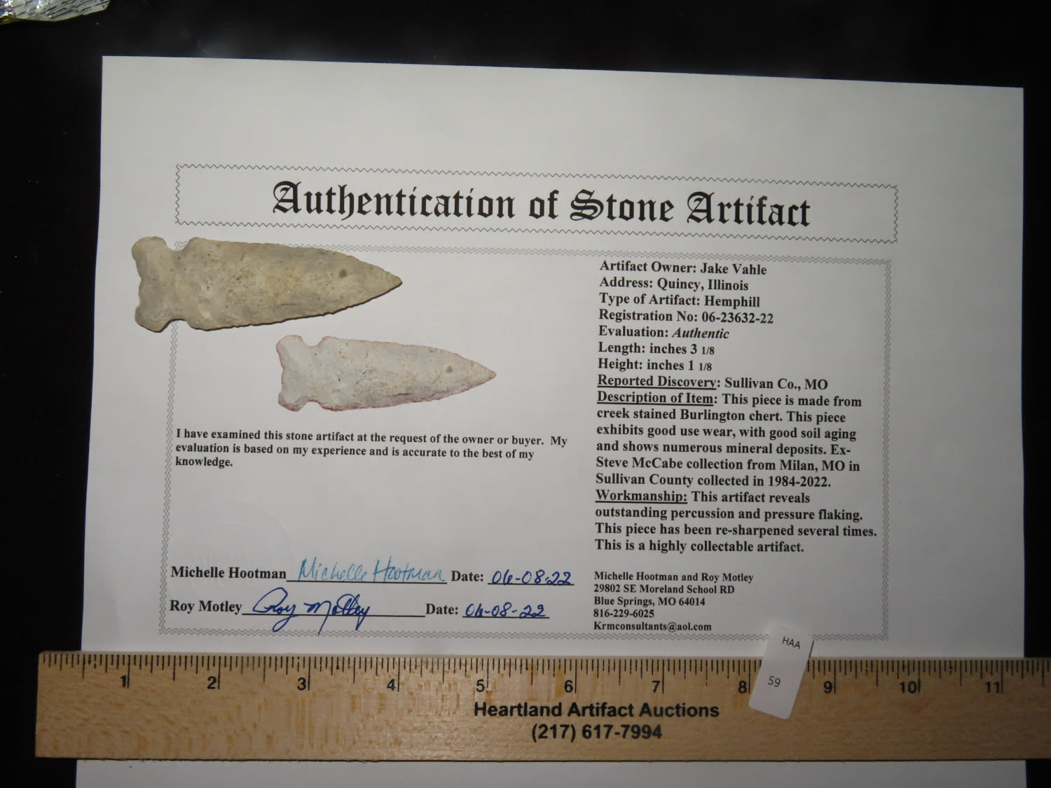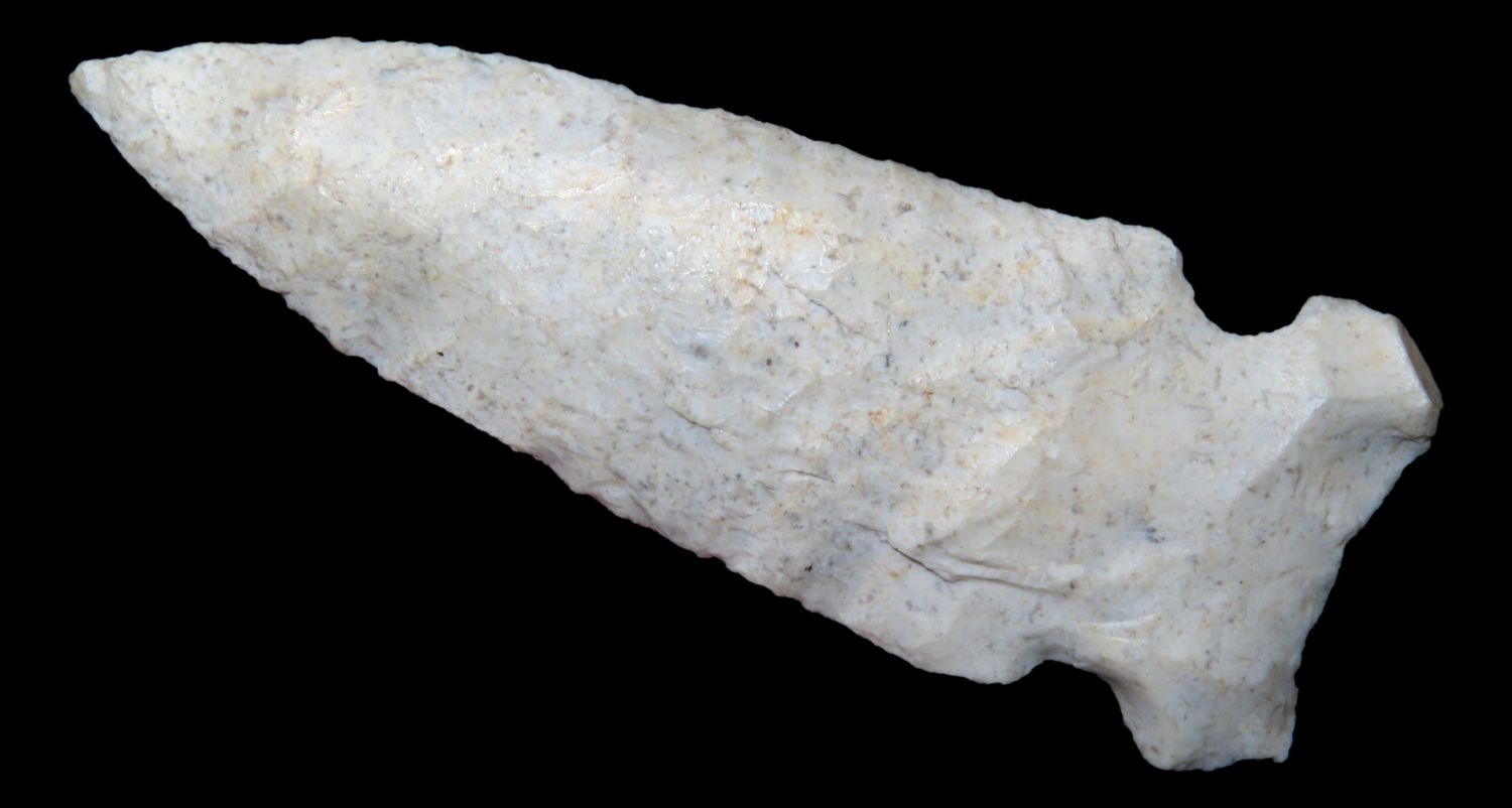 3 1/8″x 1 1/8″ Hemphill. COA Roy Motley. Found in Sullivan County Missouri. From the Steve McCabe Collection, Milan, Sullivan County Missouri. Made from Creek Stained Burlington Chert
