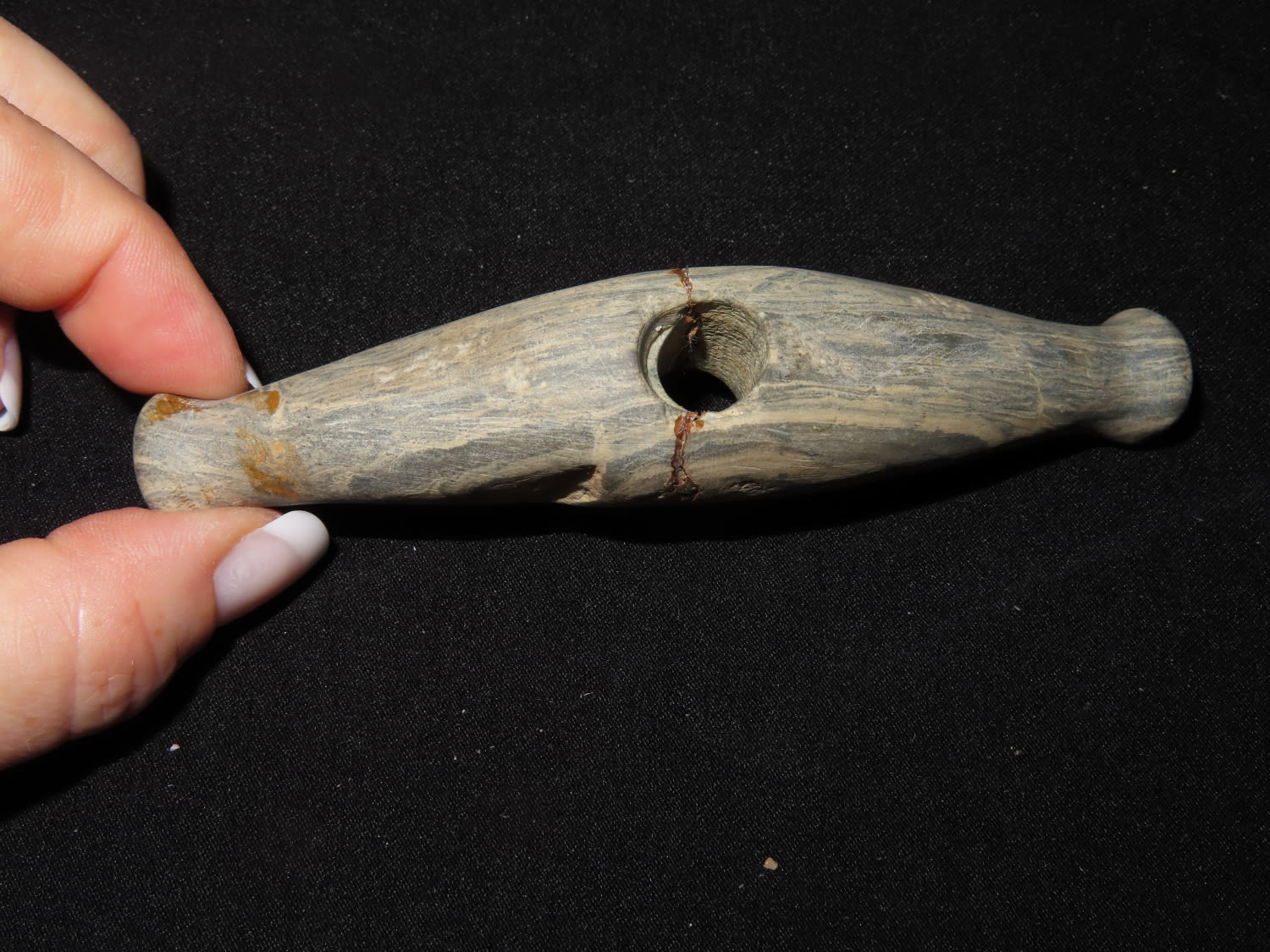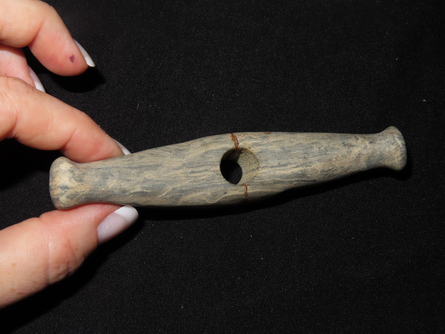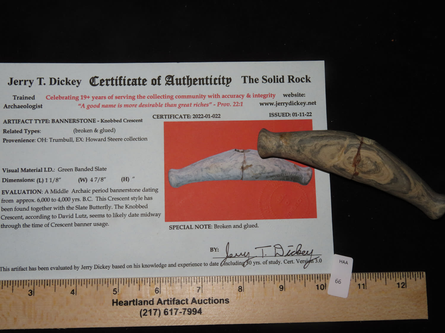 1 1/8" x 4 7/8" Knobbed Crescent Bannerstone. EX Rick Steed Collection. Made from Green Banded Slate (broken and glued). Comes with COA Jerry T. Dickey