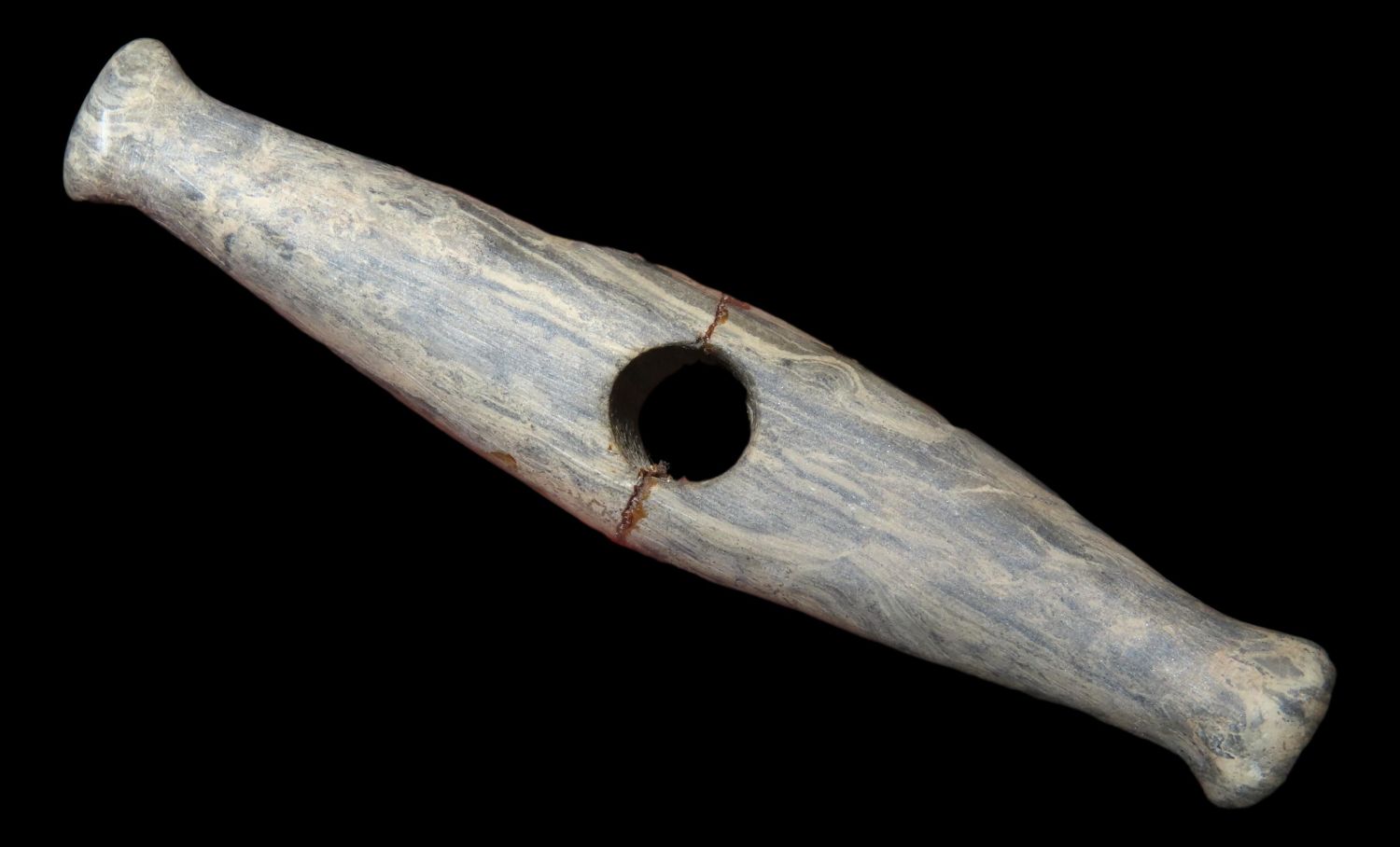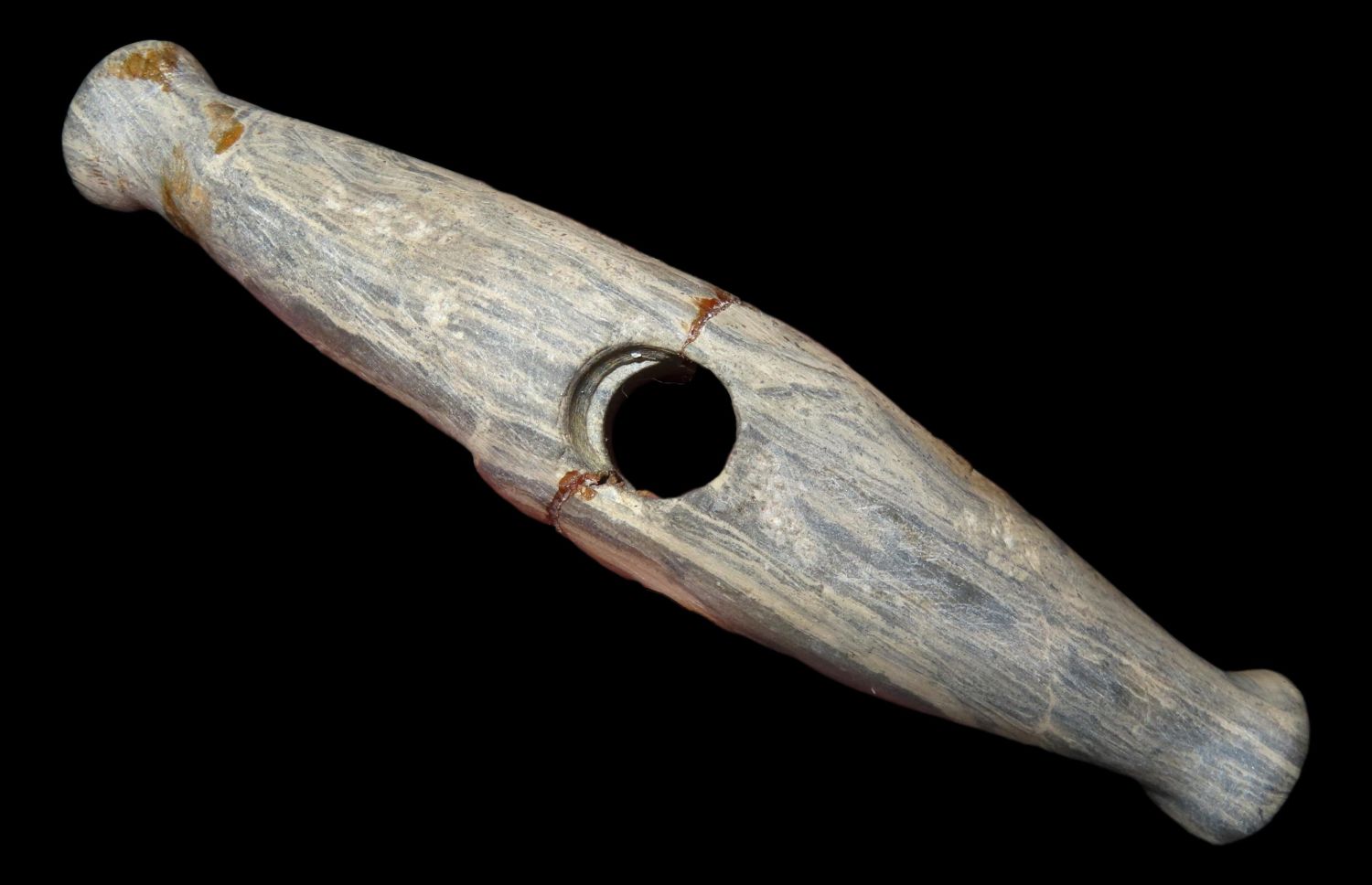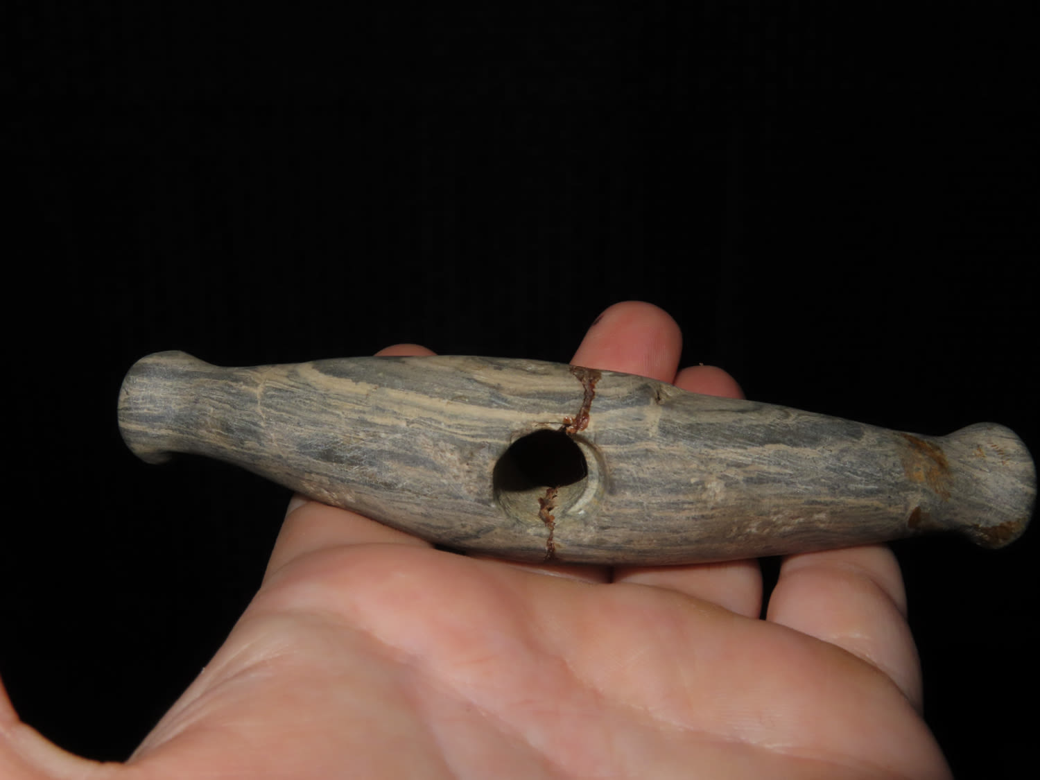 1 1/8" x 4 7/8" Knobbed Crescent Bannerstone. EX Rick Steed Collection. Made from Green Banded Slate (broken and glued). Comes with COA Jerry T. Dickey