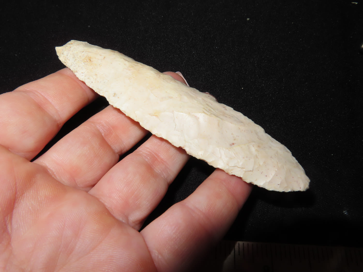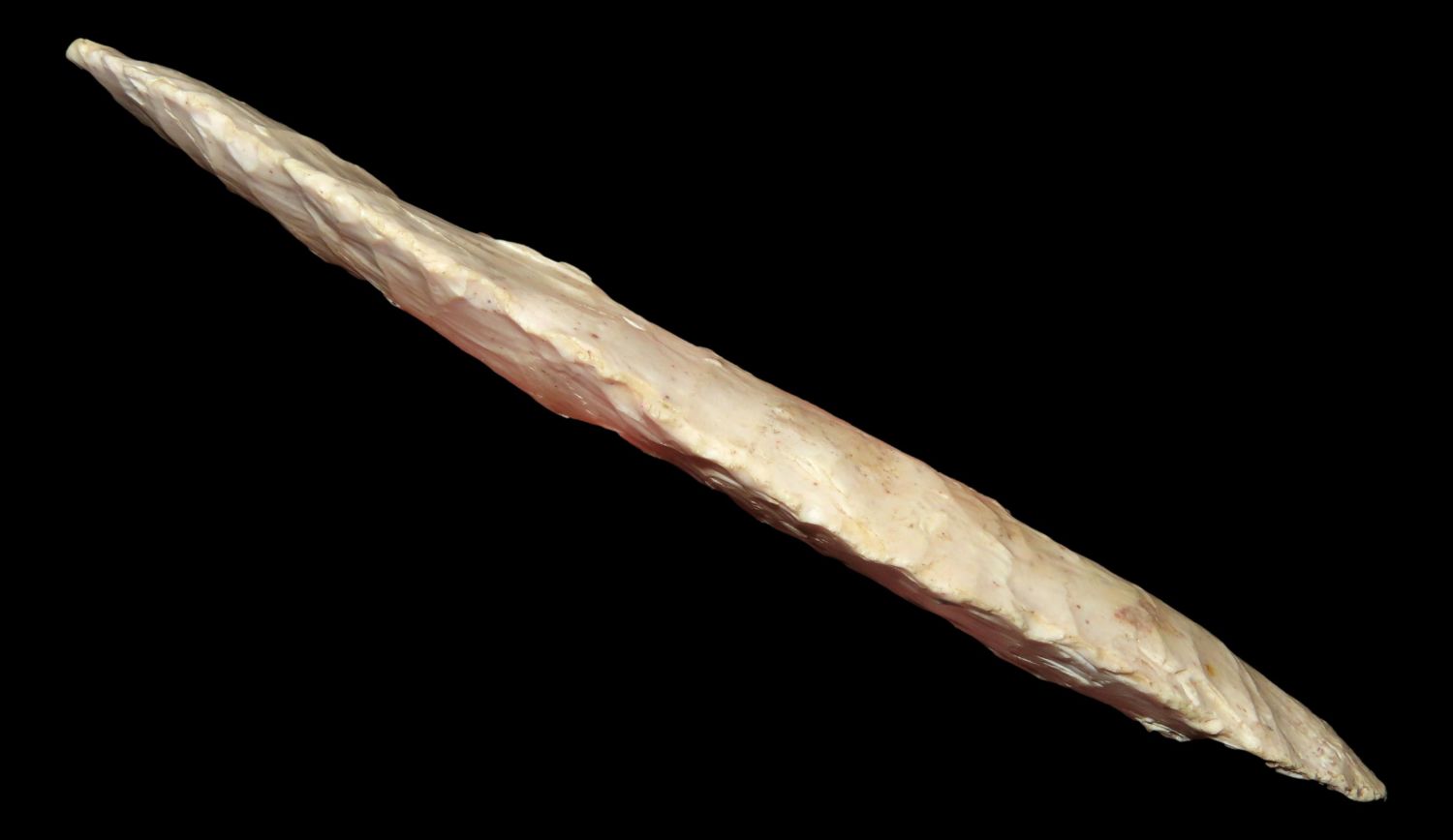 4 7/16 x 1 3/16″ Agate Basin or similar. From the Steve McCabe Collection, Milan, Sullivan County Missouri. COA: Jerry T. Dickey