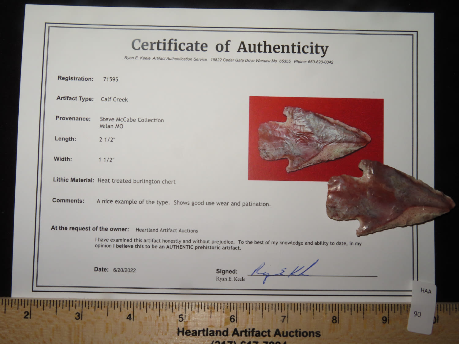 2 1/2″ x 1 1/2″ Calf Creek. COA Ryan E. Keele. From the Steve McCabe Collection, Milan, Sullivan County Missouri. Made from Heat Treated Burlington Chert