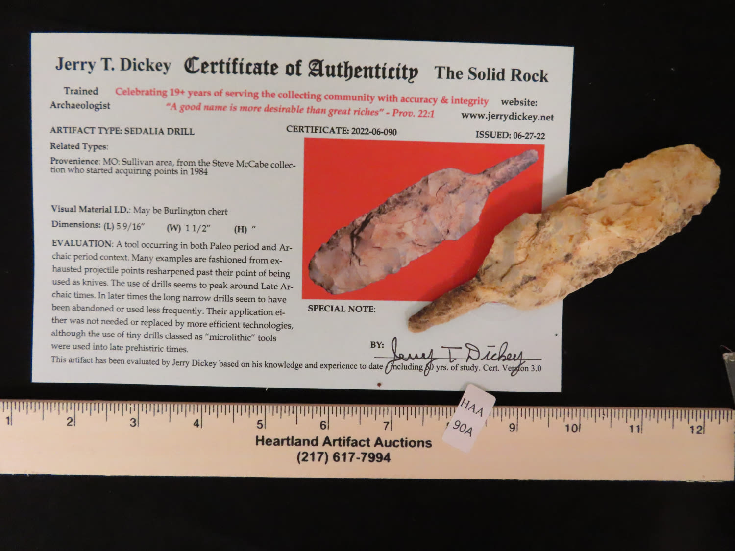 5 9/16″ x 1 1/2″ Sedalia Drill. From the Steve McCabe Collection, Milan, Sullivan County Missouri. COA: Jerry T. Dickey