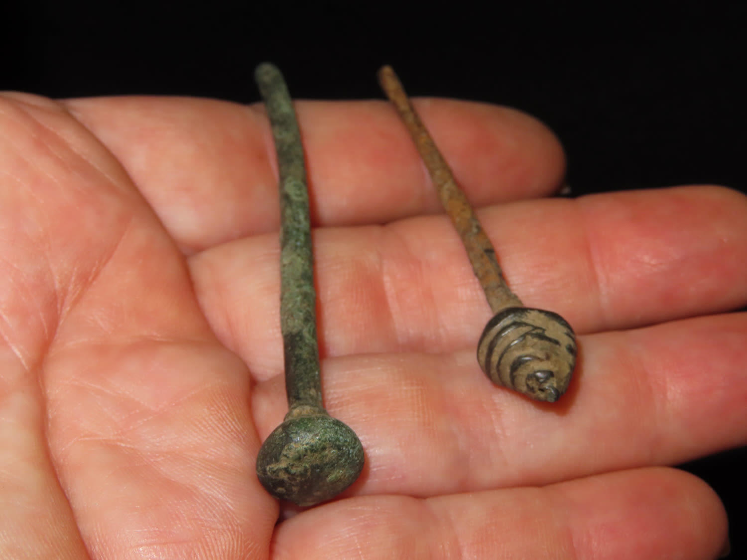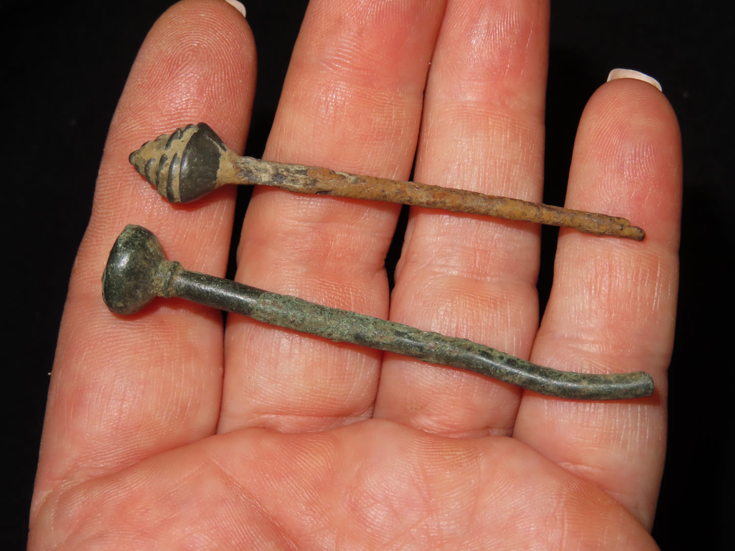 PAIR OF ANCIENT ROMAN BRONZE AGE DECORATIVE VIKING HAIRPIN, CLOAK PIN, AWL, TOOL, WEAPON