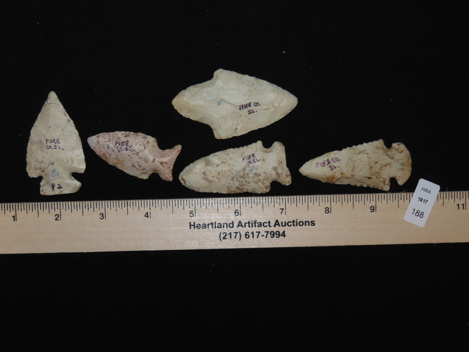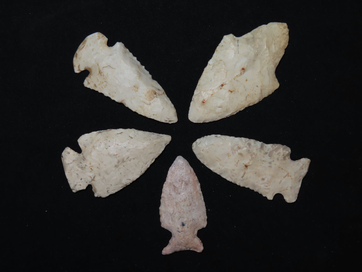 (5) Five Arrowheads with tips rechipped. Pike / Brown CO., Illinois. EX collection John Hannant