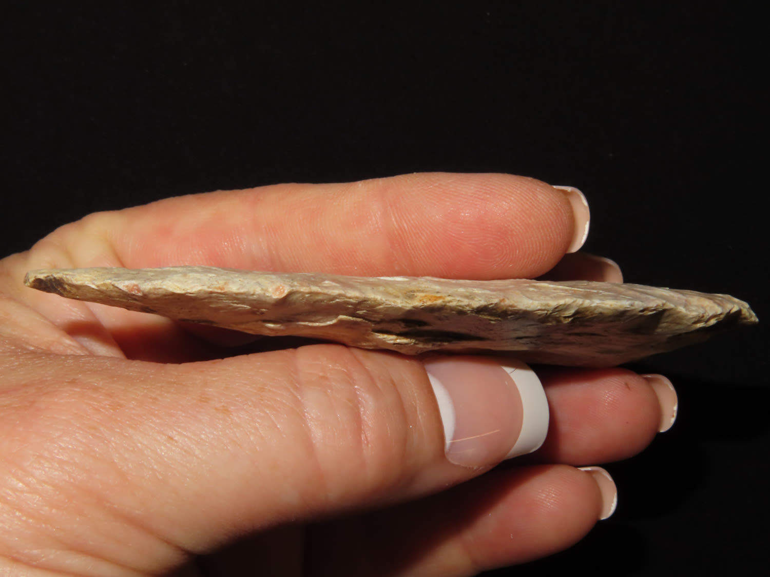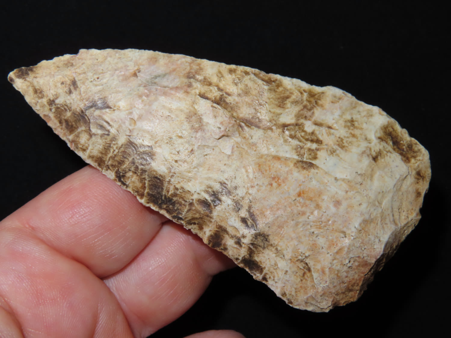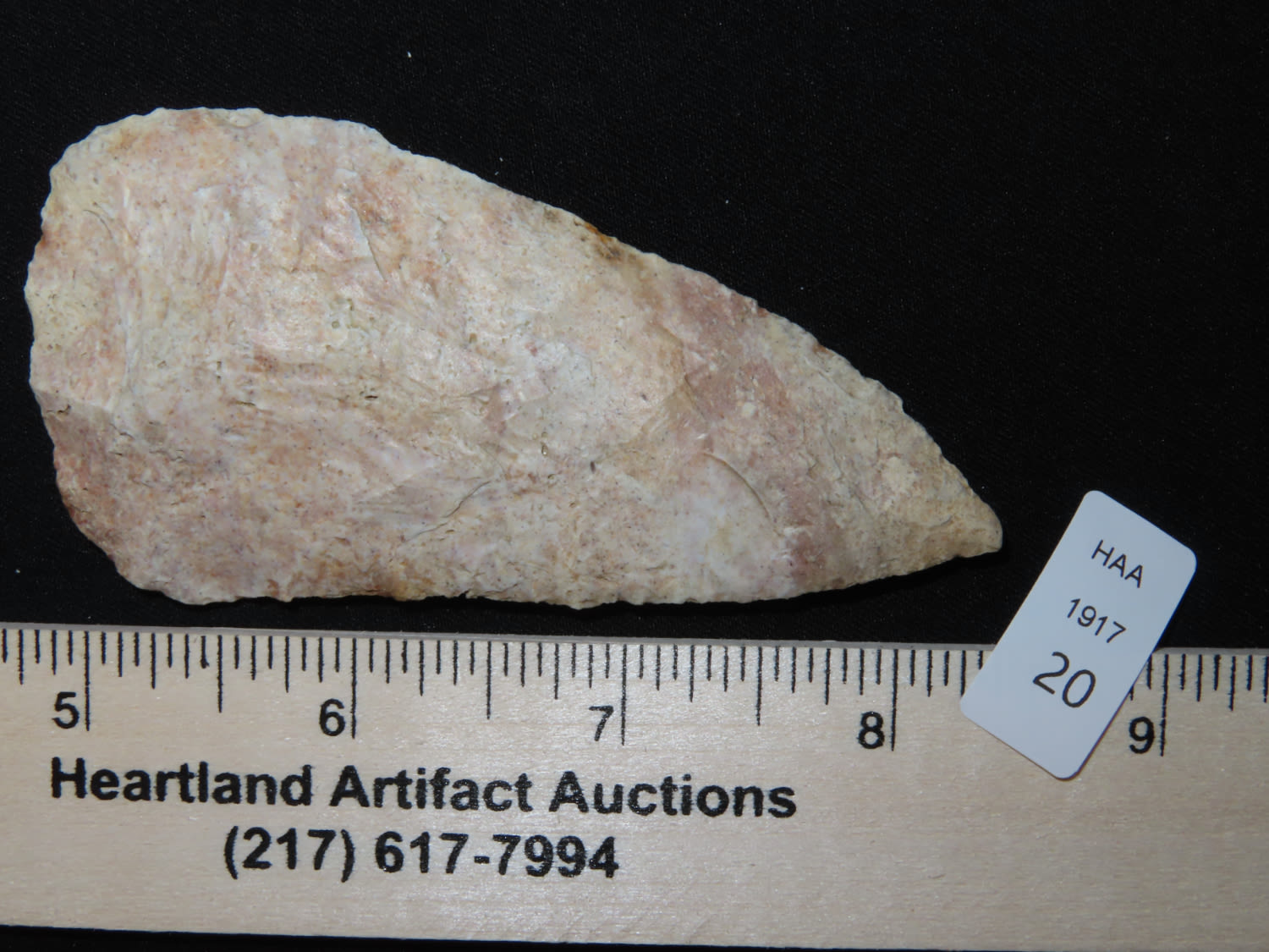 3 5/8″ Archaic Knife. Location: Brown CO., Illinois. Made from Burlington Chert. EX collection of John Hannant