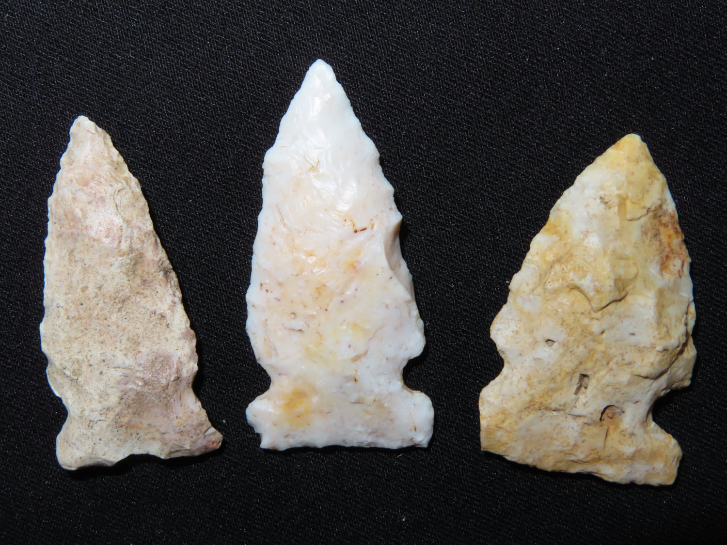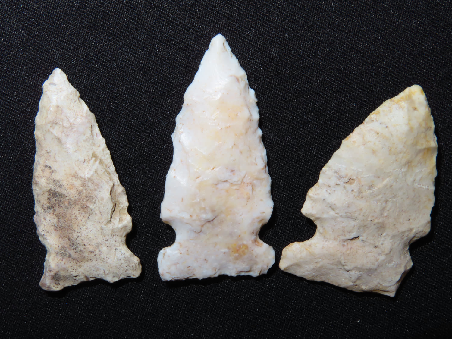Grouping of three Robinson Arrowheads. Found in Brown CO., IL. Made of Burlington. EX collection of John Hannant