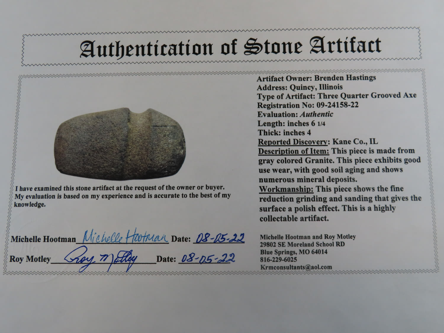 6 1/4″ 3/4 Groove Axe, Motley COA. Found in Kane Co Illinois