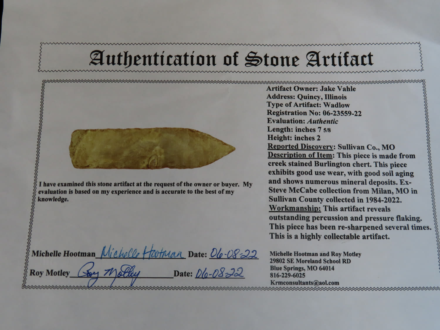 7 1/8″ Wadlow, Motley COA, From the Steve McCabe Collection, Milan, Sullivan County Missouri