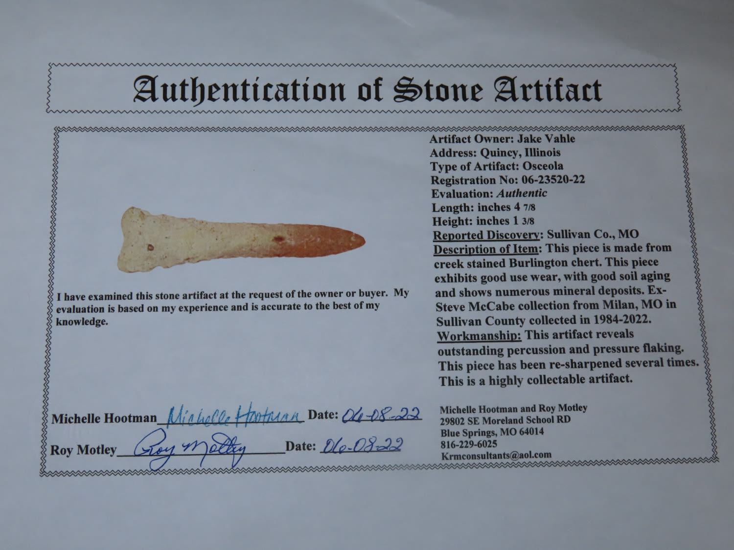 4 7/8″ Osceola, Motley COA, From the Steve McCabe Collection, Milan, Sullivan County Missouri