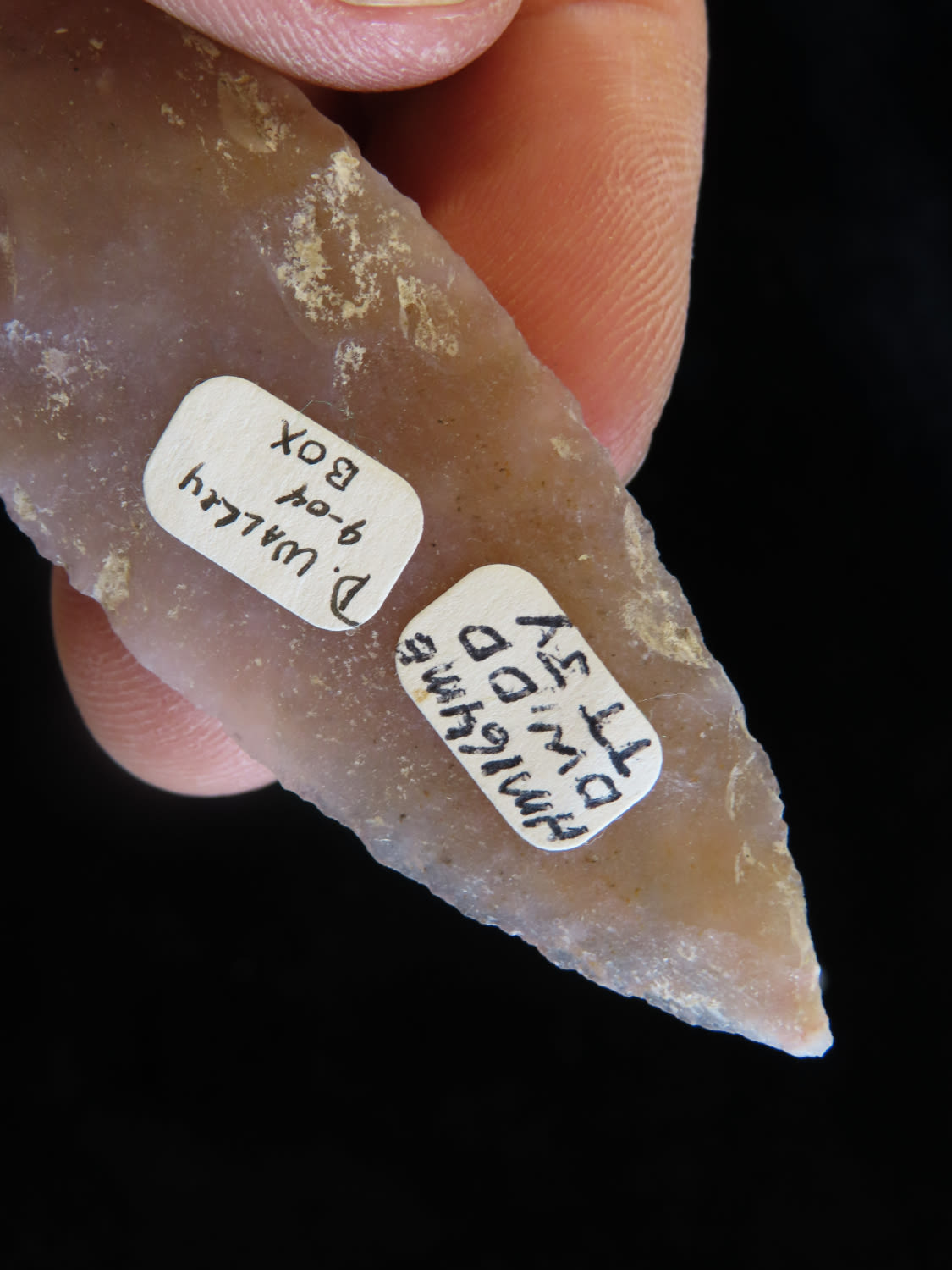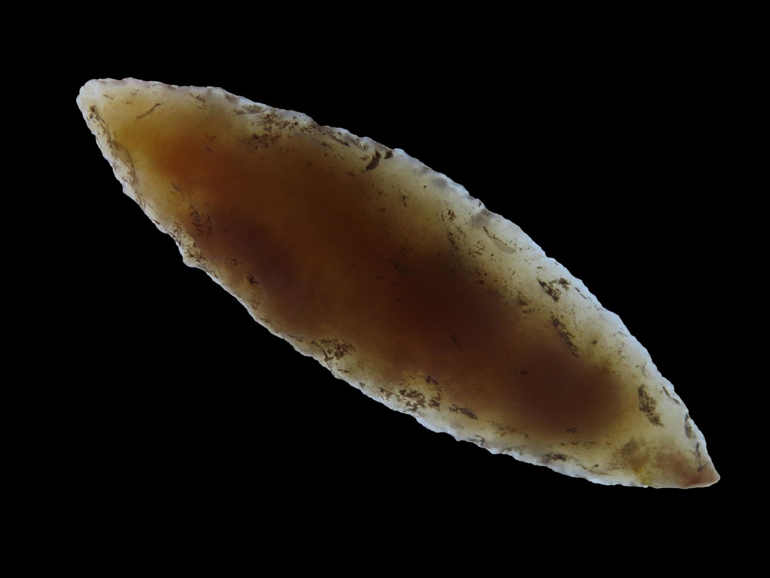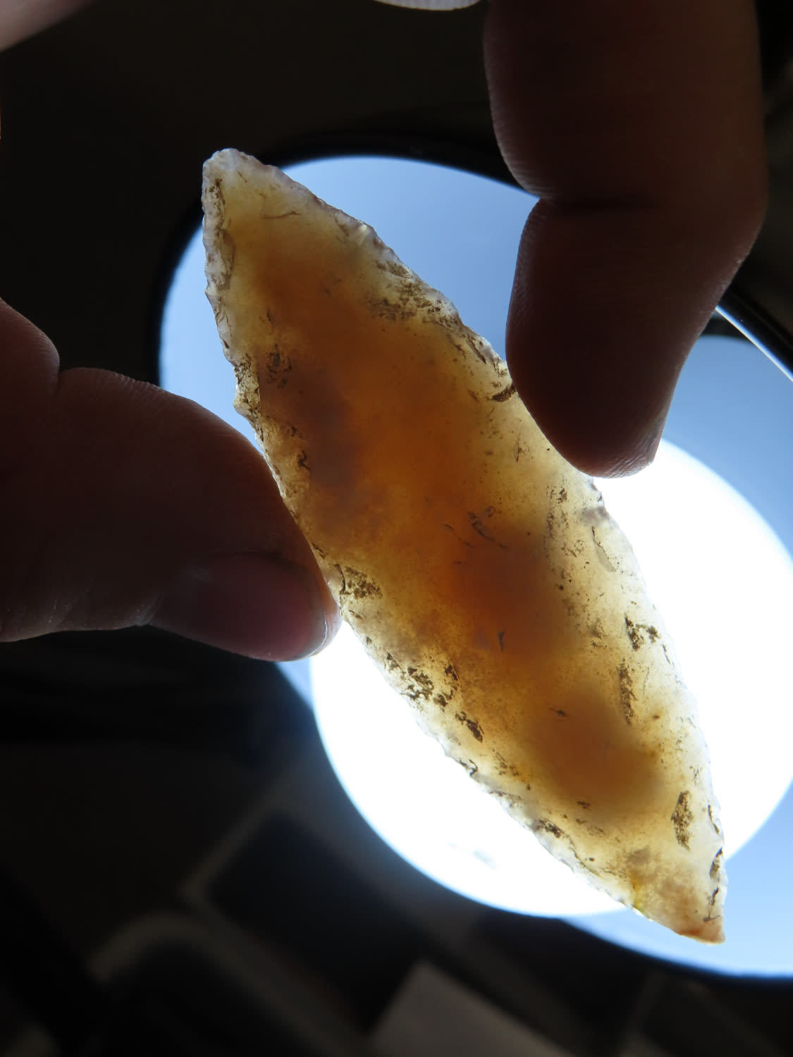 3 1/8″ Bi-hyphen Point Eccentric Flint Effigy, semi trranslucent chert, Mayan found in Belize EX. Herb Mangold / Tim Terwelp collection